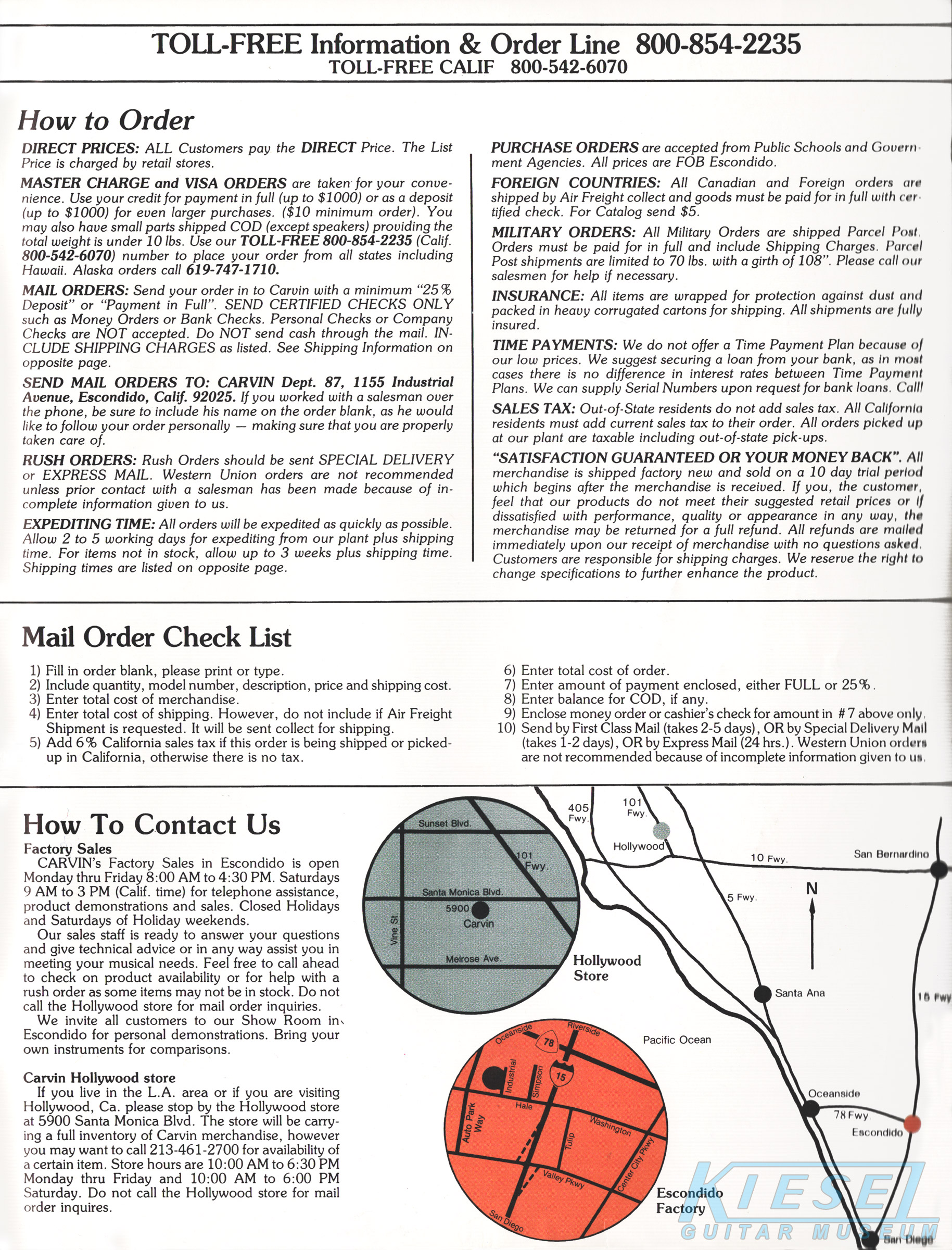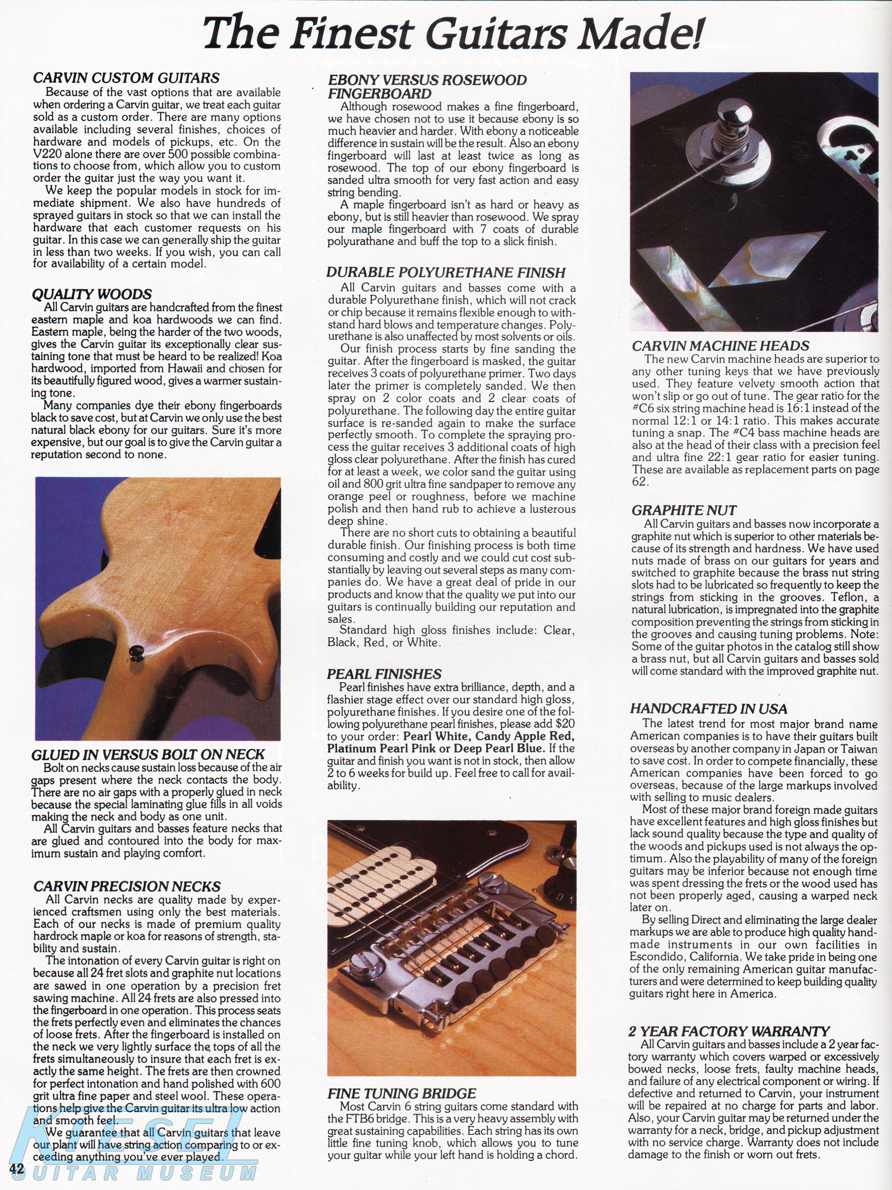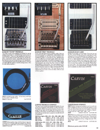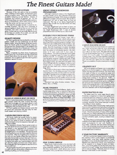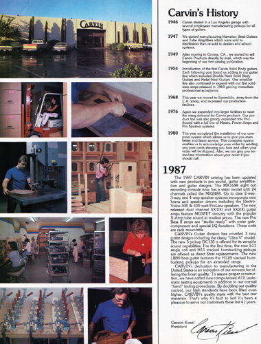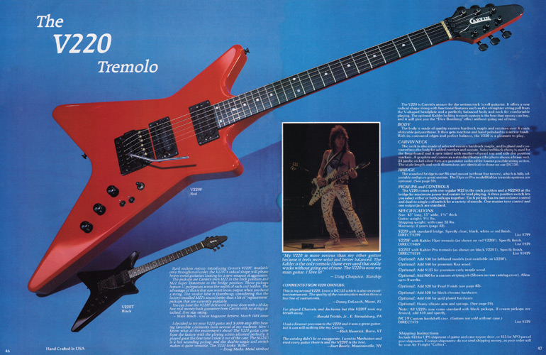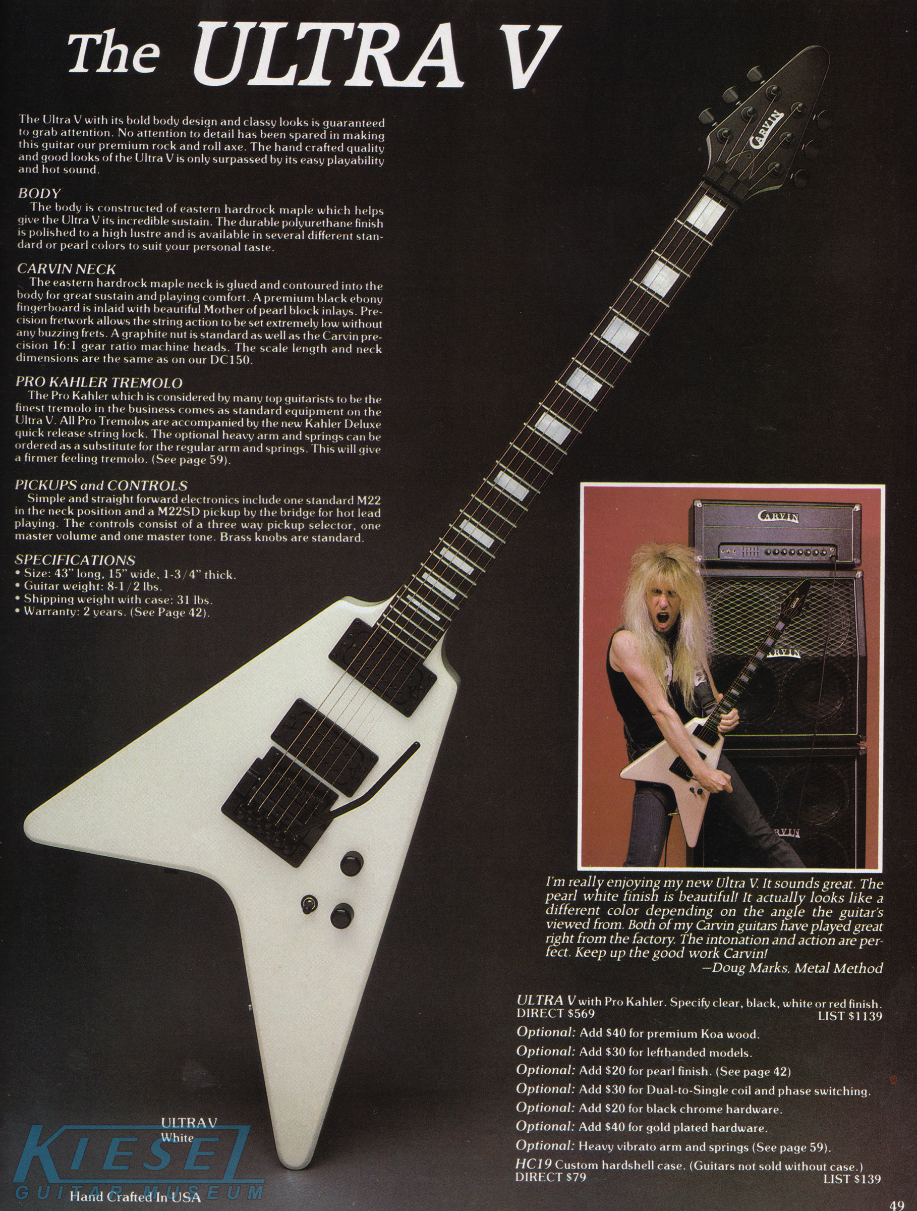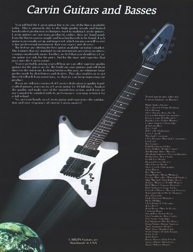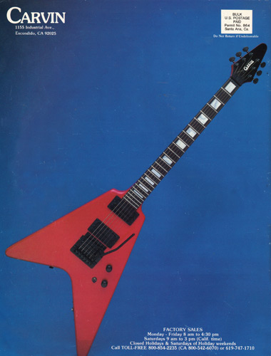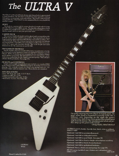 The back cover of the '87 catalog featured one of the new models, the Ultra V. As in 1986, the catalog was printed on high-quality paper, which showed off the new colors vividly, and the cover itself was heavy card stock. The first-generation Ultra V was a totally unique instrument. It took some design cues from the V220, as well as the Gibson Flying V and Jackson RR models, but had a unique and classy shape that still looks fresh today. The body and neck was constructed from eastern hardrock maple, as were all Carvins of the era, and the ebony fingerboard way inlaid with standard mother-of-pearl block inlays. Electronics consisted of an M22 in the neck position, and an M22SD in the bridge position, with single volume and tone controls and 3-way pickup selector. The Kahler Pro tremolo was standard. Base price of the Ultra V was $569. Koa wood was available for $40. Pearl finishes were available for $20. Black chrome hardware was $20, and gold hardware was $40. Dual-to-single coil and phase switching could be added for $30. It was even available as a lefty for an additional $30. The HC19 hardshell case was $79.