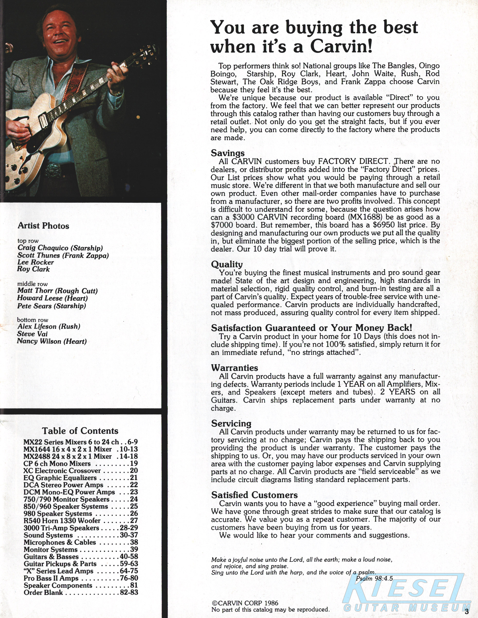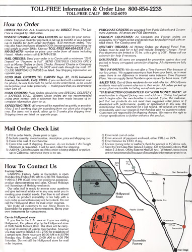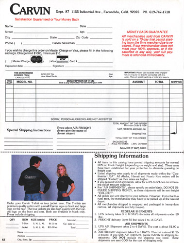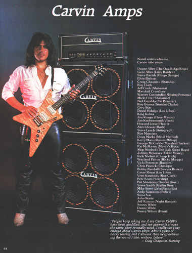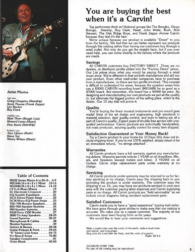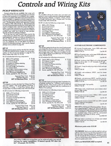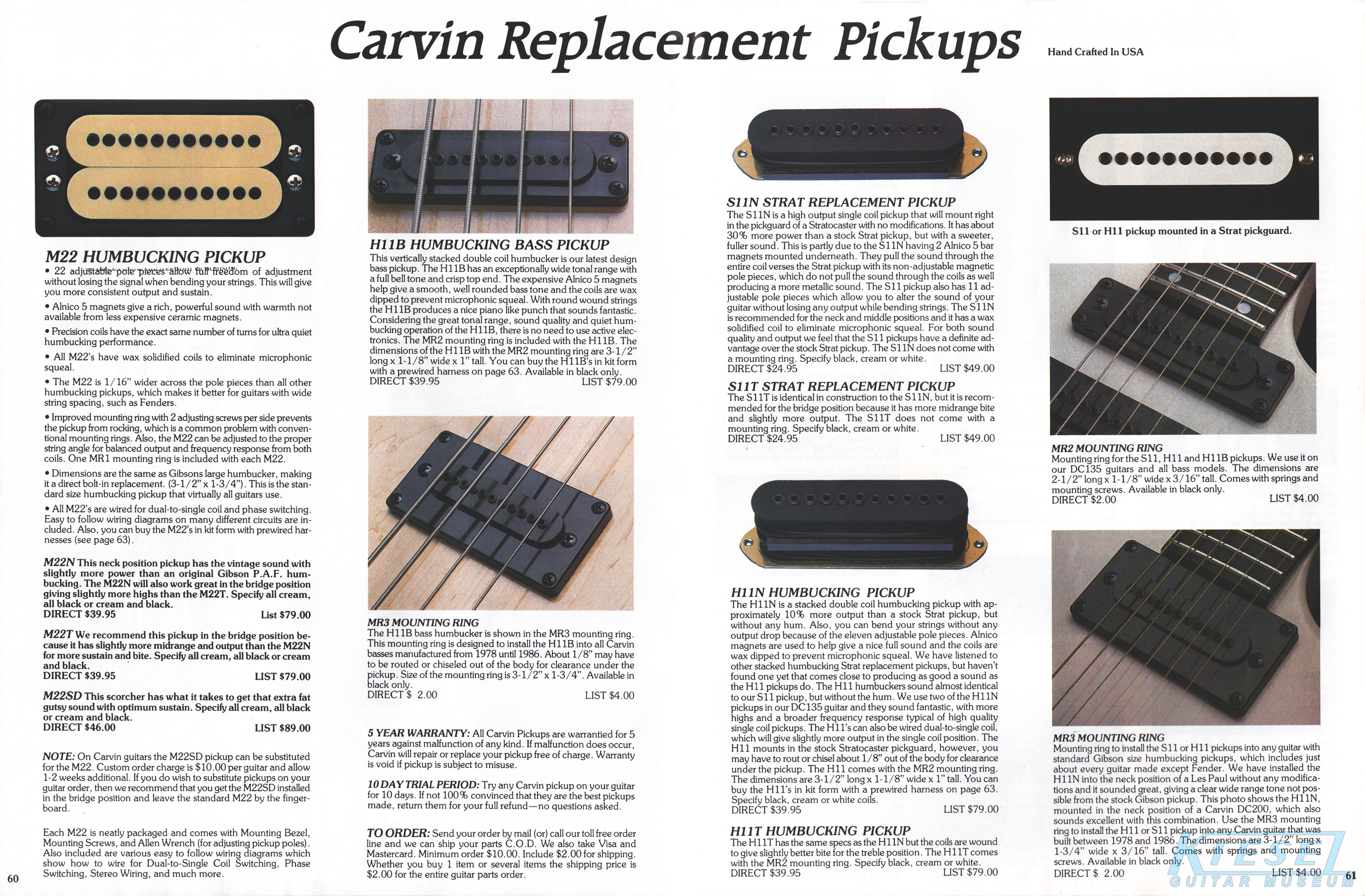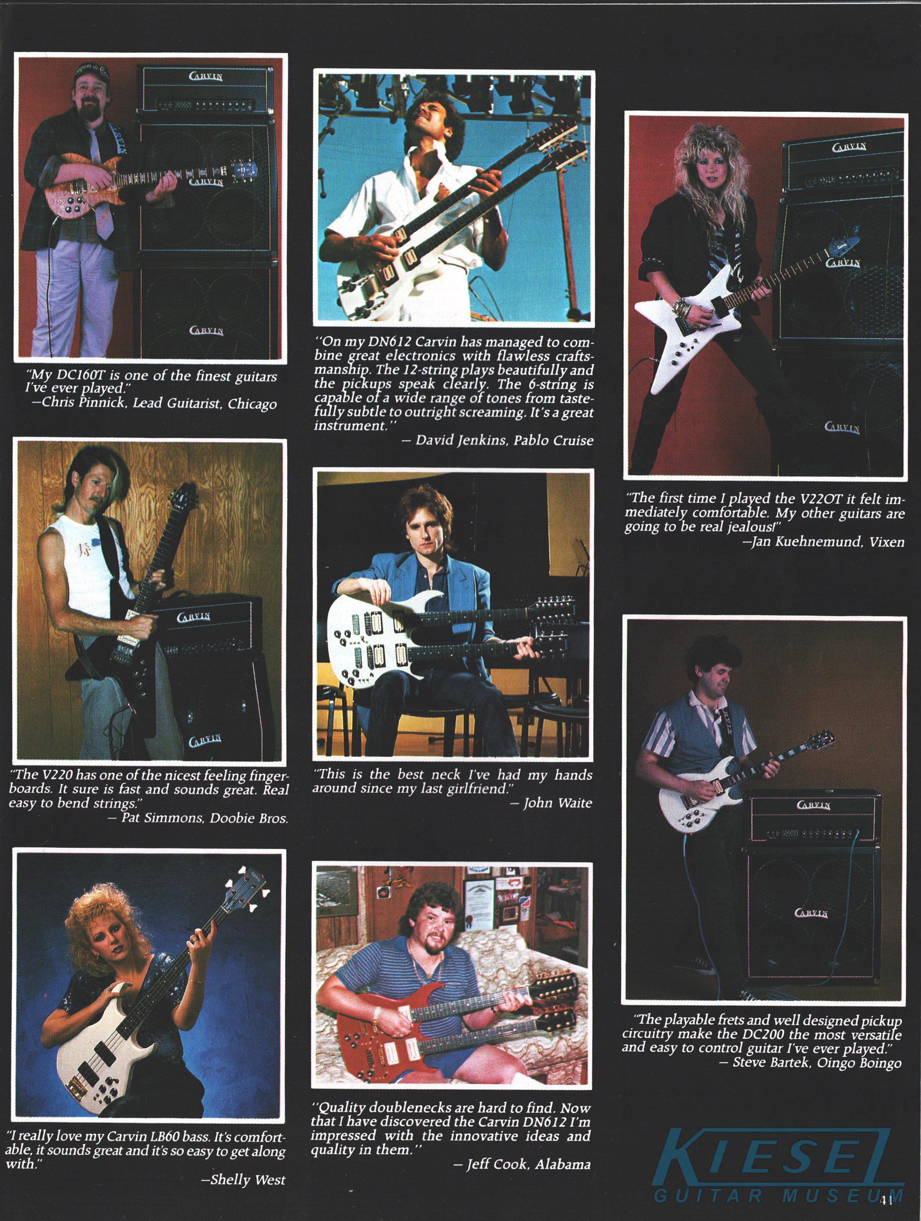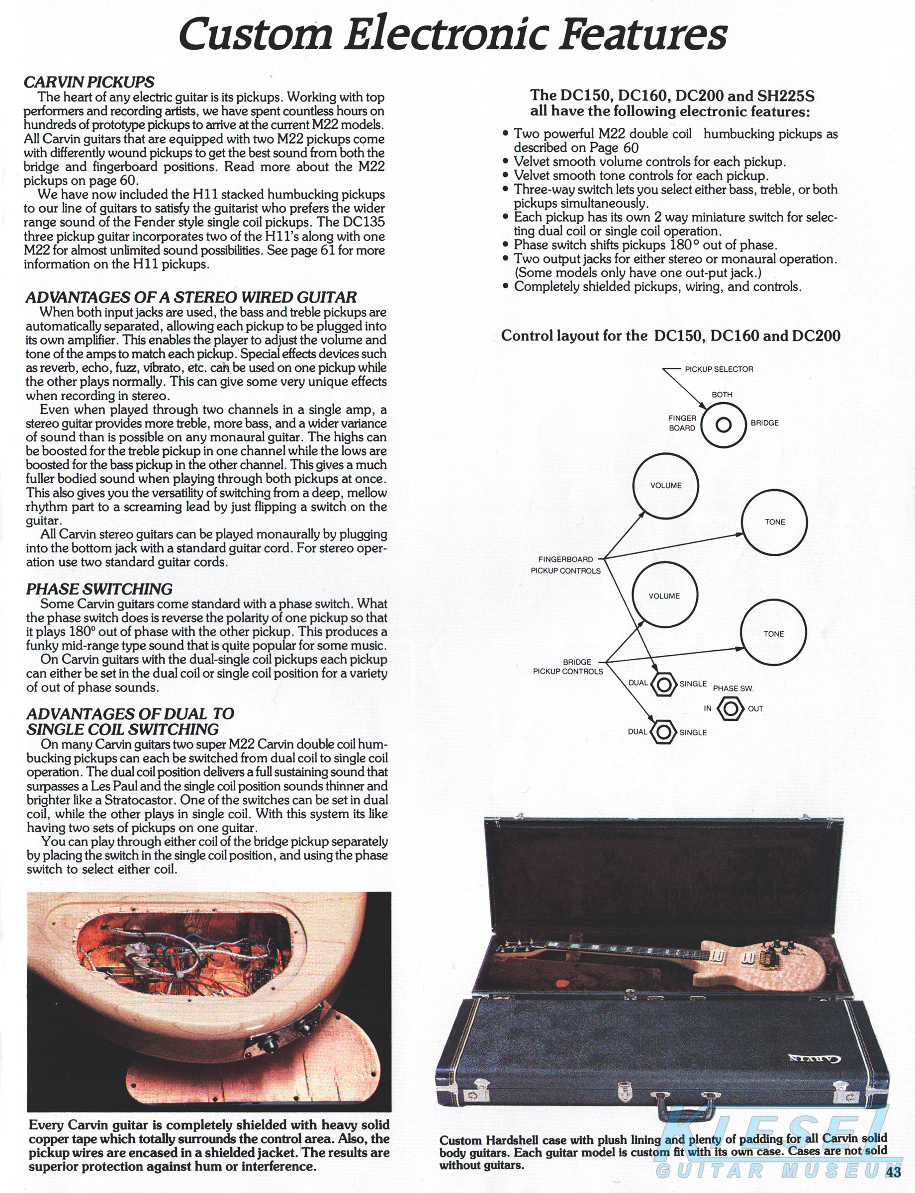 The back cover of the '87 catalog featured one of the new models, the Ultra V. As in 1986, the catalog was printed on high-quality paper, which showed off the new colors vividly, and the cover itself was heavy card stock. The first-generation Ultra V was a totally unique instrument. It took some design cues from the V220, as well as the Gibson Flying V and Jackson RR models, but had a unique and classy shape that still looks fresh today. The body and neck was constructed from eastern hardrock maple, as were all Carvins of the era, and the ebony fingerboard way inlaid with standard mother-of-pearl block inlays. Electronics consisted of an M22 in the neck position, and an M22SD in the bridge position, with single volume and tone controls and 3-way pickup selector. The Kahler Pro tremolo was standard. Base price of the Ultra V was $569. Koa wood was available for $40. Pearl finishes were available for $20. Black chrome hardware was $20, and gold hardware was $40. Dual-to-single coil and phase switching could be added for $30. It was even available as a lefty for an additional $30. The HC19 hardshell case was $79.