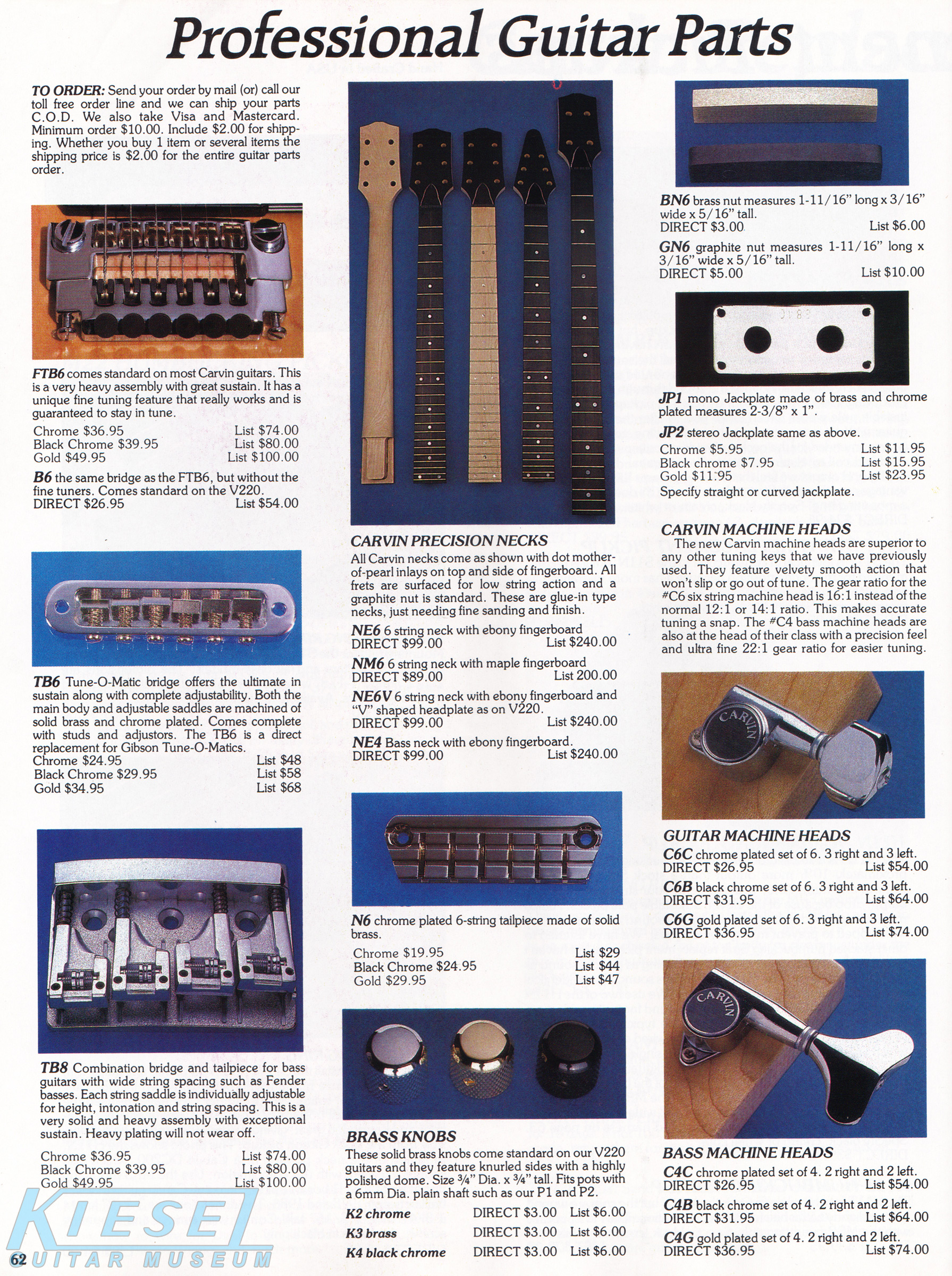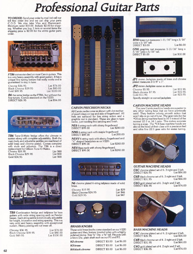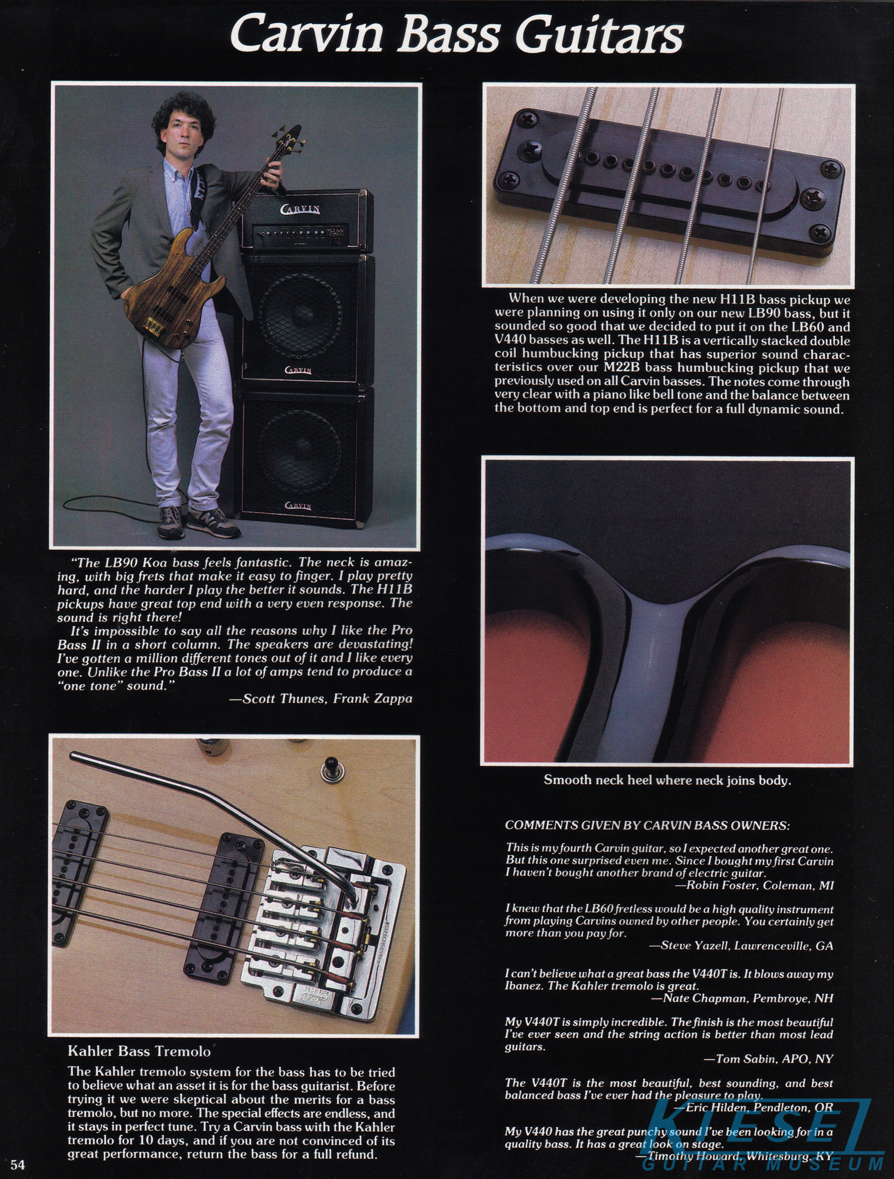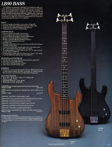 The Kahler bass tremolo was still offered on all Carvin basses in 1987, for an additional $120. These were available in chrome, black and gold, and were featured prominently in the '87 catalog. In 1987, the new H11B stacked humbucker was the standard pickup on Carvin basses. It was originally intended only for the LB90, but ended up being used in all '87 basses. Carvin also switched to their own line of tuners on guitars and basses in 1987. Models earlier than this had German-made Schaller tuners as the standard. These would last until 1992, when Sperzel tuners would become the standard. Note that the Carvin logo was the new black-style, which would appear on all Carvin gear beginning in 1988.