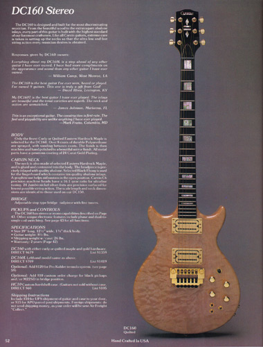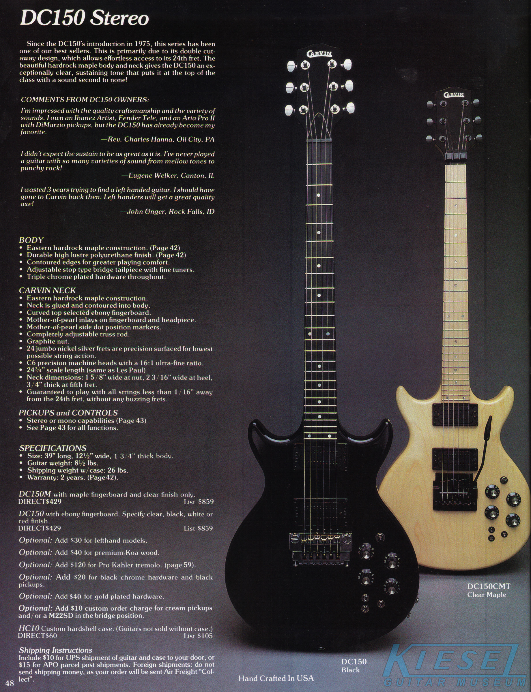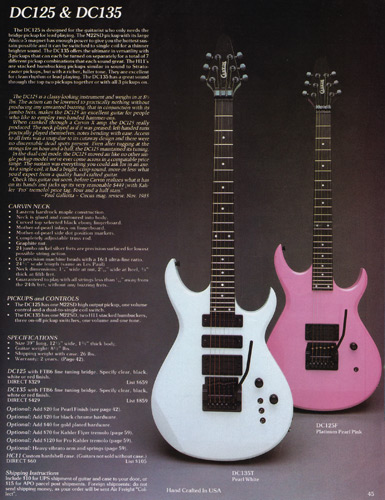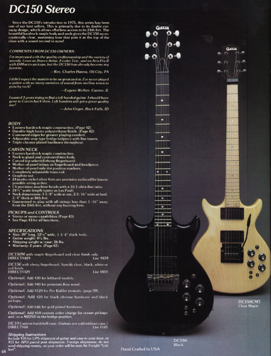 With the departure of the DC100, only the DC150 and upscale DC160 remained in the symmetrical double cutaway style. The DC160 also was relegated to a single page, versus the two page spread that had been used since 1982. Features and options were the same as previous years, but the new pearl finishes were not offered on these models. The DC150, with maple or ebony fingerboard, had a base price of $429. The DC160 had a base price of $679. Other options, such as black or gold hardware, and Kahler Pro tremolo, were the same price as other models.