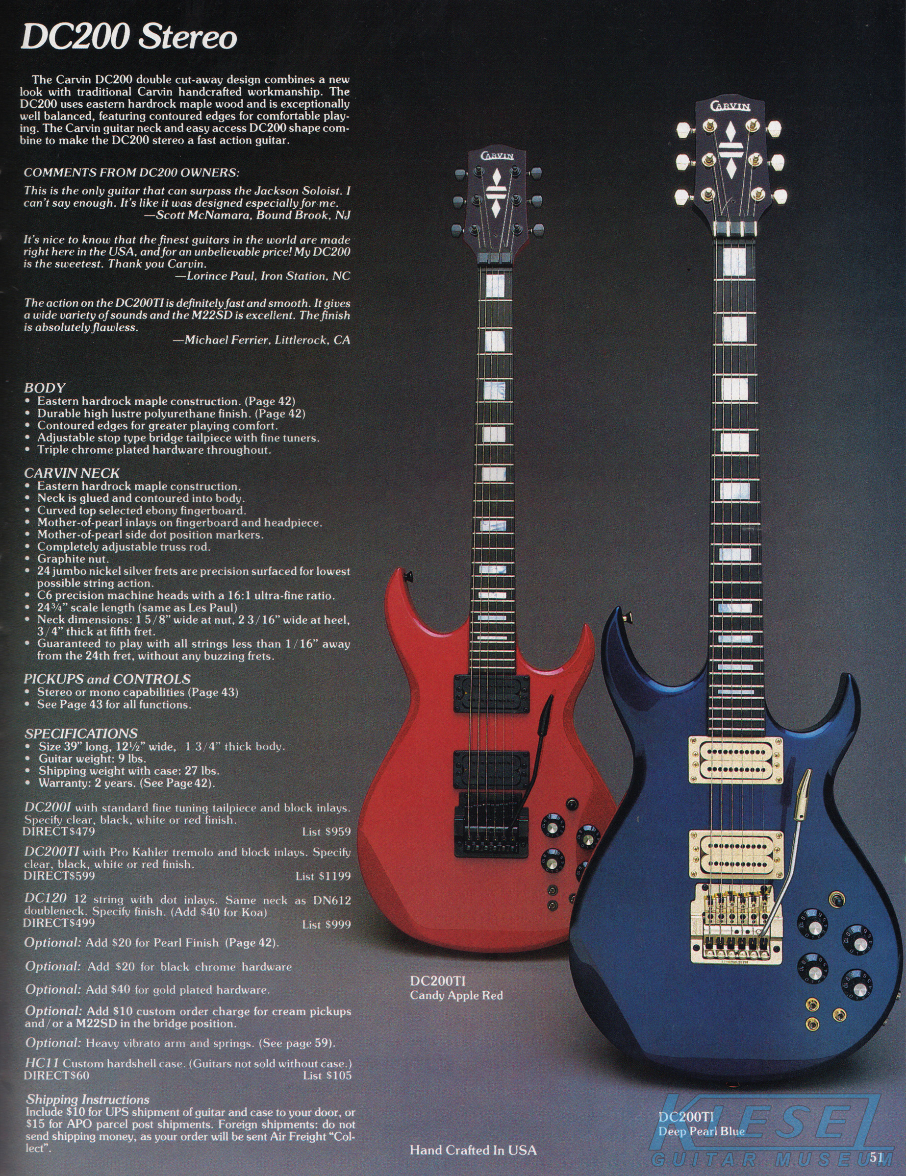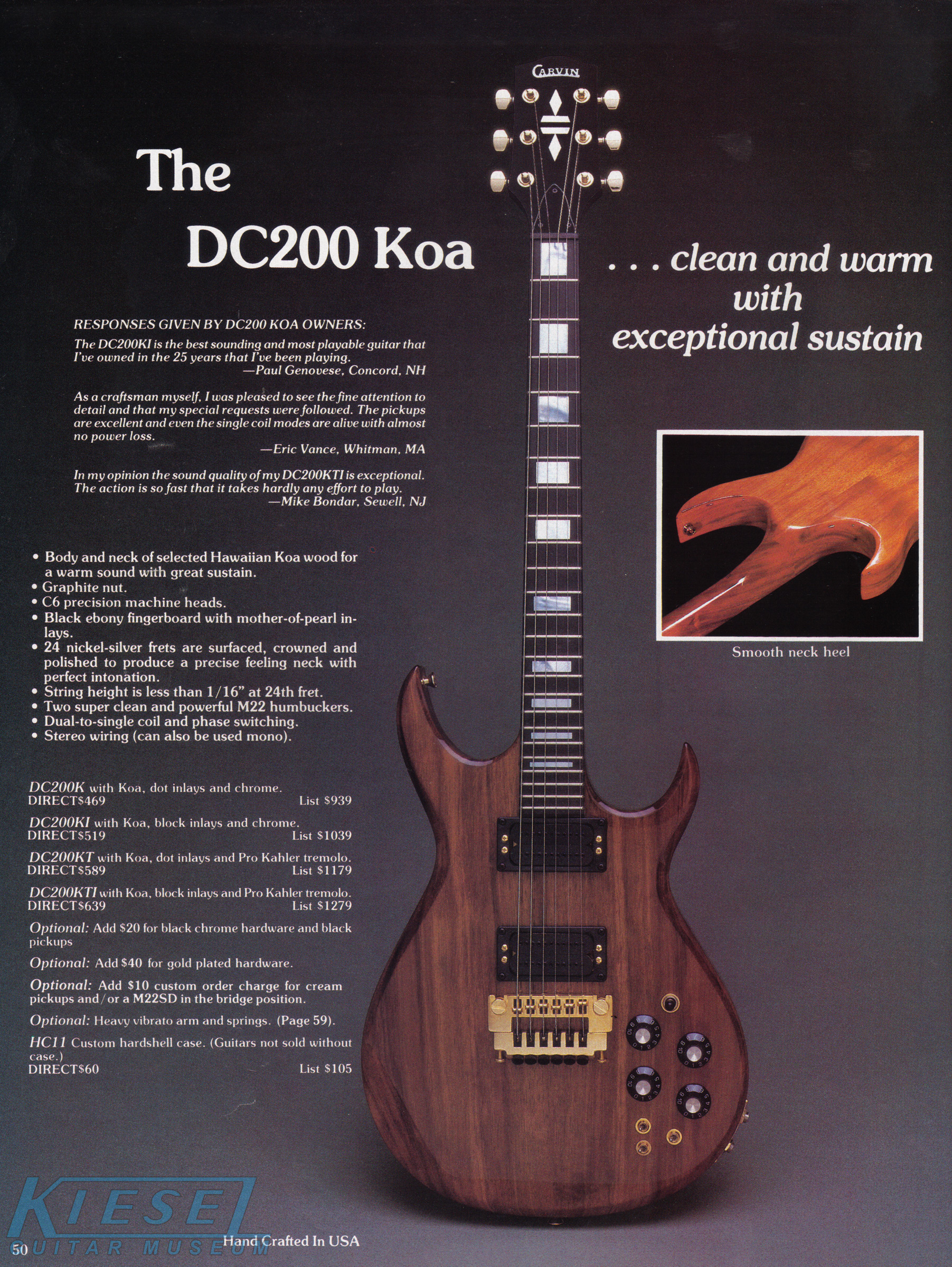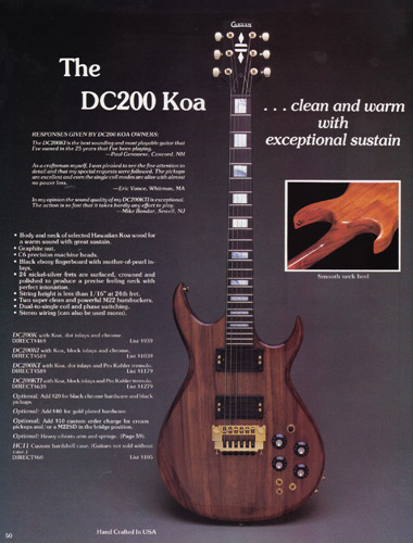 The DC200 Koa was unchanged, and retained the same $469 price with dot inlays and FTB6 tailpiece, $519 price with abalone block inlays and FTB6 tailpiece, $589 price with dot inlays and Kahler Pro tremolo, or $639 price with block inlays and Kahler Pro tremolo. The only options were gold hardware or black hardware. The DC200 Stereo was also unchanged for 1986, but did get a new catalog photo showing the Candy Apple Red and Deep Pearl Blue finishes. The base price with standard FTB6 tailpiece was $479, and the Kahler Pro-equipped model was $599. It was also available as the DC120 12-string guitar, which had a base price of $499.