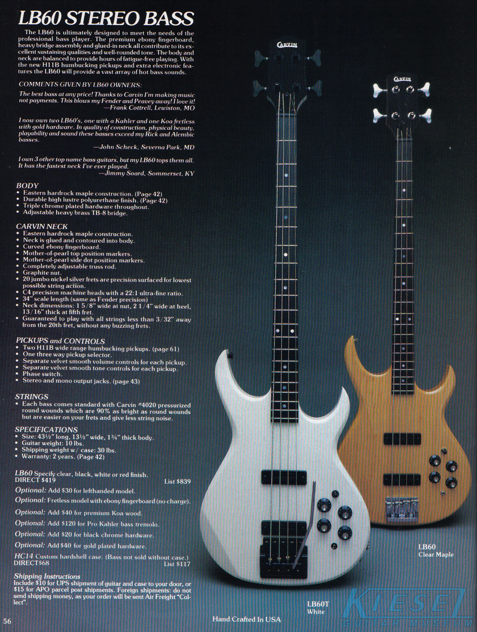 The LB60 was unchanged for '87, with the exception of new H11B stacked humbucker pickups, and Carvin-branded tuners and strings. This model was referred to as the "LB60 Stereo Bass", rather than simply the LB60 as it was in '86 (even though it was stereo then, too). There were no price changes on this model from the '86 models.