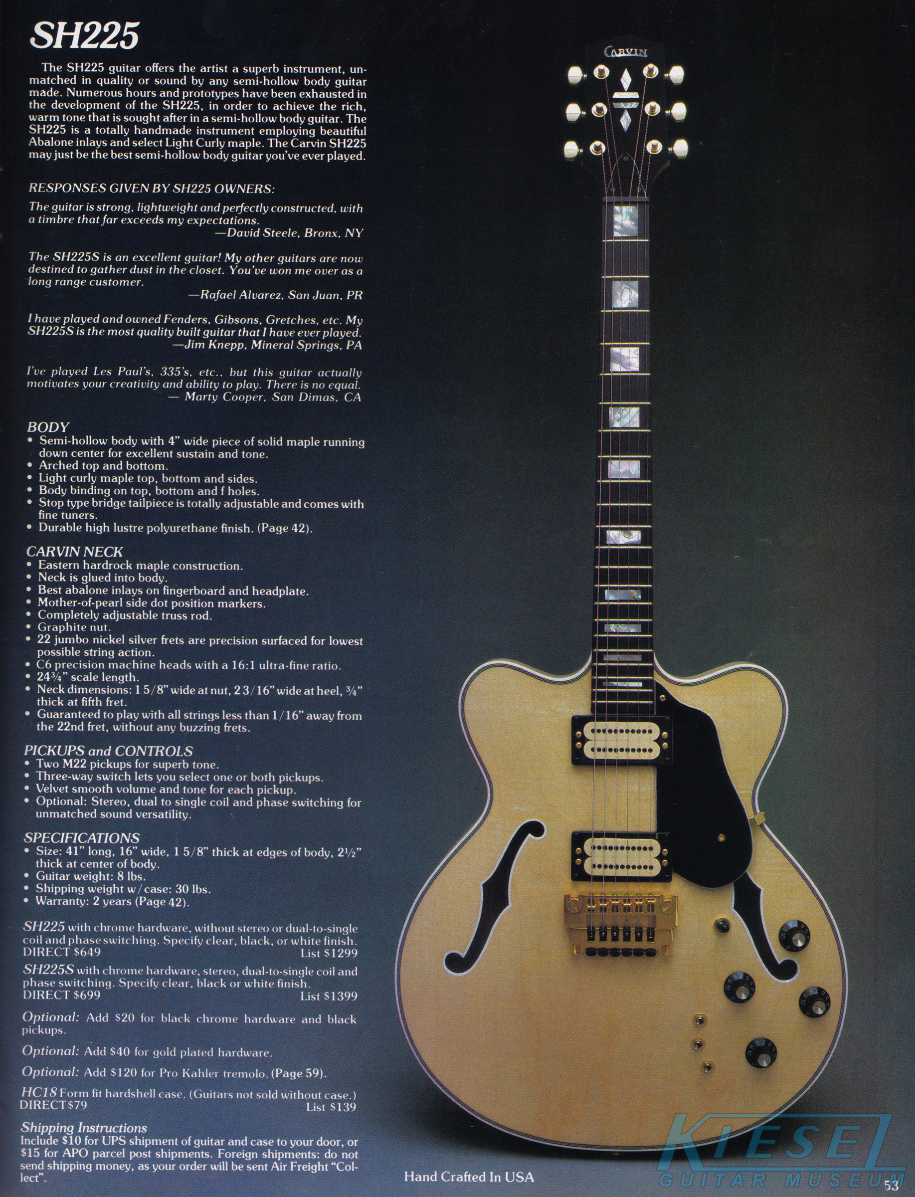 The SH225 semi-hollow guitar got a new catalog photo for 1987, but was otherwise unchanged. The SH225 increased in price to $649 for the basic model, in black, white or clear. The SH225S, with stereo wiring and coil and phase switches, dropped to $699. The Kahler Pro tremolo was an additional $120, gold hardware was an additional $40, and black hardware with black pickups was an additional $20. The HC18 form-fitted hardshell case was $79.