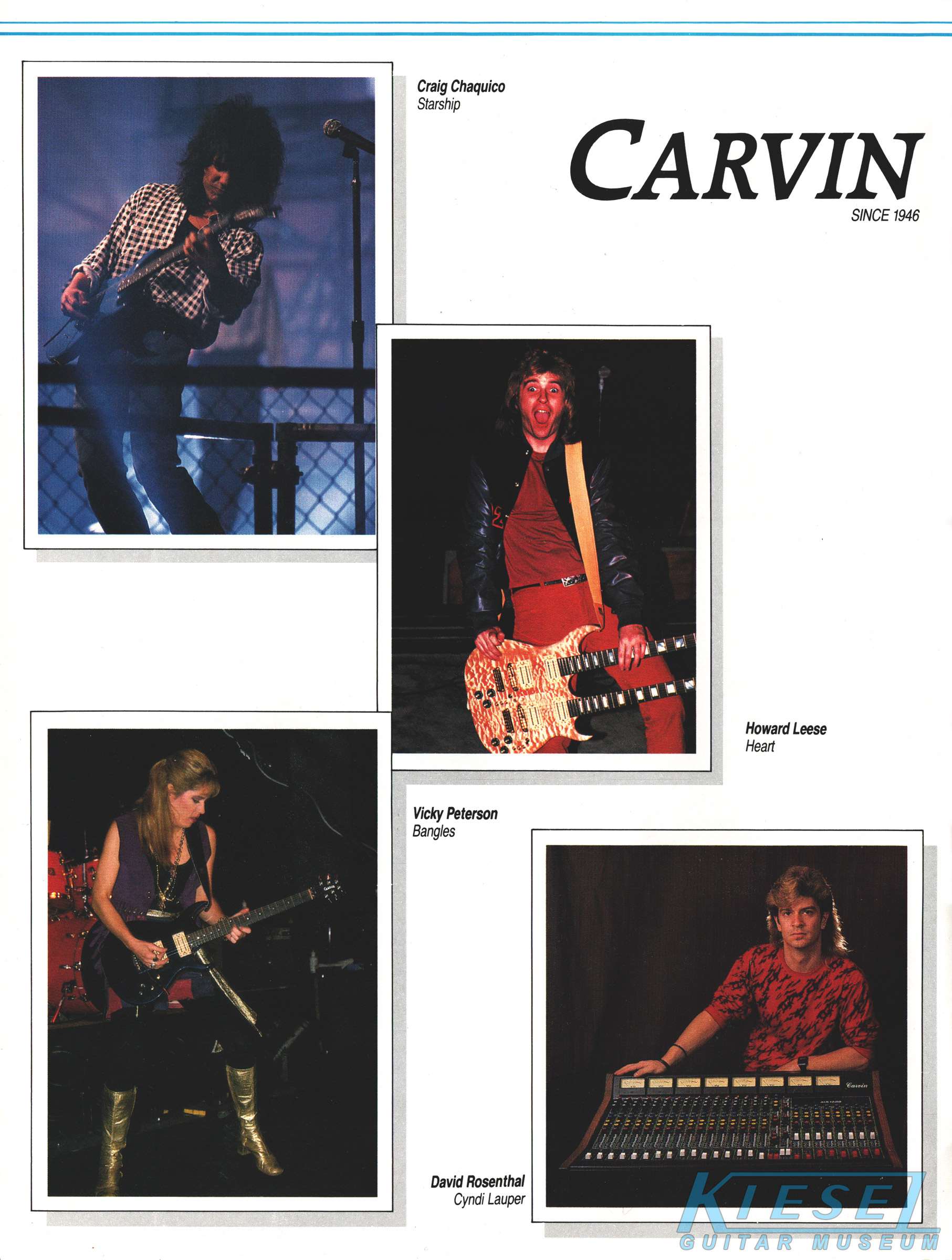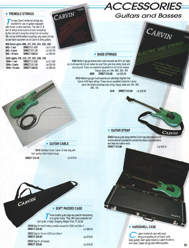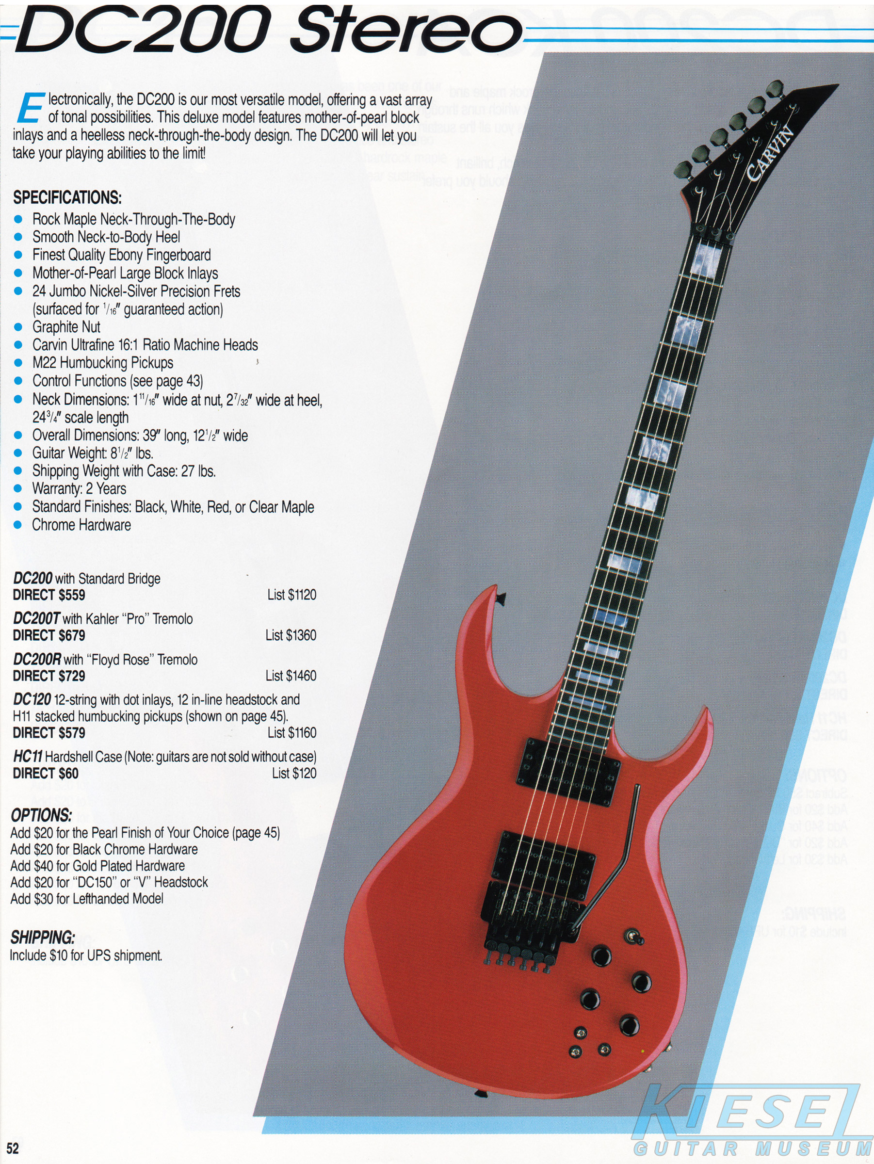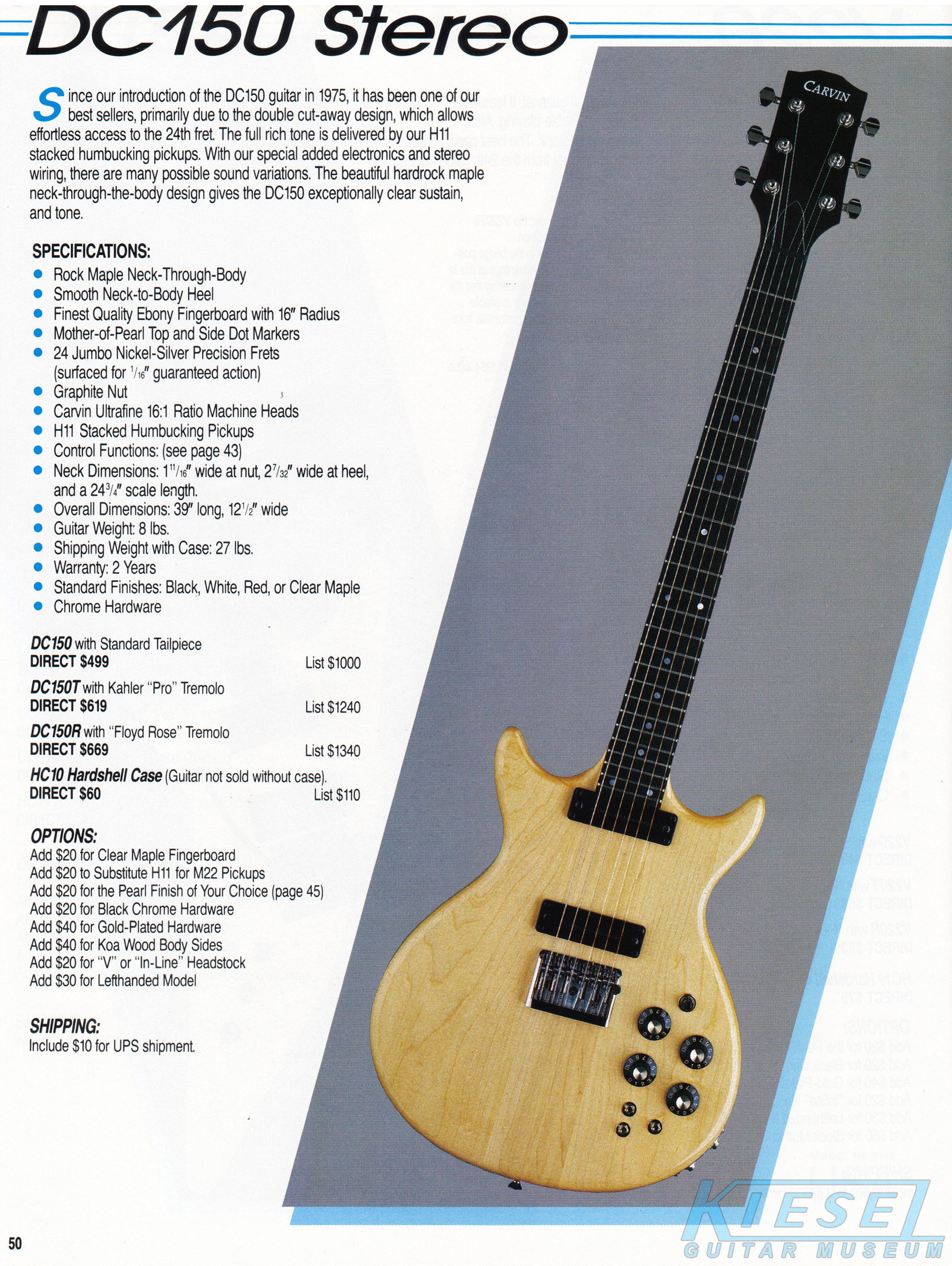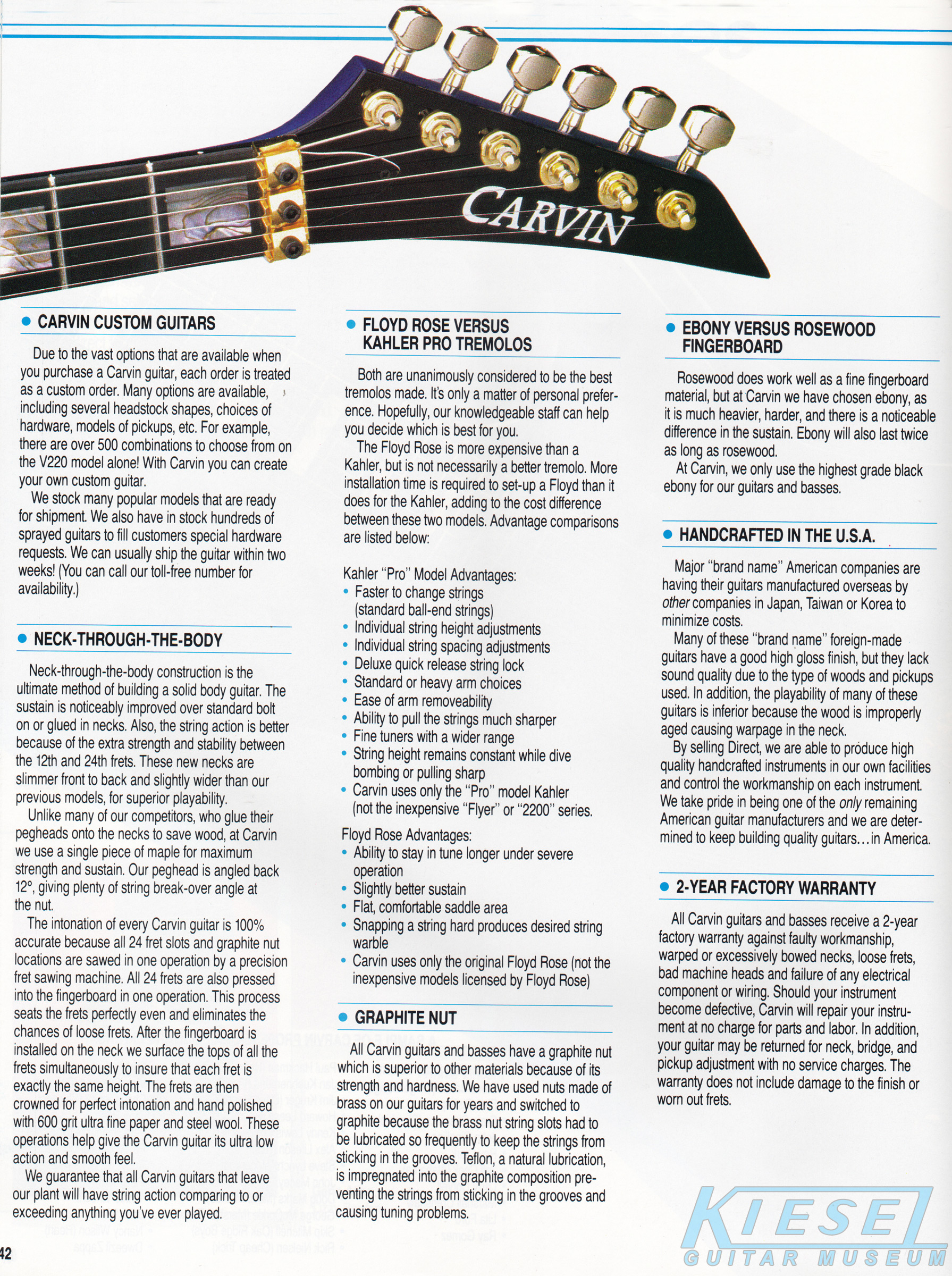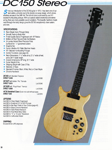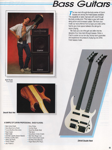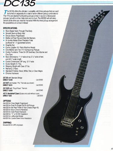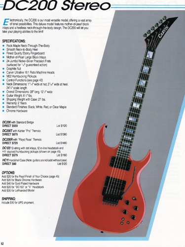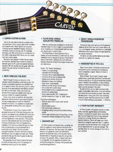 Cosmetically, Carvin guitars & basses were sporting new colors and a new headstock design. But most significantly, this was the year Carvin instruments were first built using neck-thru construction. Rather than having a neck that was glued in or bolted on, the wood that the neck was shaped from was cut extra long, and the body "wings" were then glued along the sides. This arrangement was very stable and allowed for excellent sustain, as the nut and bridge were both attached to the same piece of wood. A new 6-inline headstock was added, but the traditional 3 X 3 and V headstocks were still available as options on all single-neck models, as was a reverse inline headstock, and a bizarre 12-string pointed inline headstock. New pearl finishes were added, including Pearl Purple, Pearl Yellow, Light Pearl Blue and Pearl Green. Translucent blue, yellow, red, and green were added to a flamed maple top. Original Floyd Rose tremolos were added in addition to the Kahler models (only the Kahler Pro was offered now; the Flyer had been discontinued). Metal knobs were also standard on all models except the DC150. Lastly, the semi-hollow SH225 began to make it's exit - it wasn't shown in the catalog, but was still available.