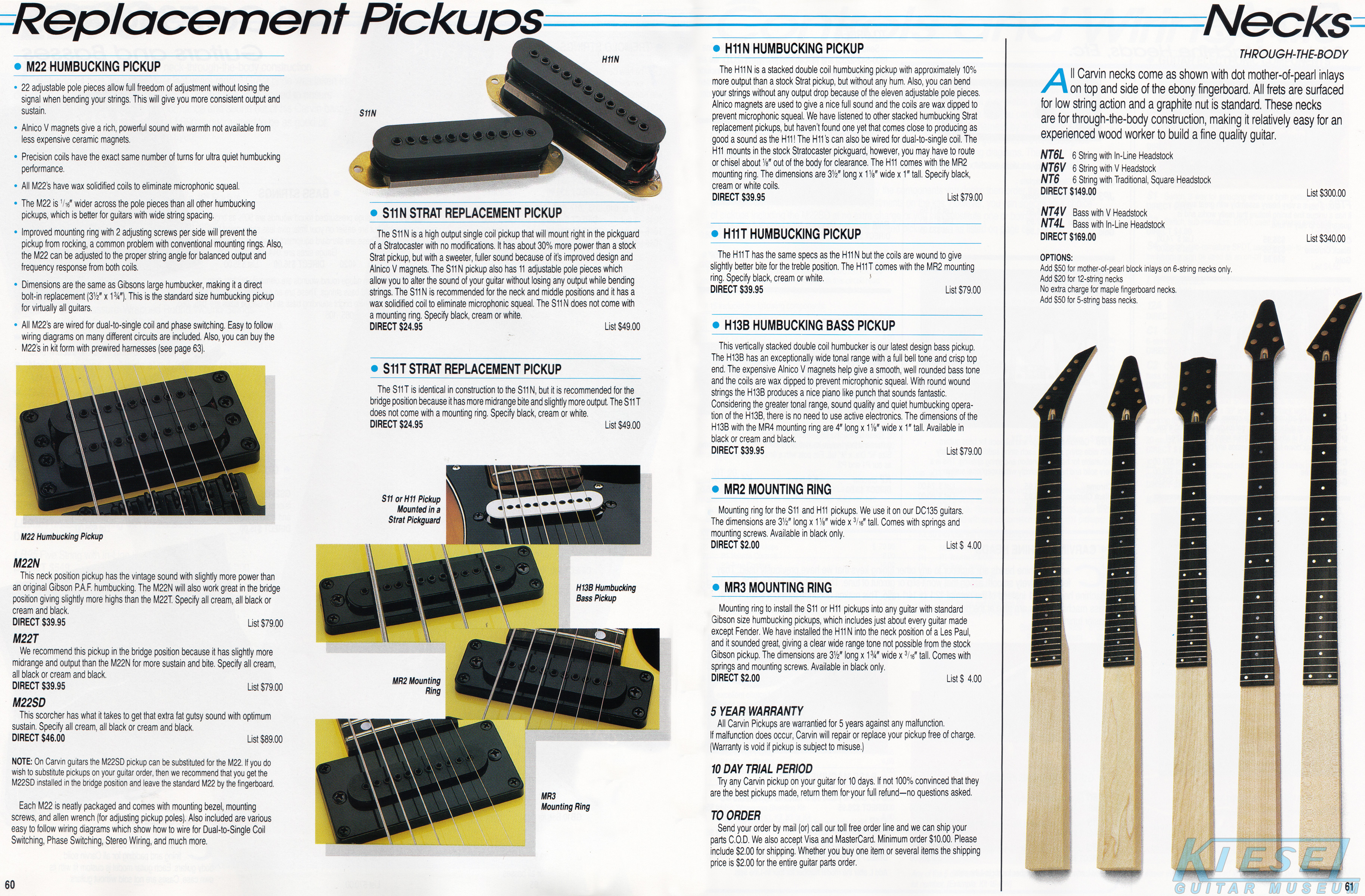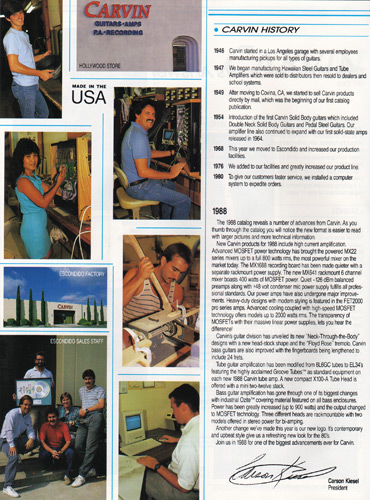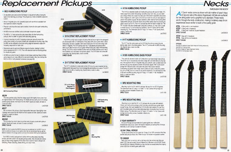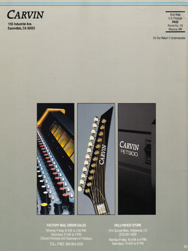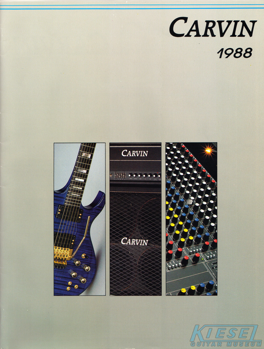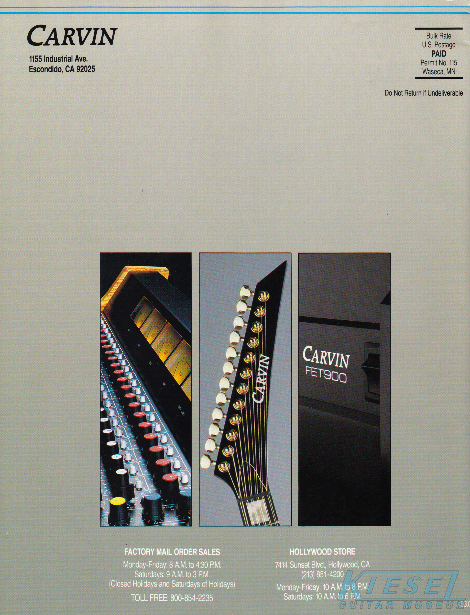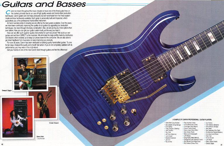 Cosmetically, Carvin guitars & basses were sporting new colors and a new headstock design. But most significantly, this was the year Carvin instruments were first built using neck-thru construction. Rather than having a neck that was glued in or bolted on, the wood that the neck was shaped from was cut extra long, and the body "wings" were then glued along the sides. This arrangement was very stable and allowed for excellent sustain, as the nut and bridge were both attached to the same piece of wood. A new 6-inline headstock was added, but the traditional 3 X 3 and V headstocks were still available as options on all single-neck models, as was a reverse inline headstock, and a bizarre 12-string pointed inline headstock. New pearl finishes were added, including Pearl Purple, Pearl Yellow, Light Pearl Blue and Pearl Green. Translucent blue, yellow, red, and green were added to a flamed maple top. Original Floyd Rose tremolos were added in addition to the Kahler models (only the Kahler Pro was offered now; the Flyer had been discontinued). Metal knobs were also standard on all models except the DC150. Lastly, the semi-hollow SH225 began to make it's exit - it wasn't shown in the catalog, but was still available.