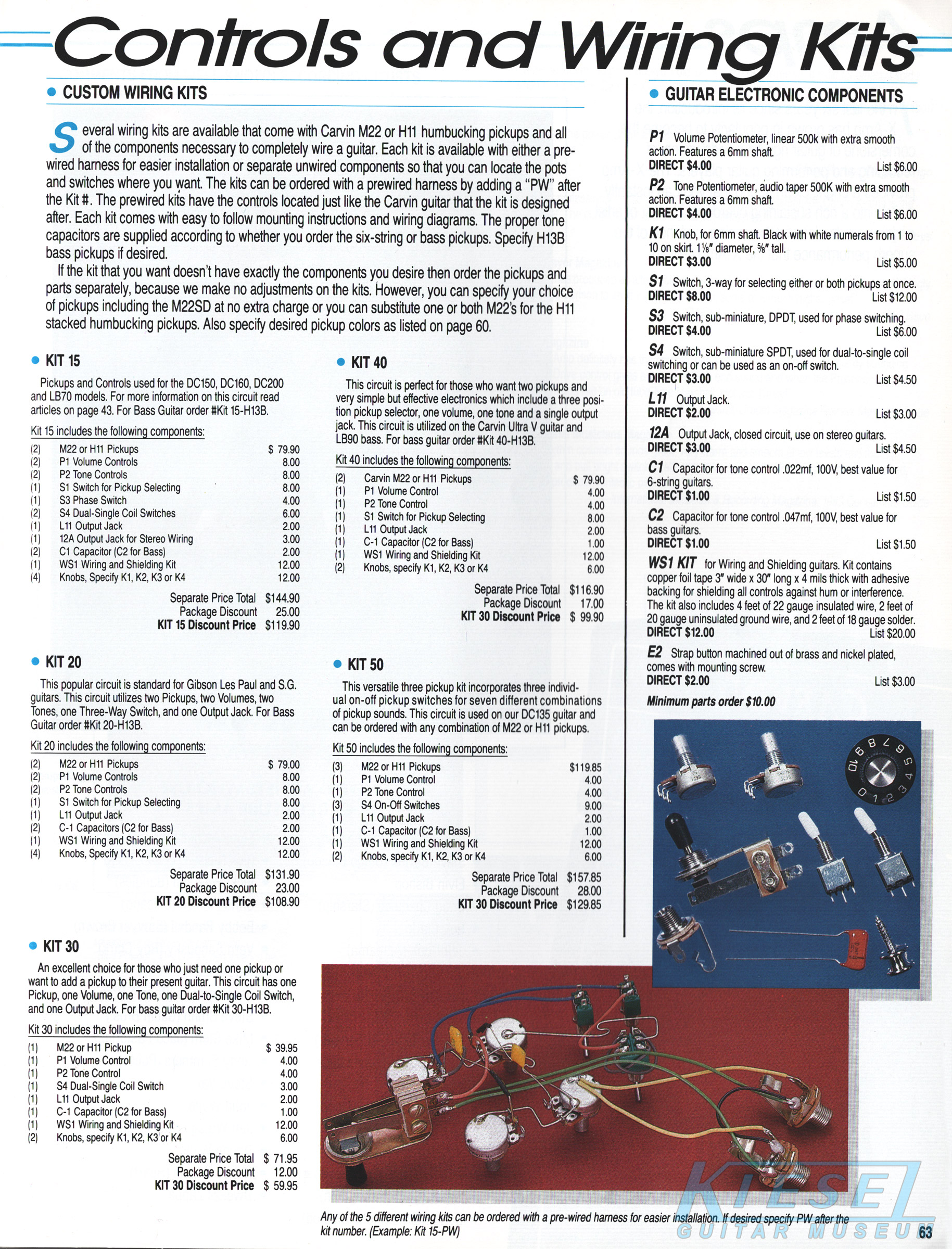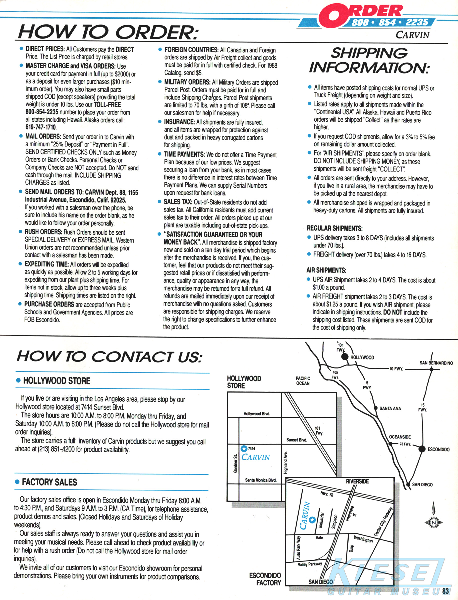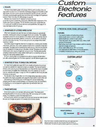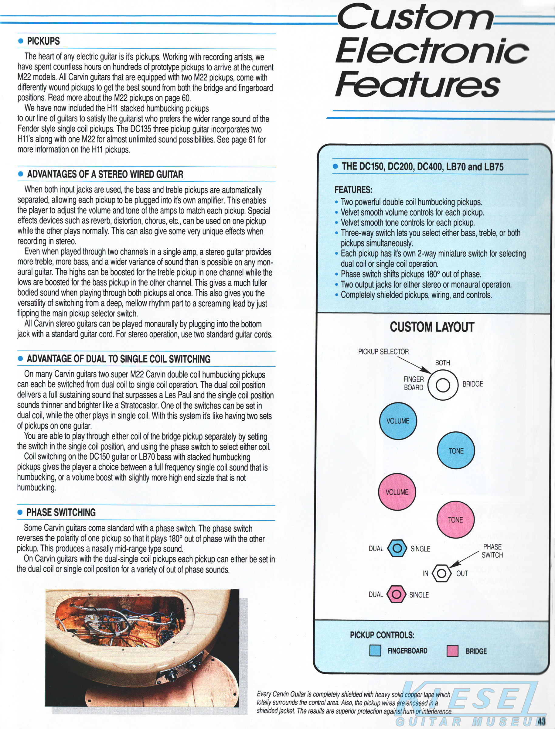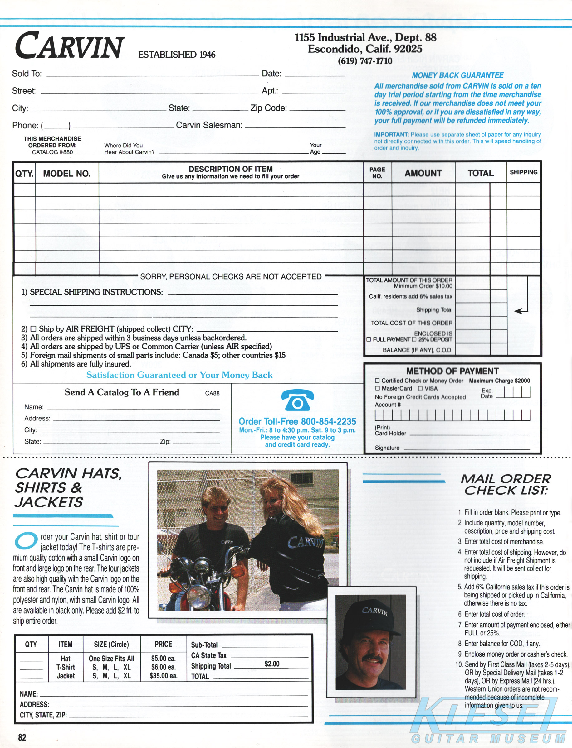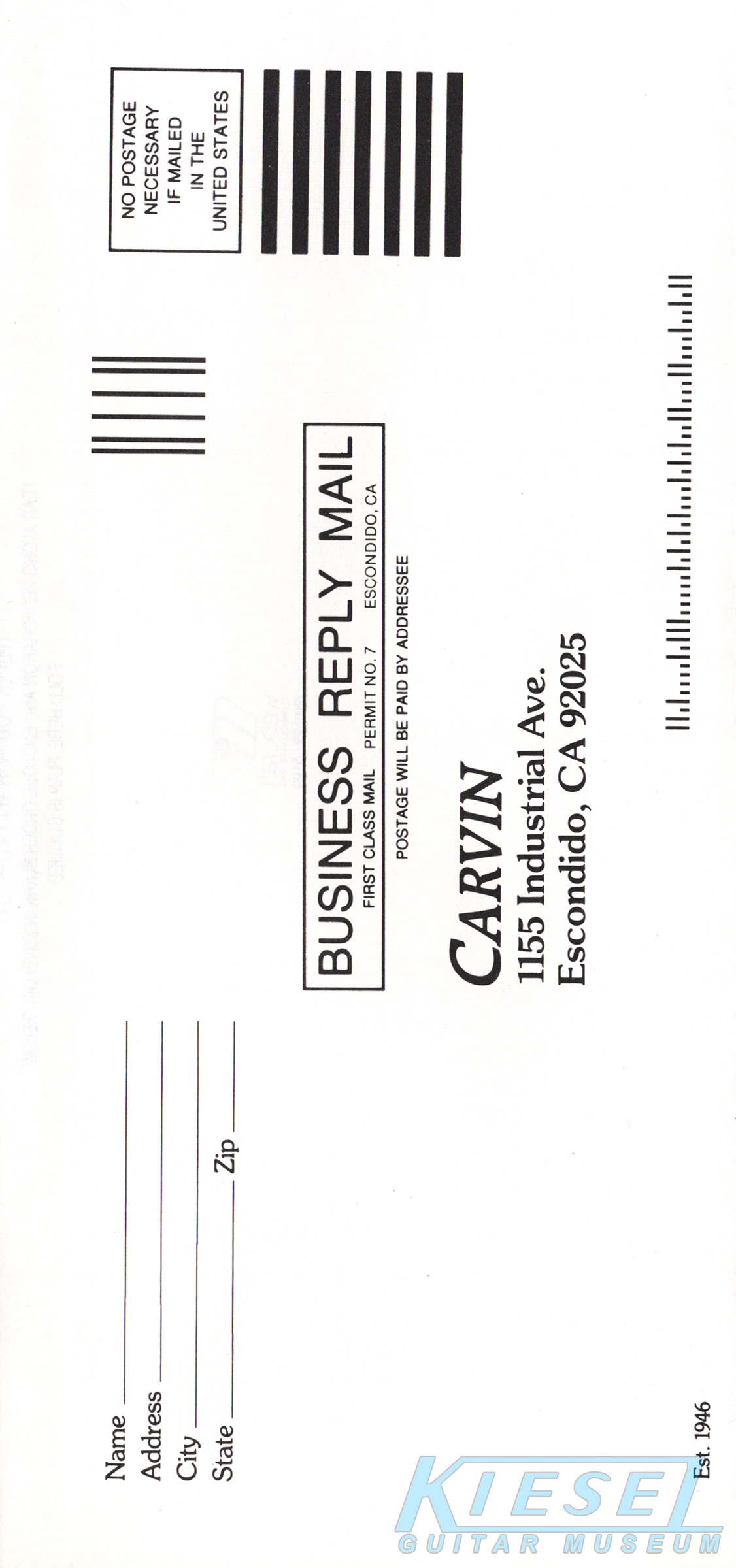 Cosmetically, Carvin guitars & basses were sporting new colors and a new headstock design. But most significantly, this was the year Carvin instruments were first built using neck-thru construction. Rather than having a neck that was glued in or bolted on, the wood that the neck was shaped from was cut extra long, and the body "wings" were then glued along the sides. This arrangement was very stable and allowed for excellent sustain, as the nut and bridge were both attached to the same piece of wood. A new 6-inline headstock was added, but the traditional 3 X 3 and V headstocks were still available as options on all single-neck models, as was a reverse inline headstock, and a bizarre 12-string pointed inline headstock. New pearl finishes were added, including Pearl Purple, Pearl Yellow, Light Pearl Blue and Pearl Green. Translucent blue, yellow, red, and green were added to a flamed maple top. Original Floyd Rose tremolos were added in addition to the Kahler models (only the Kahler Pro was offered now; the Flyer had been discontinued). Metal knobs were also standard on all models except the DC150. Lastly, the semi-hollow SH225 began to make it's exit - it wasn't shown in the catalog, but was still available.