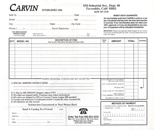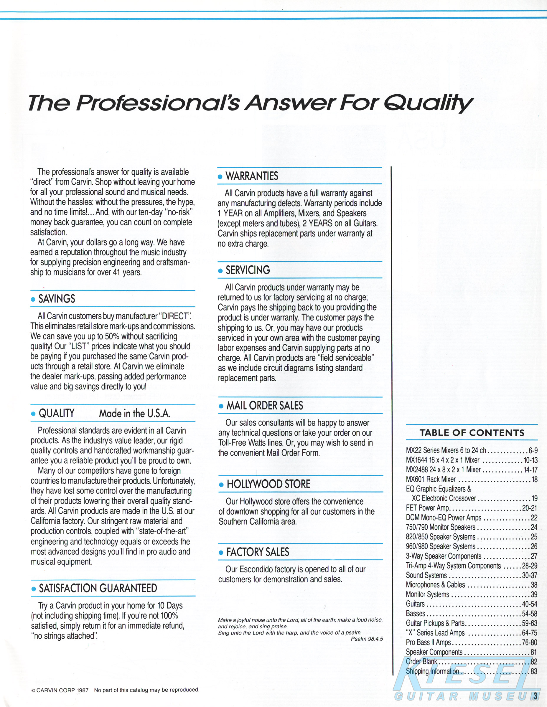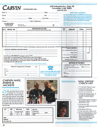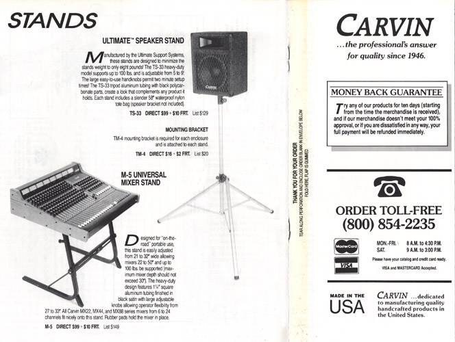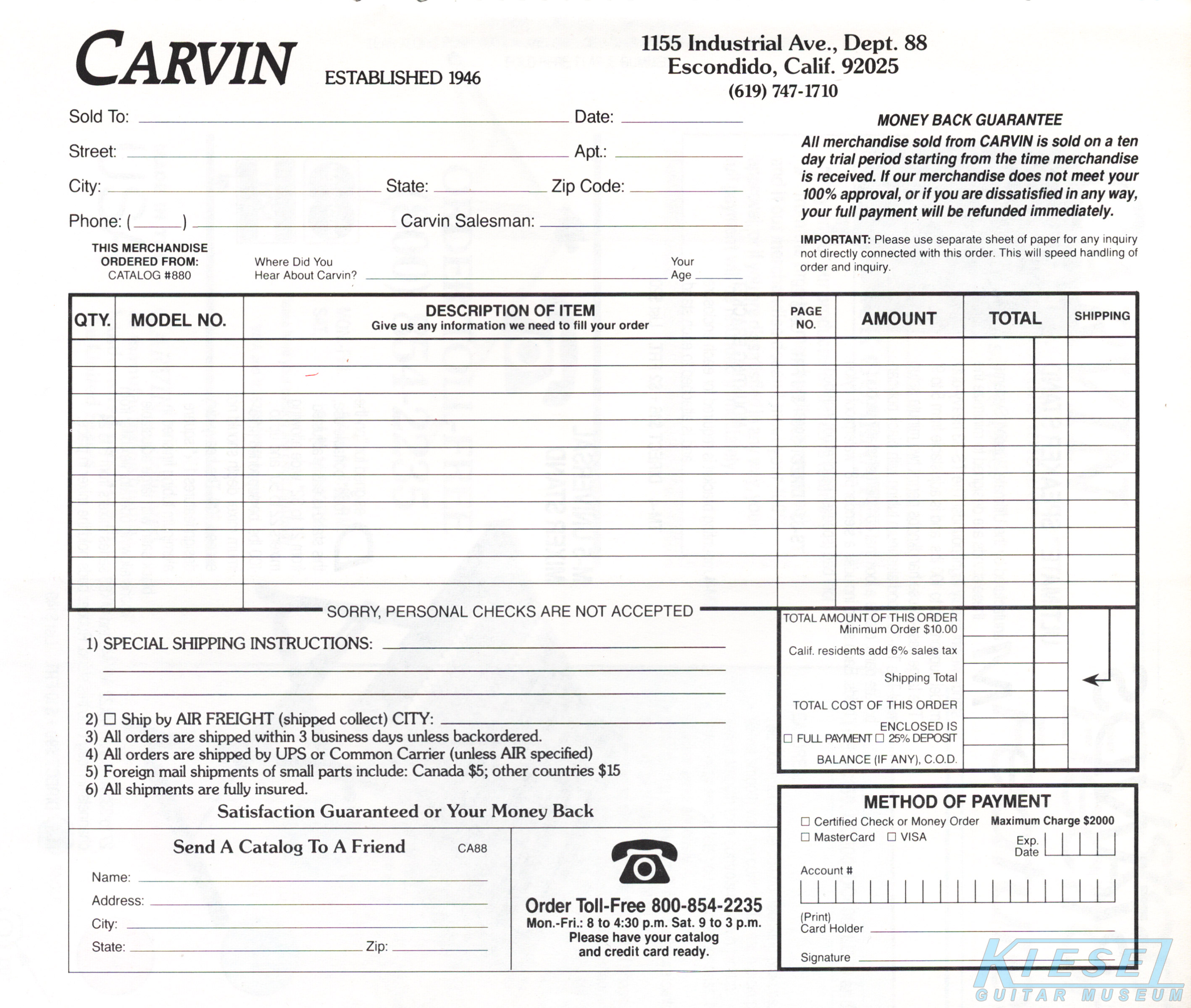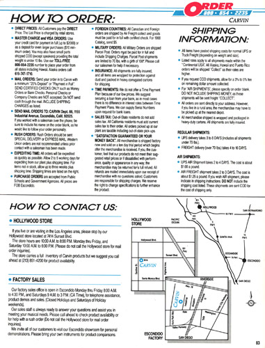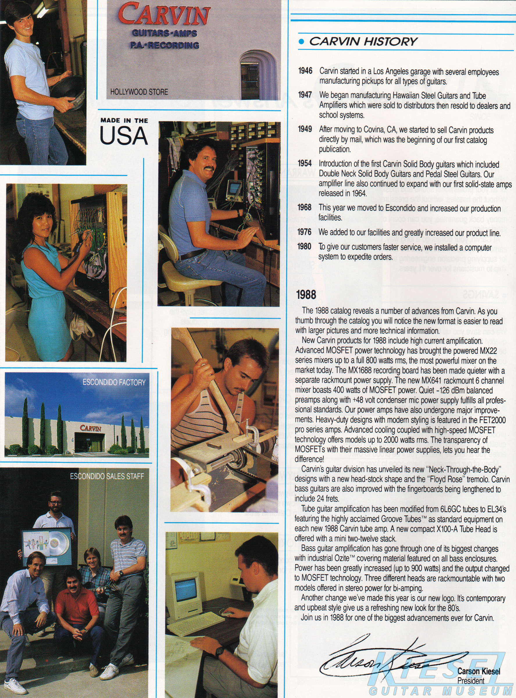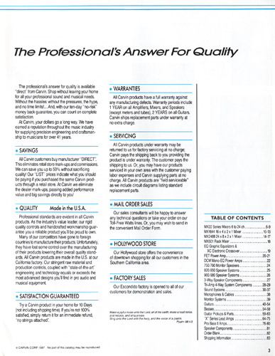 Cosmetically, Carvin guitars & basses were sporting new colors and a new headstock design. But most significantly, this was the year Carvin instruments were first built using neck-thru construction. Rather than having a neck that was glued in or bolted on, the wood that the neck was shaped from was cut extra long, and the body "wings" were then glued along the sides. This arrangement was very stable and allowed for excellent sustain, as the nut and bridge were both attached to the same piece of wood. A new 6-inline headstock was added, but the traditional 3 X 3 and V headstocks were still available as options on all single-neck models, as was a reverse inline headstock, and a bizarre 12-string pointed inline headstock. New pearl finishes were added, including Pearl Purple, Pearl Yellow, Light Pearl Blue and Pearl Green. Translucent blue, yellow, red, and green were added to a flamed maple top. Original Floyd Rose tremolos were added in addition to the Kahler models (only the Kahler Pro was offered now; the Flyer had been discontinued). Metal knobs were also standard on all models except the DC150. Lastly, the semi-hollow SH225 began to make it's exit - it wasn't shown in the catalog, but was still available.