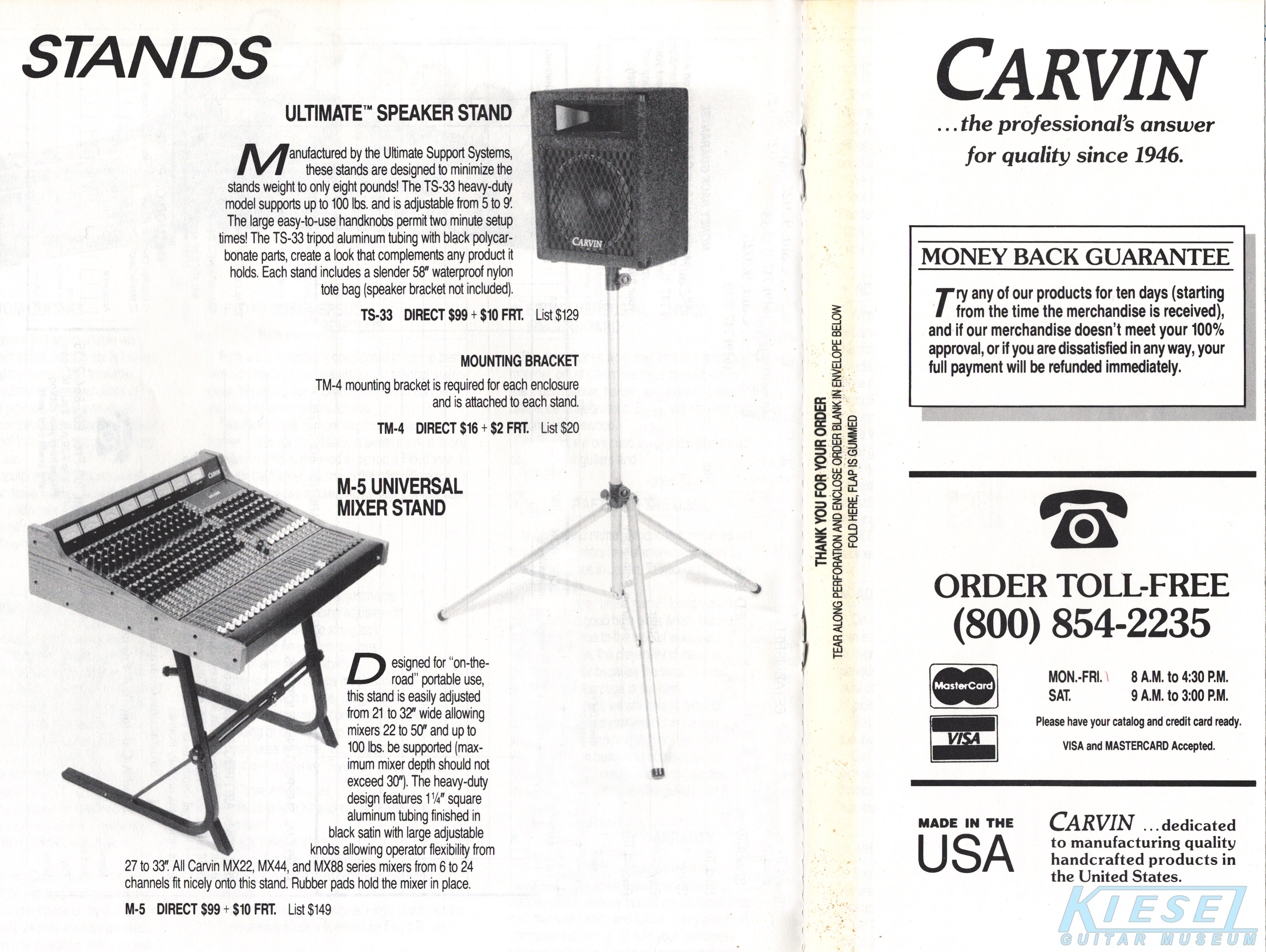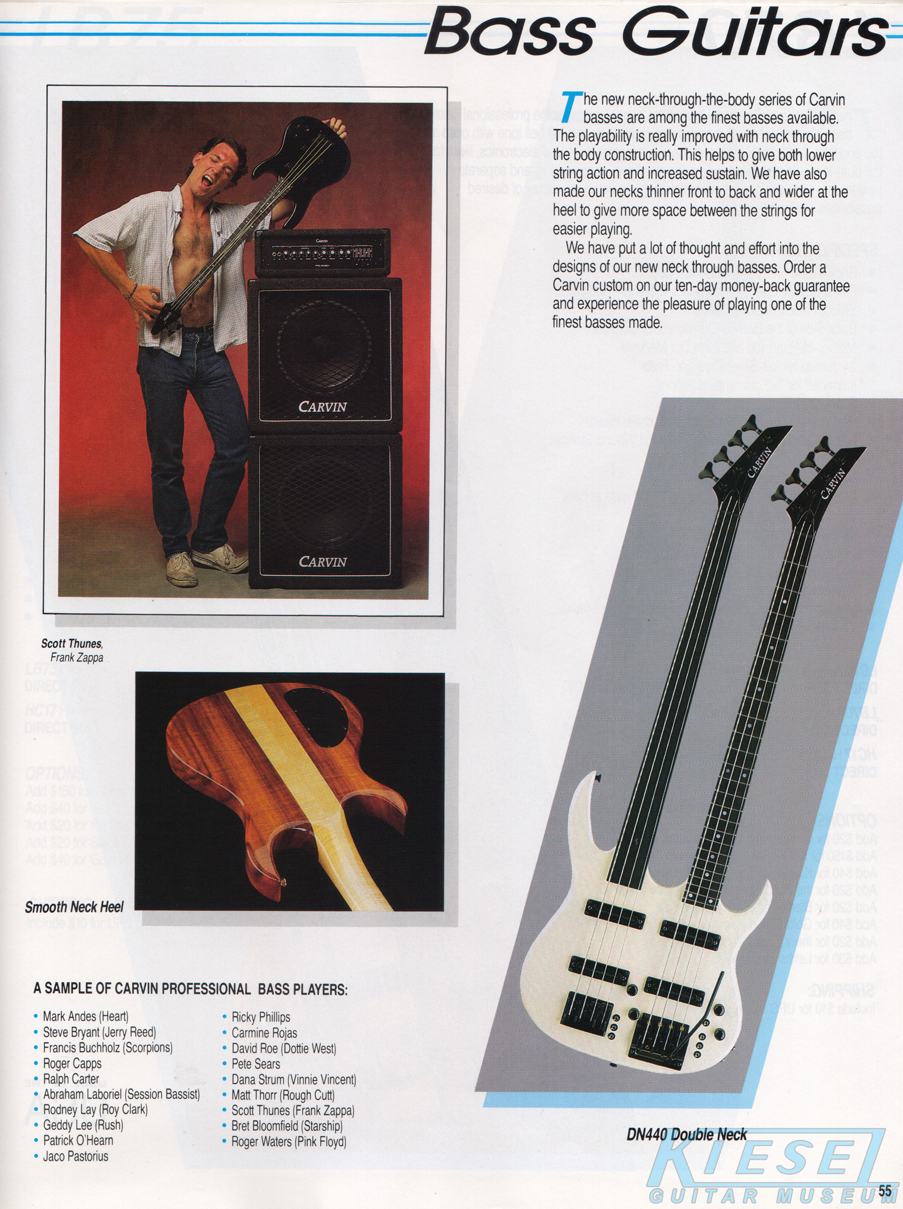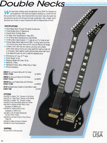 In addition to the other bass models, Carvin introduced the DN440 doubleneck bass, which was also available as the DN640 guitar/bass. The model shown in the catalog is a fretless/fretted, with a Kahler bass tremolo (a $150 option) and finished in Pearl White. This model would stay the same for 1989, and have a new control configuration for 1990. The photo shown in the catalog was the only photo of a DN440 that appeared in any Carvin catalog throughout the run of the model. The base price on the DN440 was $1099 (as was the DN640 guitar/bass), and the HC15 hardshell case was $89.