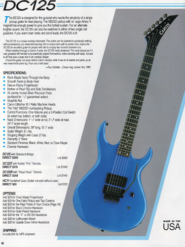 The DC125 single pickup guitar, with an M22SD pickup, single volume control and coil splitter was still popular in its 3rd year of production. Like all Carvins, it was constructed of Eastern hard rock maple, with ebony fingerboard (a clear maple fingerboard was optional). Chrome hardware was standard, as was MOP dot inlays. Floyd Rose or Kahler tremolos were optional. Base price on the DC125 was $399, plus $60 for the HC11 hardshell case. The catalog photo showed a DC125 in Light Pearl Blue, with Floyd Rose trem and black hardware.