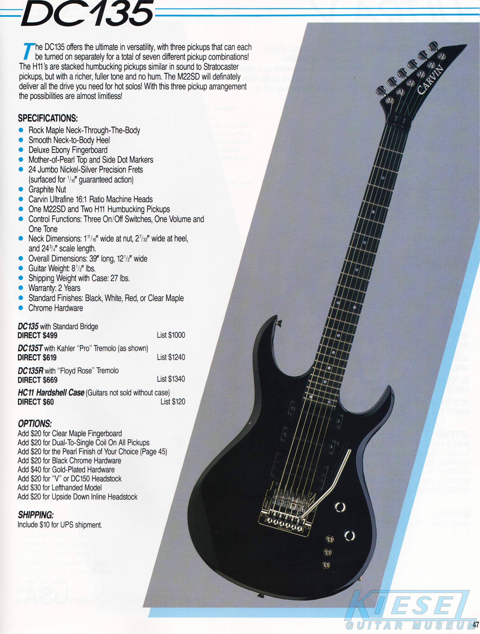 The DC135 was the same design as its predecessor, with a single M22SD pickup and a pair of H11 stacked humbuckers. It had a single volume and tone control, and 3 on/off mini switches (for each pickup). Chrome hardware was standard, as was MOP dot inlays. Floyd Rose or Kahler tremolos were optional. Base price on the DC135 was $499, plus $60 for the HC11 hardshell case. The catalog photo showed a DC135 in Black, with Kahler Pro trem and gold hardware.