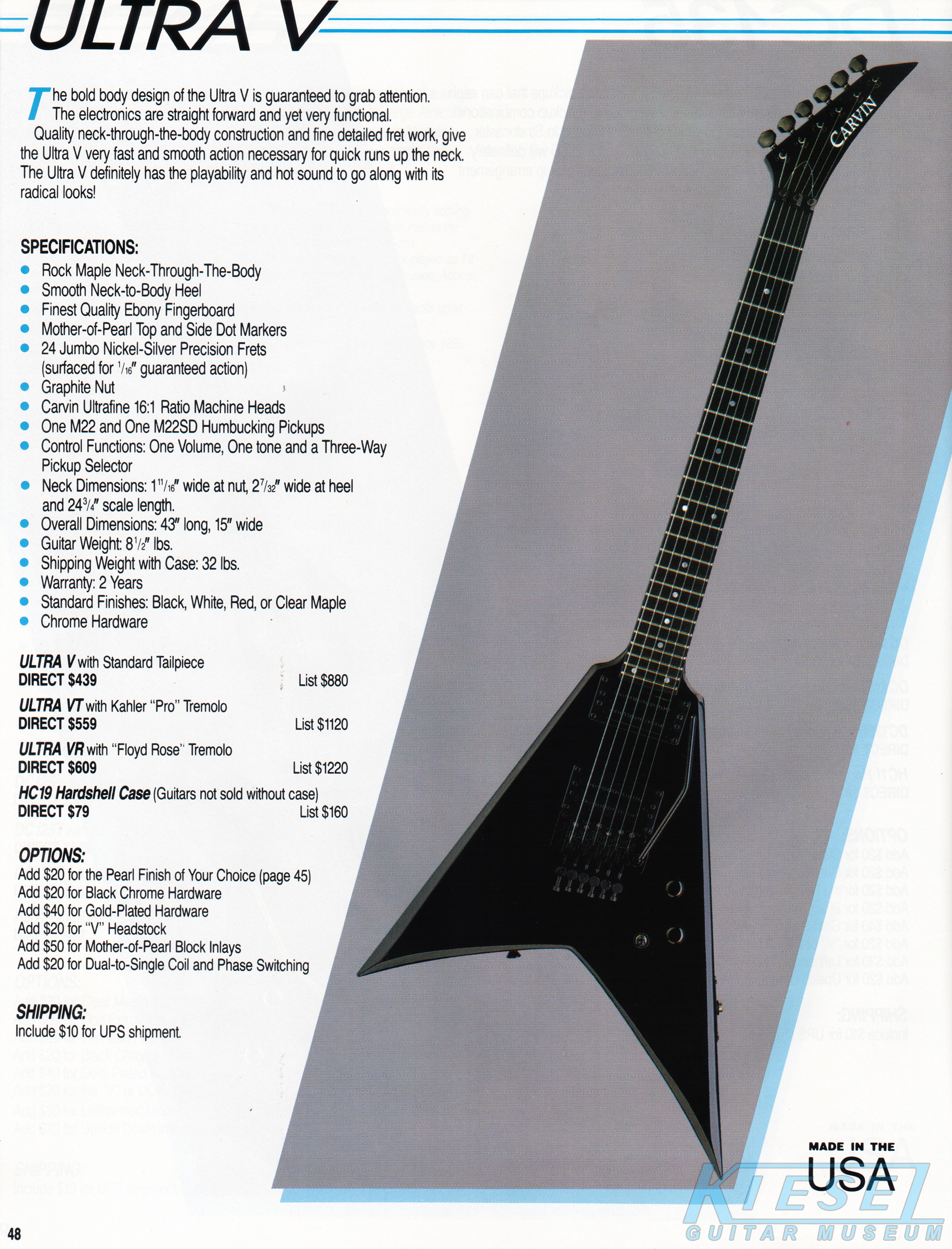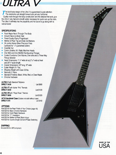 The 2nd-generation Ultra V had new cosmetic changes, in addition to the new neck-thru design. The body edges were beveled, versus the straighter edges of the '87 model, which gave an even sleeker, more aggressive look. It had all the features and options of other Carvin guitars, with the exception of left-handed models, maple fingerboard, and 3X3 headstock. Electronics consisted of an M22 in the neck position, and an M22SD in the bridge position, with single volume and tone controls. Base price on the Ultra V was $439, and the HC19 hardshell case was $79. The catalog photo showed an Ultra V in black, with Floyd Rose tremolo and black hardware.