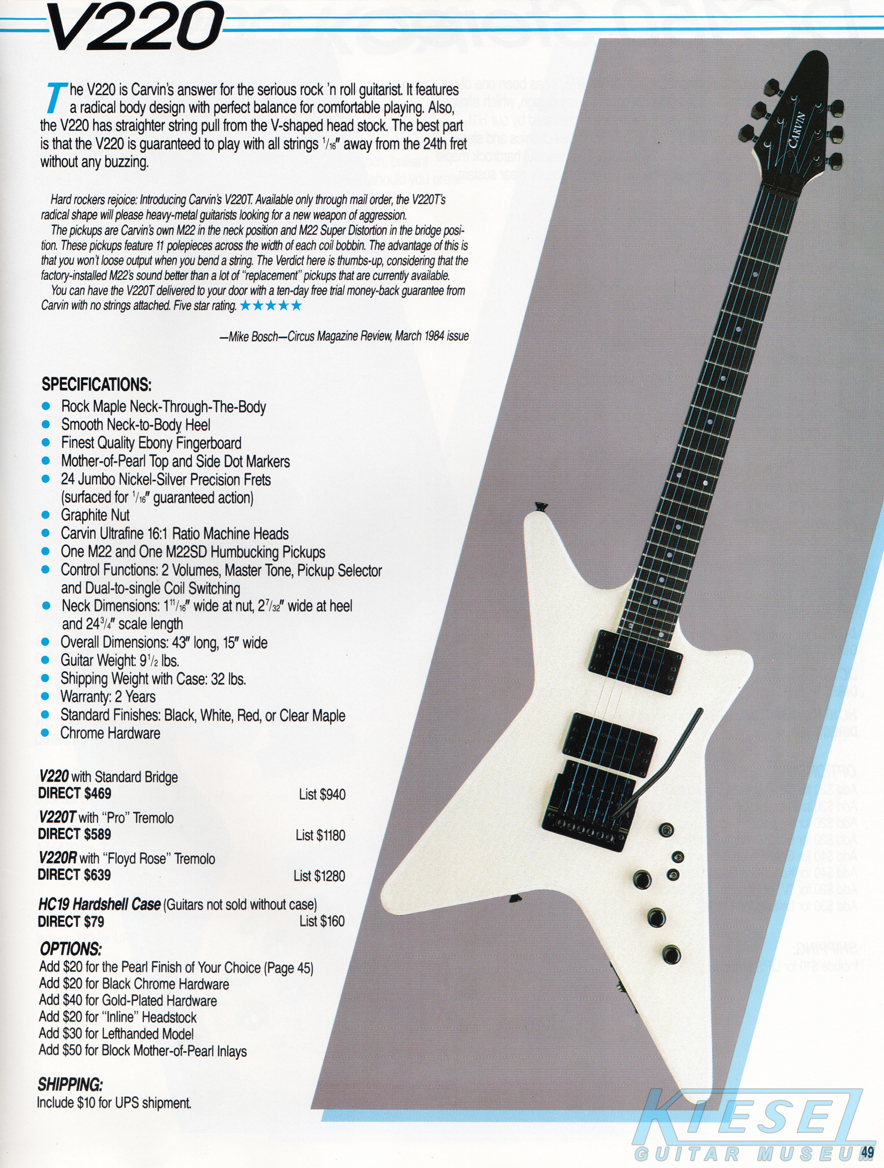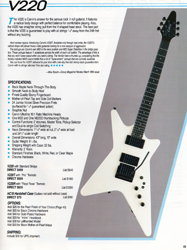 The V220 enjoyed all the new features and options offered in 1988, and continued to be very popular. Construction materials and techniques were the same as other Carvin models, including neck-thru design, rock maple body and neck, ebony fingerboard and MOP inlays. It was also available with a maple fingerboard, and with the new 6-inline headstock. Electronics consisted of an M22 in the neck position, and an M22SD in the bridge position, with dual volume/single tone controls, pickup selector, and coil splitters. Base price on the V220 was $469, plus $79 for the SC19 hardshell case. The catalog photo showed a V220 in white, with Kahler Pro trem and black hardware.