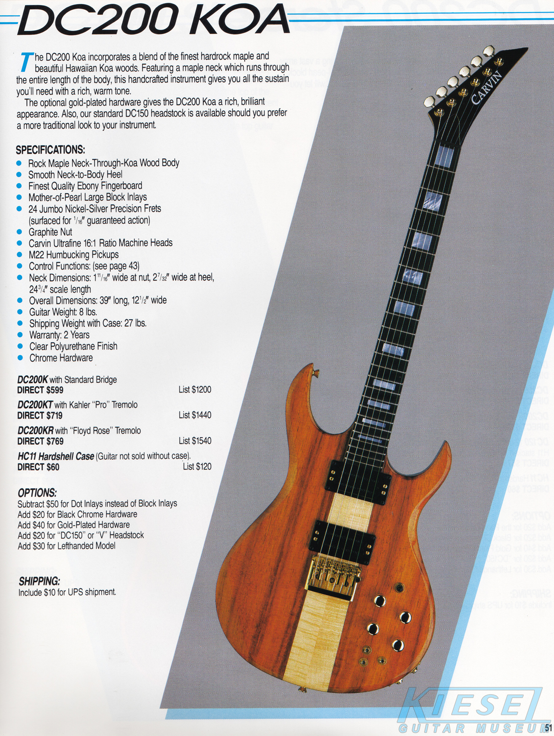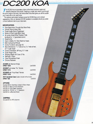 The DC200 Koa gave the best view of the new neck-thru design - the 2-piece maple neck was clearly visible with the koa body wings. Electronics consisted of standard stereo wiring, and a pair of M22 pickups with dual volume/tone controls, pickup selector, and coil/phase mini-switches. MOP block inlays were standard, but dot inlays could be ordered, as could the traditional or V headstocks. Base price on the DC200 Koa was $599, plus $60 for the HC11 case. The catalog photo showed the DC200 with standard bridge and optional gold hardware.