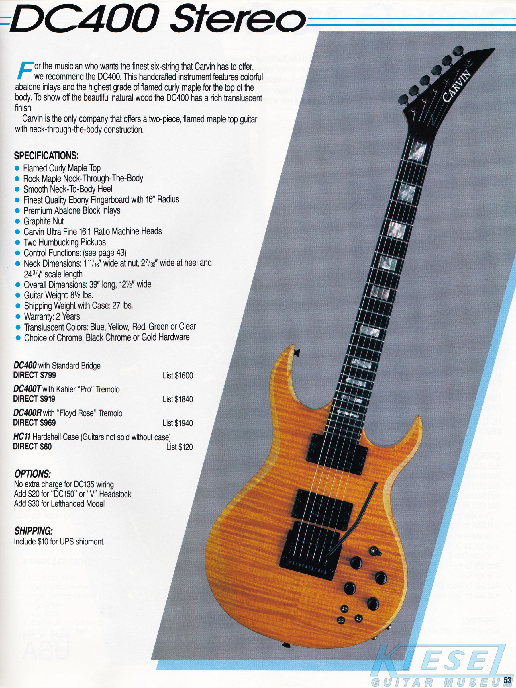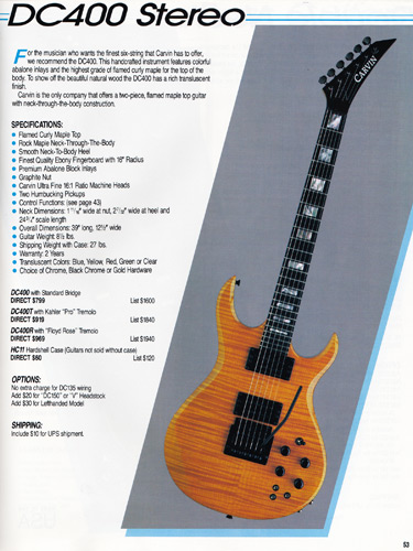 The DC400 Stereo was the top of the line model for 1988, and it showed the direction Carvin's Custom Shop was moving in. Instead of a solid painted or natural gloss finish, the DC400 had a standard flamed maple top and choice of translucent finishes. Although curly maple (also known as quilted maple) had been offered on limited models in the past, this was the first time a figured wood could be combined with a translucent finish. Electronics were the same as the DC200 Stereo, and it could also be ordered with the electronics package of the DC135. Abalone block inlays were standard, as were any choice of hardware color. Base price on the DC400 Stereo was $799, and the HC11 hardshell case was $60. The catalog photo showed the DC400 Stereo in translucent yellow, with Kahler Pro tremolo and black hardware.