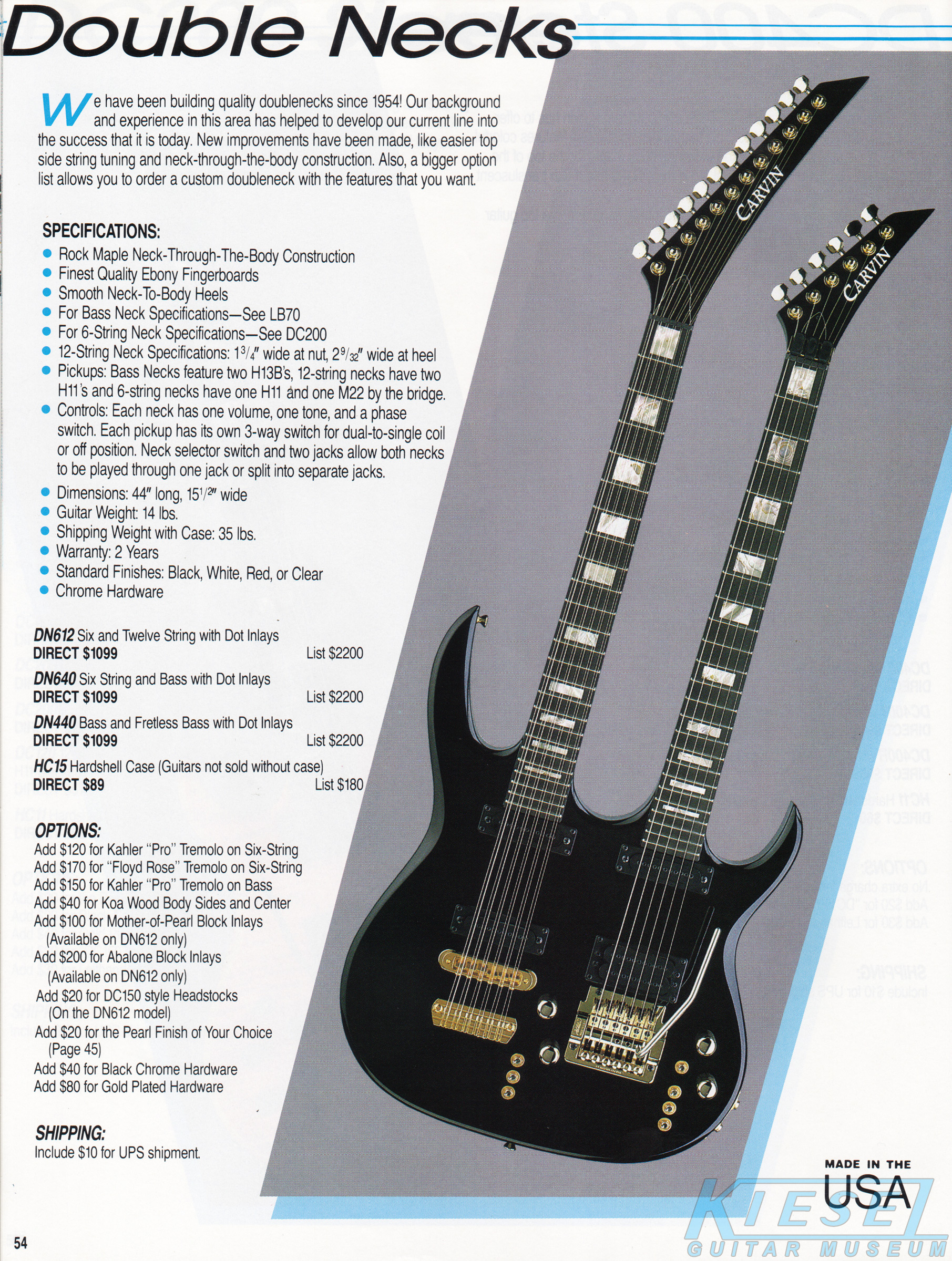 Like the DC120, the DN612 doubleneck sported one of the most unusual features ever seen on a Carvin guitar - the 12-inline headstock, which was standard along with a 6-inline headstock. This one feature made this guitar instantly recognizable as a Carvin, but traditional 6 X 6 and 3 X 3 headstocks were available if desired. The upper horn was longer than the DC200 to balance out the extended headstock (in previous years the DN shared the same dimensions), and the 12-string neck used the older Schaller bridge/tailpiece combination. Electronics consisted of dual H11 stacked humbuckers on the 12-string, and one M22 and one H11 on the 6-string. Each neck had single volume and tone controls, phase switch, and dual coil/single coil/off switch for each pickup. The DN640 featured the same configuration, with H13B pickups on the bass neck. On both models, there was an input for each neck. Base price on the DN612 and DN640 was $1099, and the HC15 case was $89. The catalog photo showed the DN612 in black, with optional abalone block inlays, Kahler Pro tremolo and gold hardware.