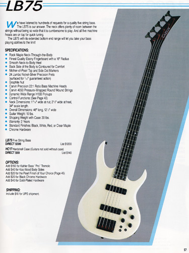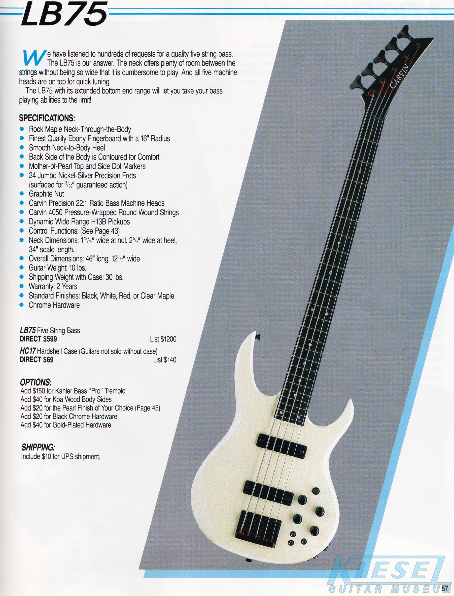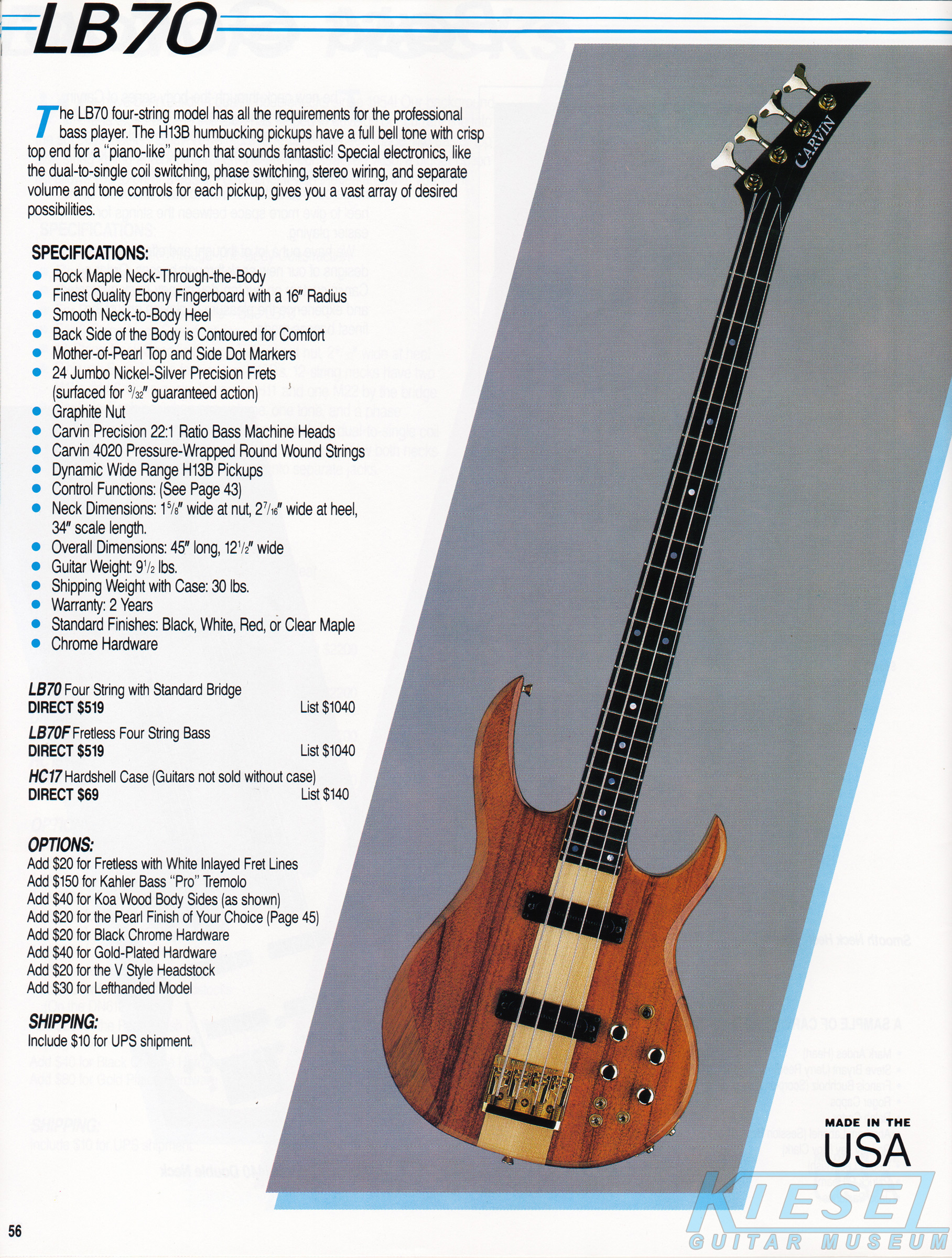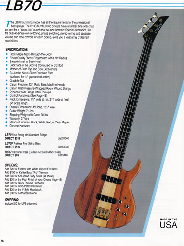 The LB70 bass was reintroduced as a replacement to the LB60 to become the flagship Carvin bass. At 9.5 pounds, it was light and extremely well-balanced, despite the longer neck. Electronics consisted of dual H13B stacked humbuckers, dual volume/tone controls, coil splitters, phase switch and 3-way pickup selector. The LB70 started at $519, plus $69 for the case. For the first time, a Kahler bass tremolo was offered for an additional $150. Also for the first time, Carvin also offered a 5-string model, the LB75 bass. The LB75 offered the same features and options as the LB70, with the exception of the "V" headstock, and fretless neck. The Kahler bass tremolo was offered, but a left-handed LB75 was not. The LB75 started at $599, plus $69 for the case. The LB70 was shown in koa with chrome hardware, and the LB75 was shown in Pearl White with black hardware.