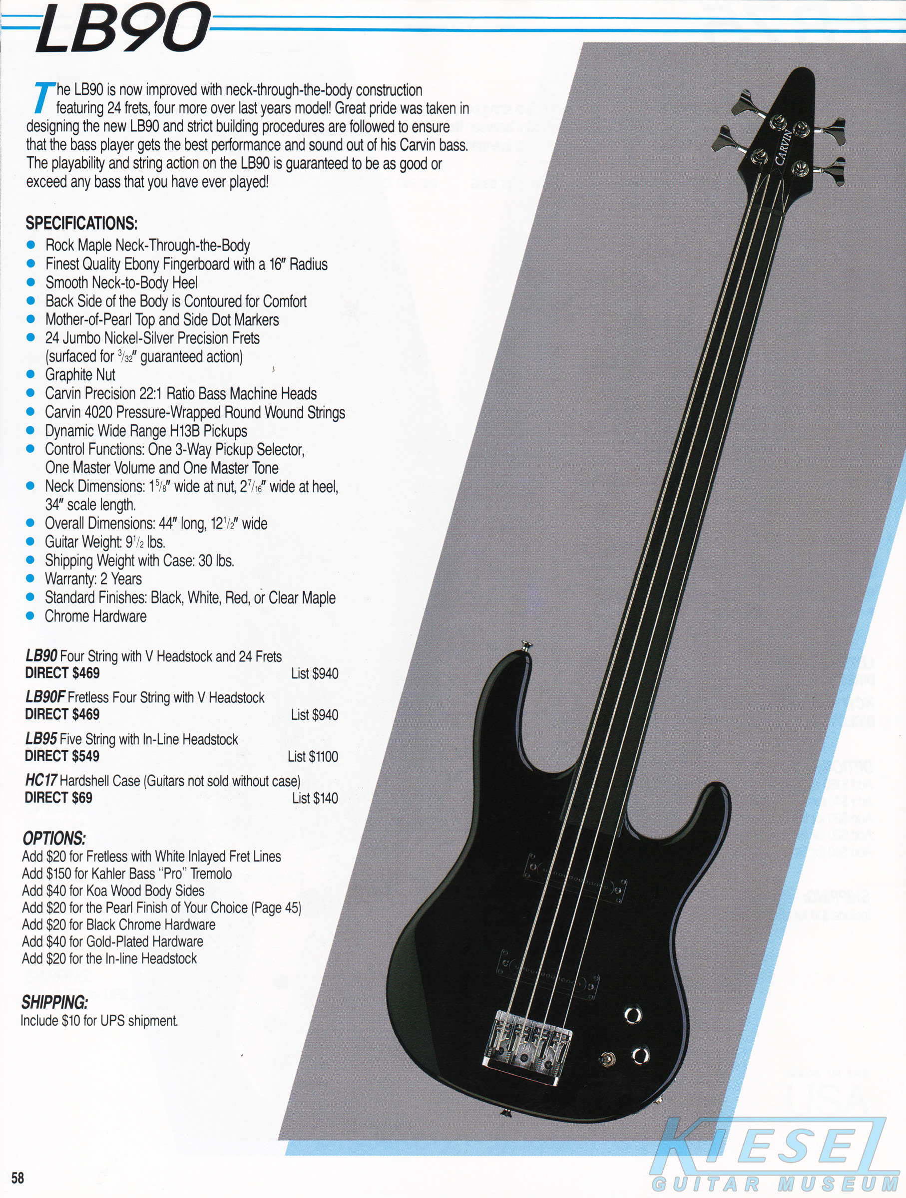 The LB90 bass was Carvin's "entry-level" bass for '88. Despite costing less then the LB70, it still sported the same pro features, but with mono electronics (single volume and tone controls, and no phase switches, mono output). The "V" headstock was standard, but the inline headstock could be ordered as an option. Carvin also offered the LB95, which was a 5-string version with an inline headstock. It was not shown in the catalog. The body of both these models was a more rounded style, versus the DC200 inspired body on the LB70 and LB75. The LB90 could be ordered fretless, but not the LB95, and neither model was available in a left-handed version. The LB90 base price was $469, and the LB95 base price was $549. The catalog showed the LB90 in Jet Black.