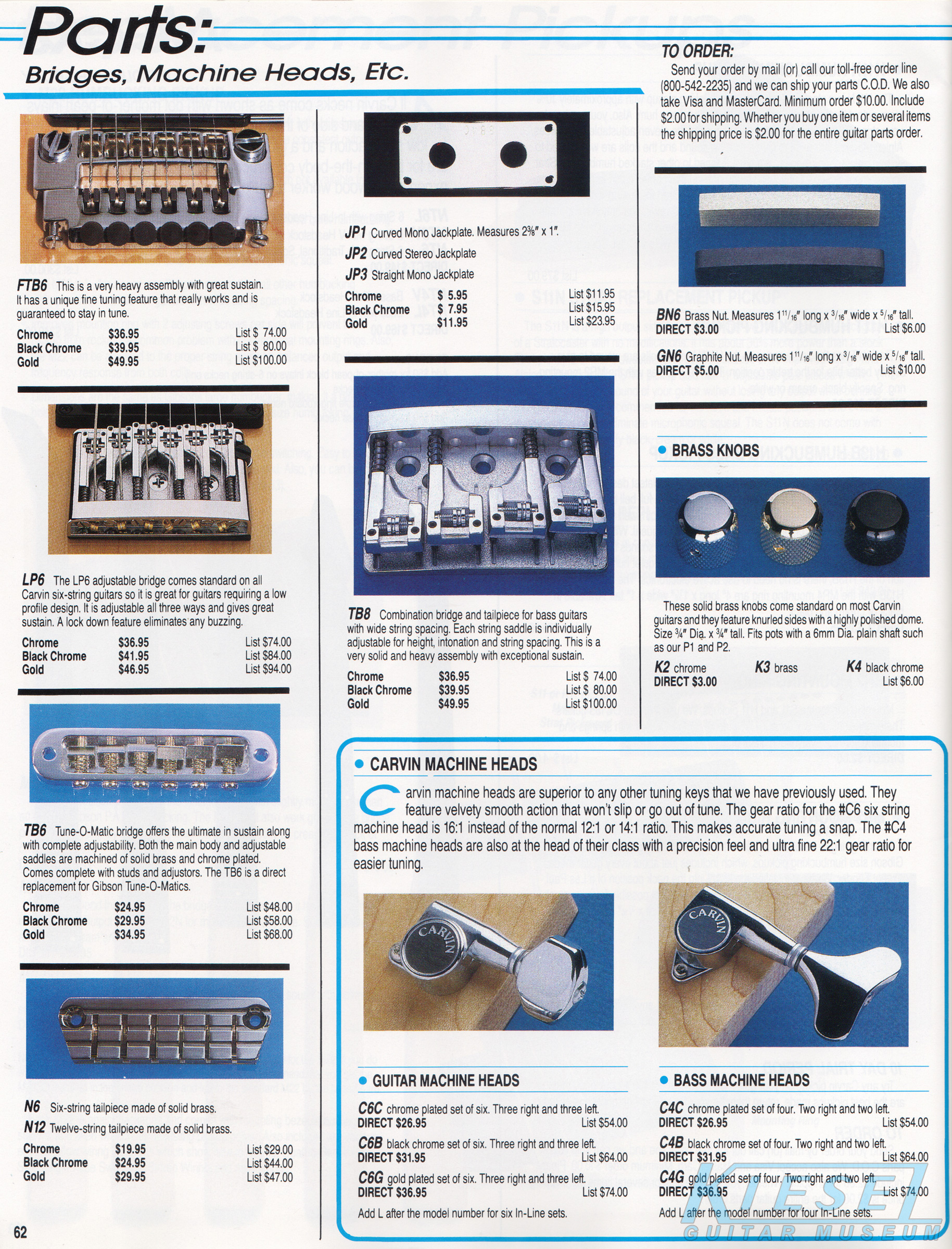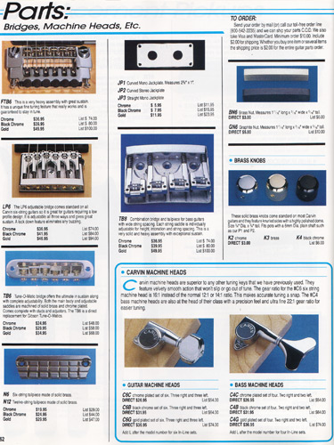 Carvin guitars got a new standard fixed bridge in 1988 - the LP6. Only the 12-string models continued to use the N12 tailpiece and TB12 bridge that had been used since 1983. This bridge would only be standard in 1988, and would be replaced by the 2-piece Gibson-style tune-o-matic bridge with stopbar tailpiece. Like other hardware, it was available in chrome (standard), gold or black chrome. The FTB6 was still offered in the parts department, and presumably was still standard on the SH225.
