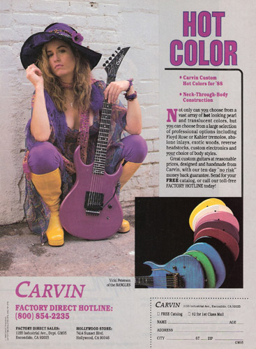 The ad in the 1988 Catalog Gallery above features Vicki Peterson of The Bangles with a Pearl Purple DC125. It appeared in a 1988 issue of Guitar for the Practicing Musician.
