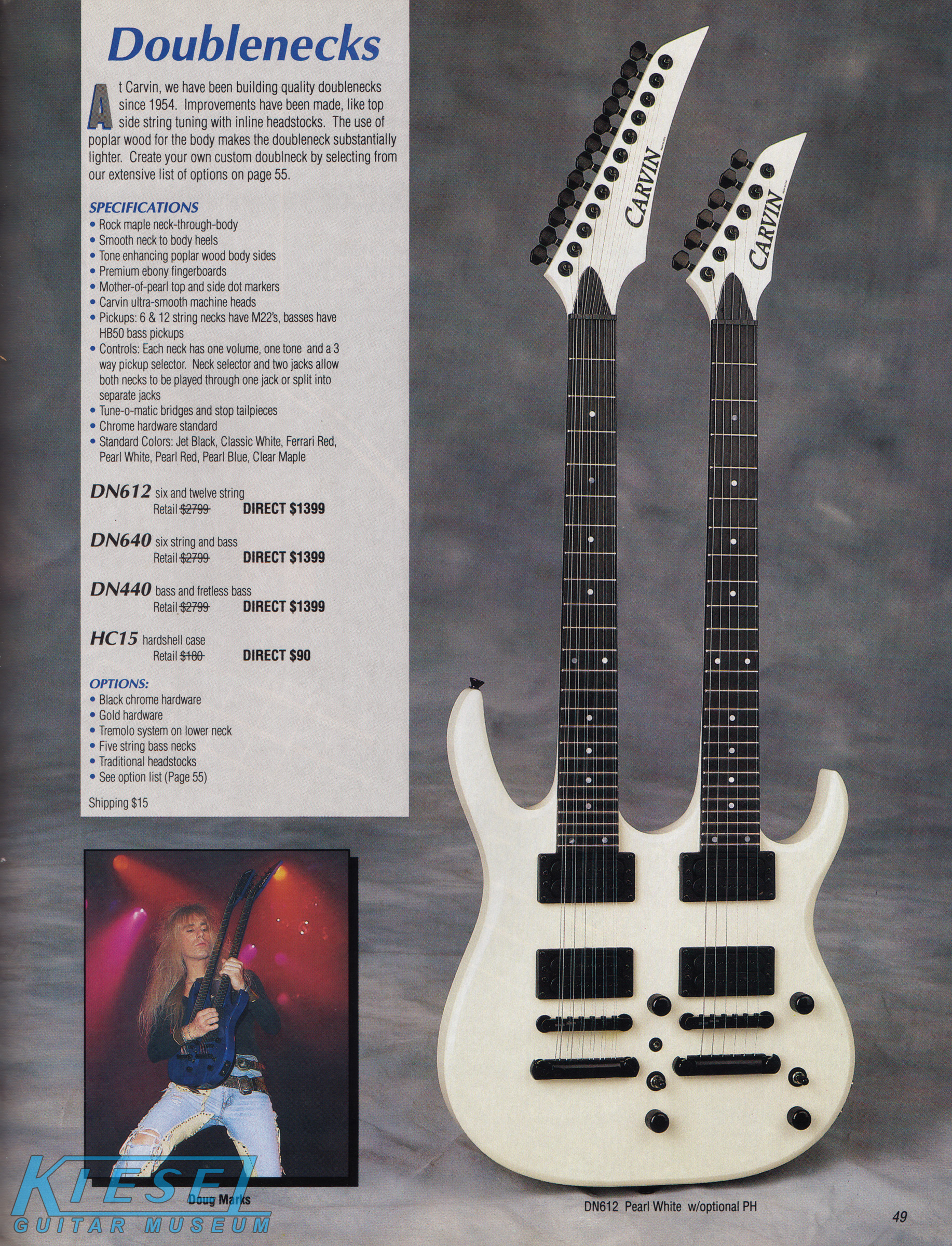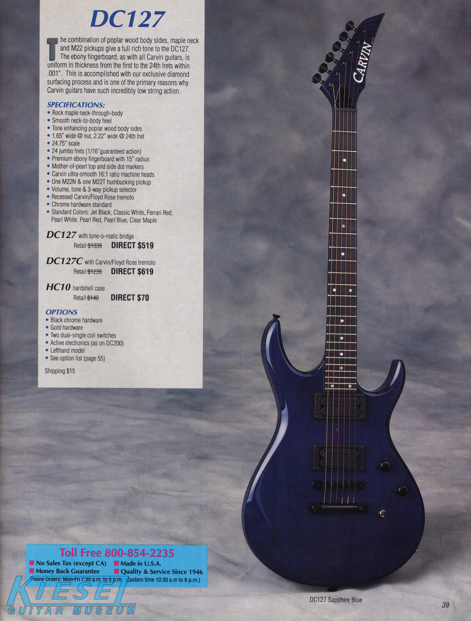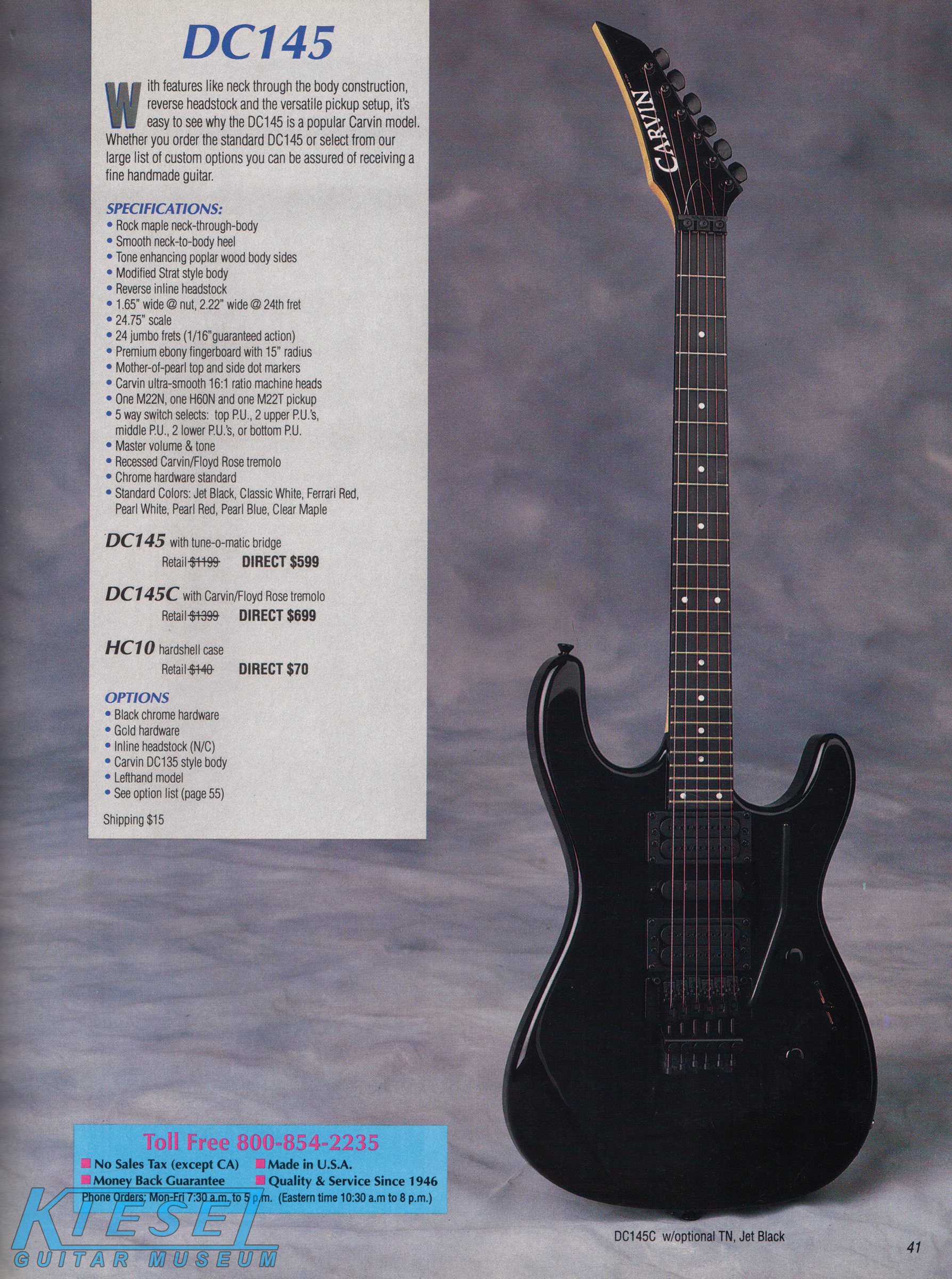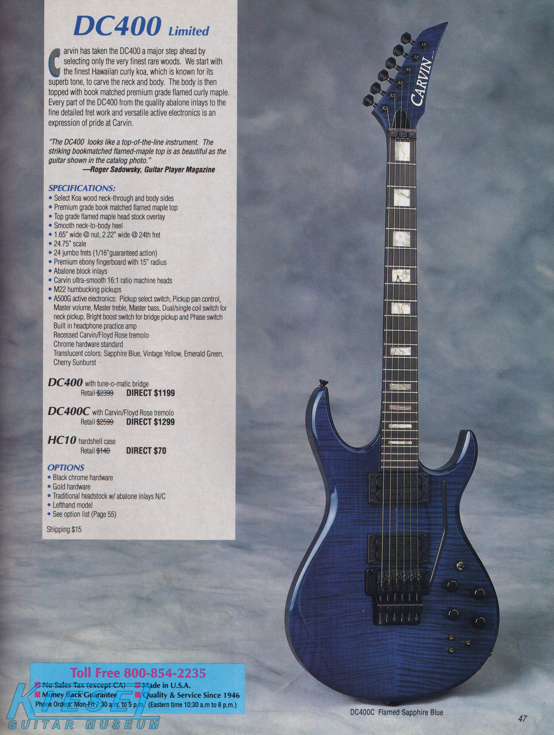 The DC200 and DC400 were essentially the same as the 1990 models, but the DC200 got the M22T and M22N pickups standard, and was made with a poplar body and maple neck. The DC400 continued using the standard M22 pickups, but had a standard koa body and koa neck. Base price on the DC200 was $669 ($769 with tremolo), and the DC400 was $1199 ($1299 with tremolo). The catalog showed the DC200 in tung-oiled koa with maple neck and gold hardware, and the DC400 was shown in flamed Sapphire Blue with licensed Carvin Floyd Rose tremolo and black hardware.