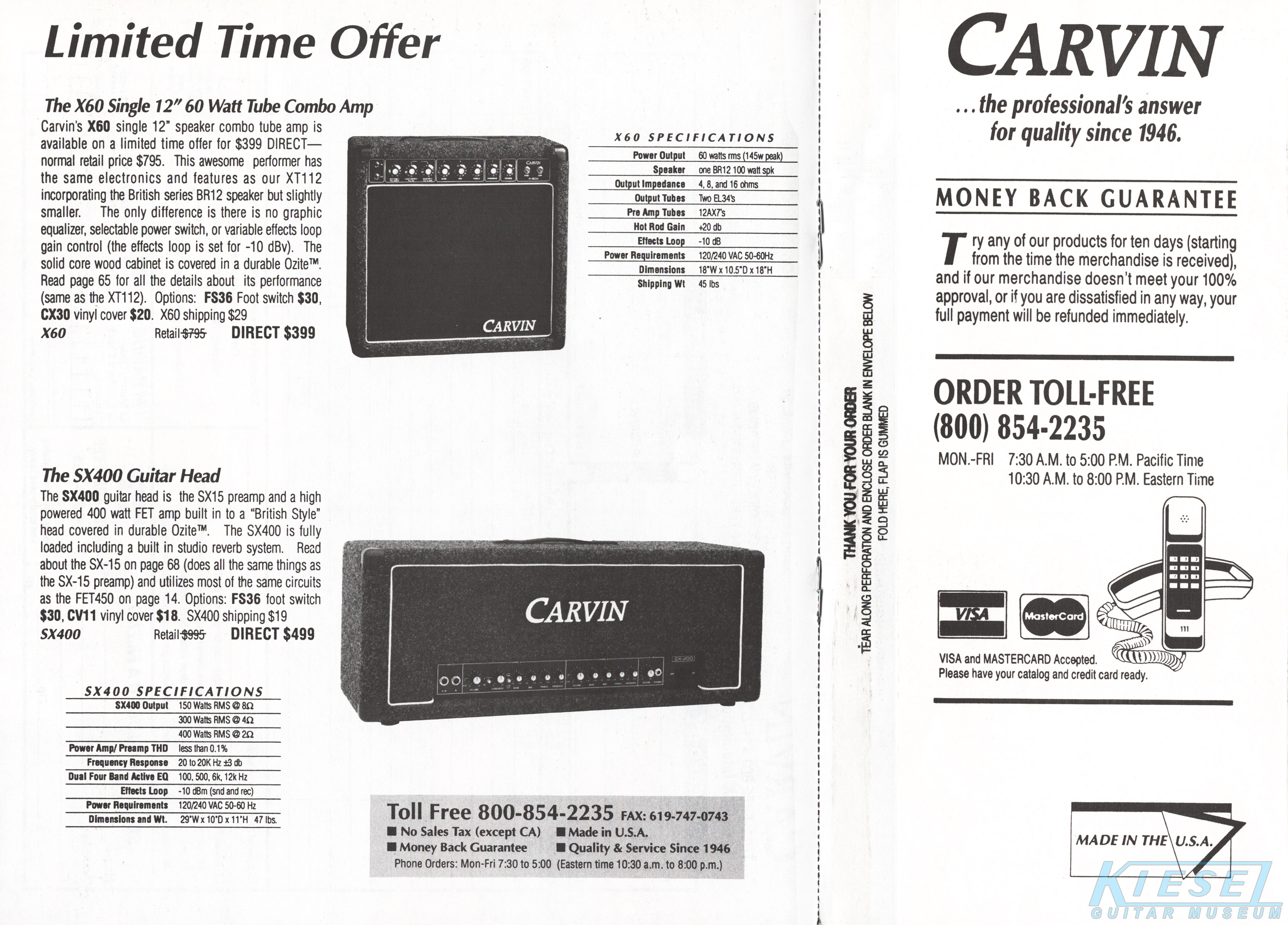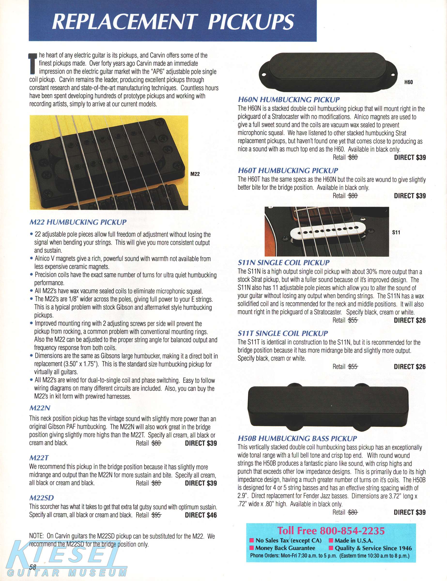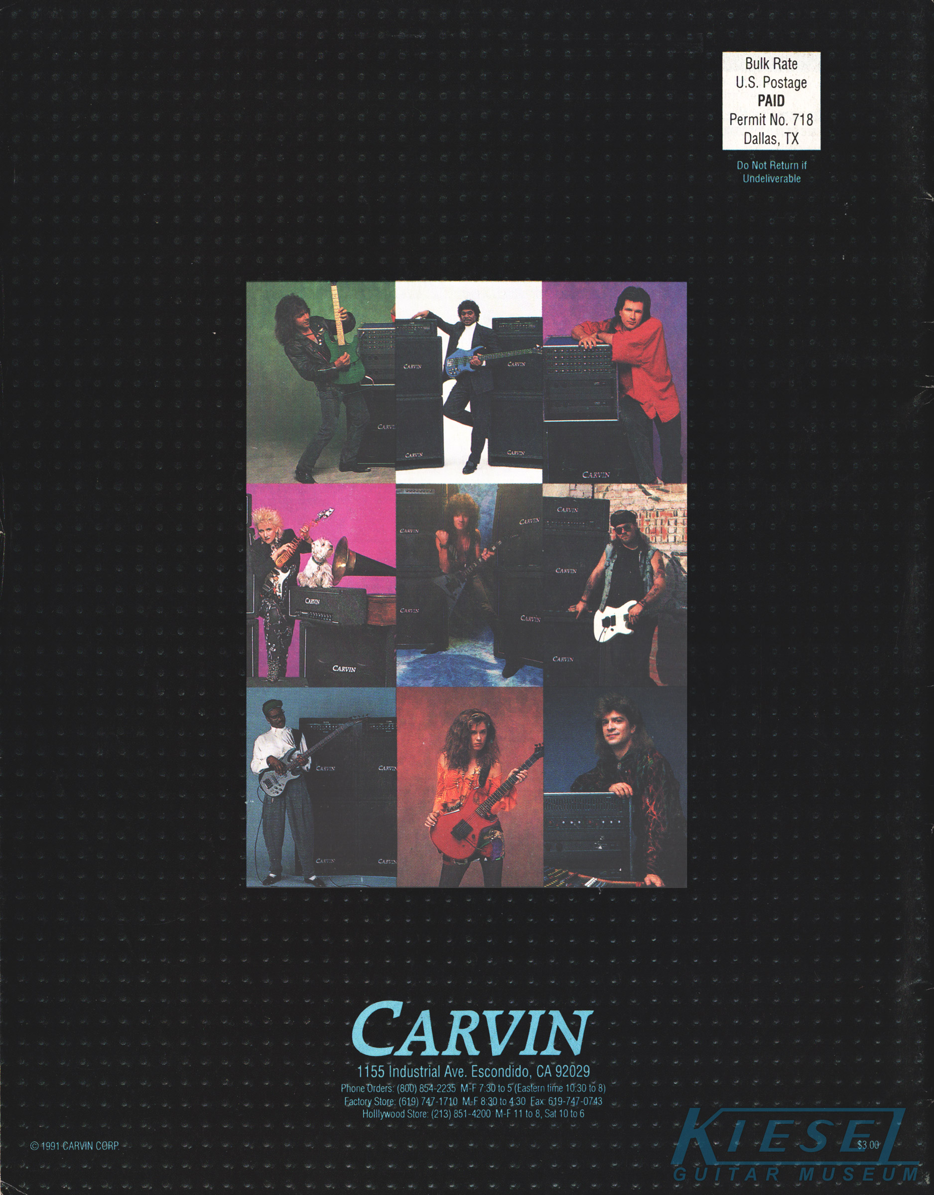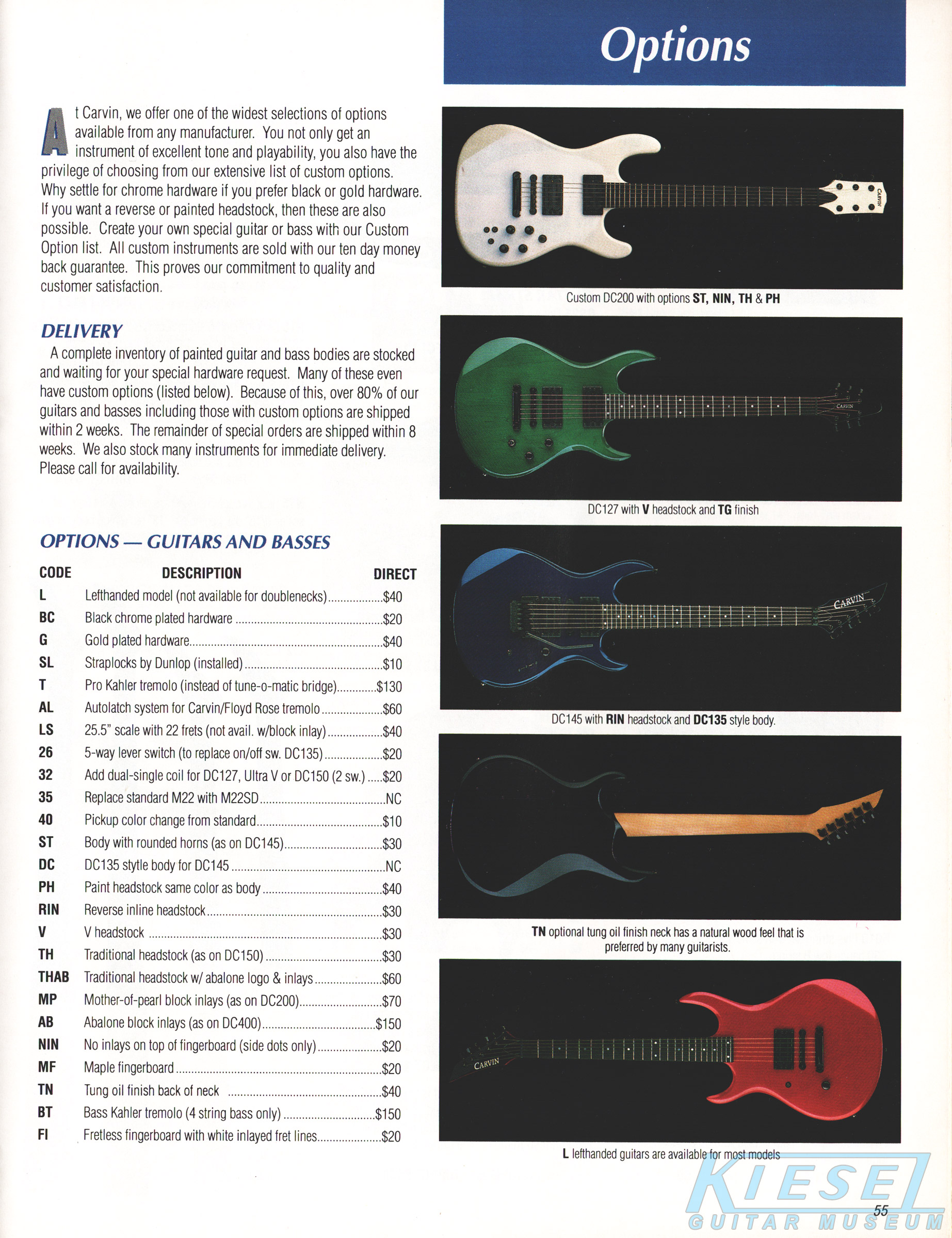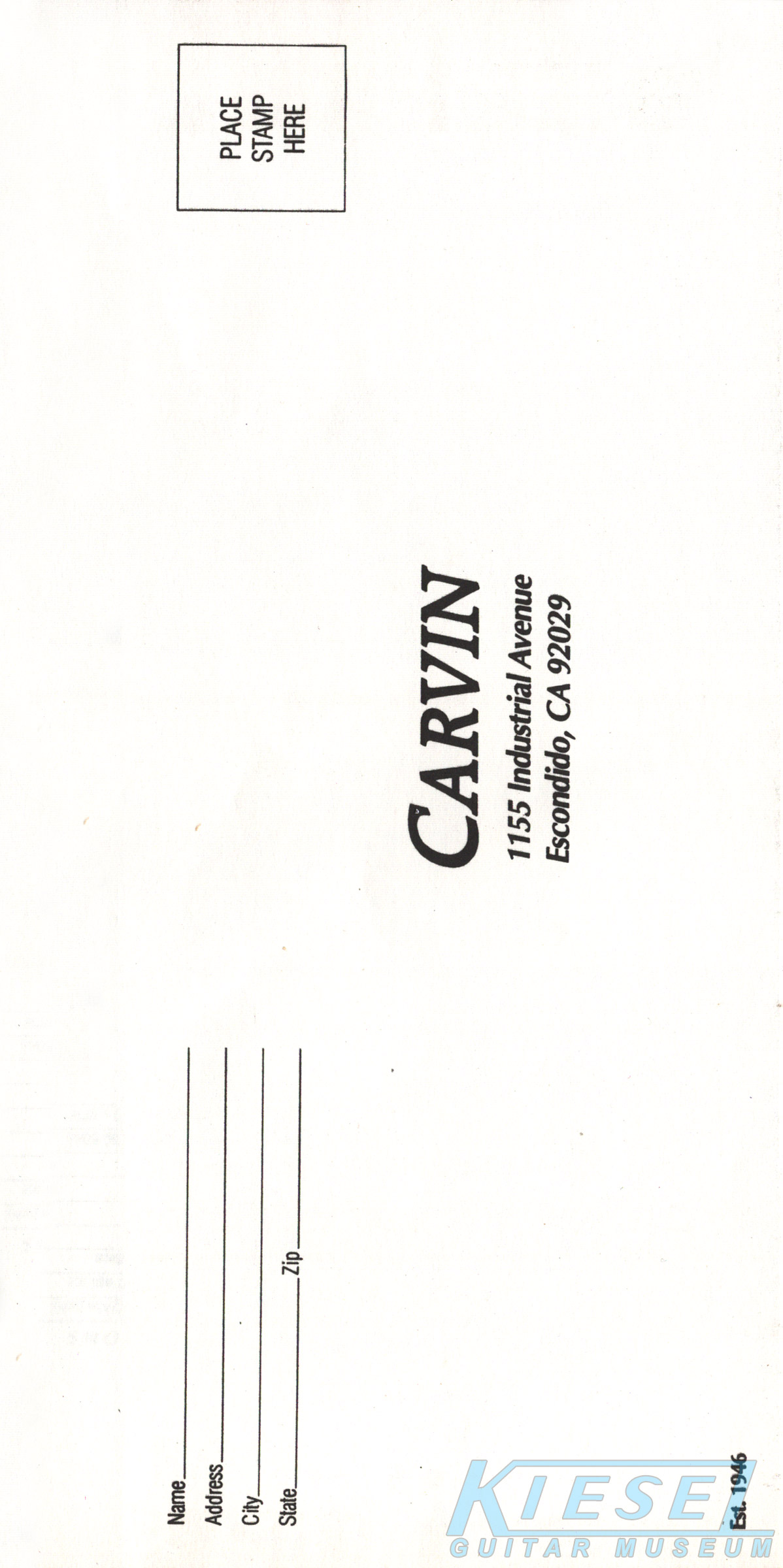 The DC200 and DC400 were essentially the same as the 1990 models, but the DC200 got the M22T and M22N pickups standard, and was made with a poplar body and maple neck. The DC400 continued using the standard M22 pickups, but had a standard koa body and koa neck. Base price on the DC200 was $669 ($769 with tremolo), and the DC400 was $1199 ($1299 with tremolo). The catalog showed the DC200 in tung-oiled koa with maple neck and gold hardware, and the DC400 was shown in flamed Sapphire Blue with licensed Carvin Floyd Rose tremolo and black hardware.