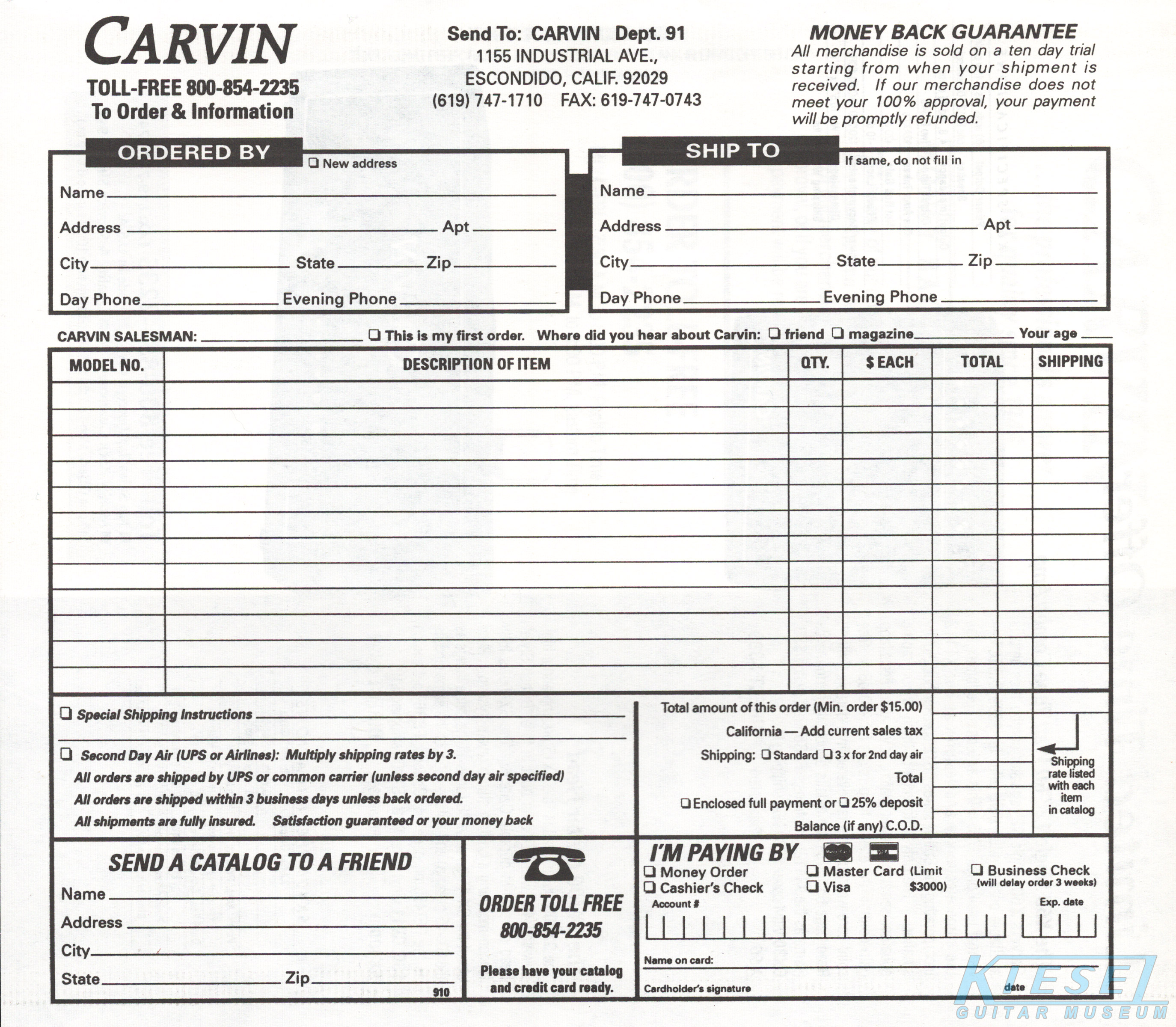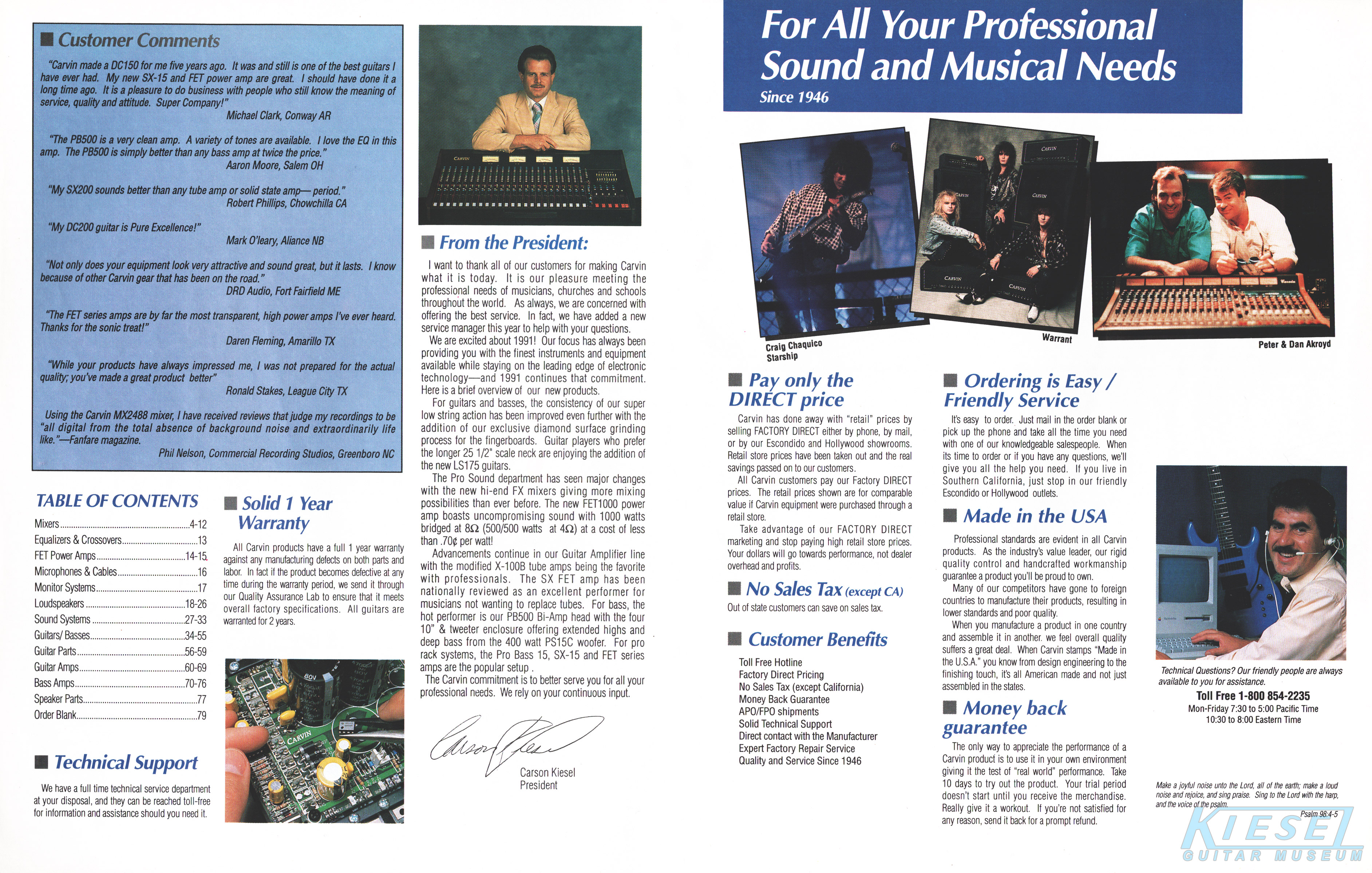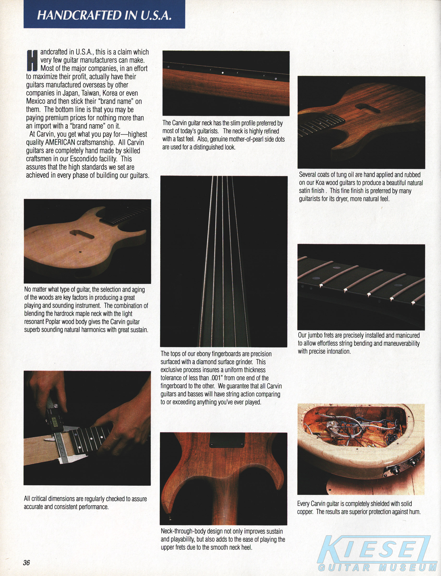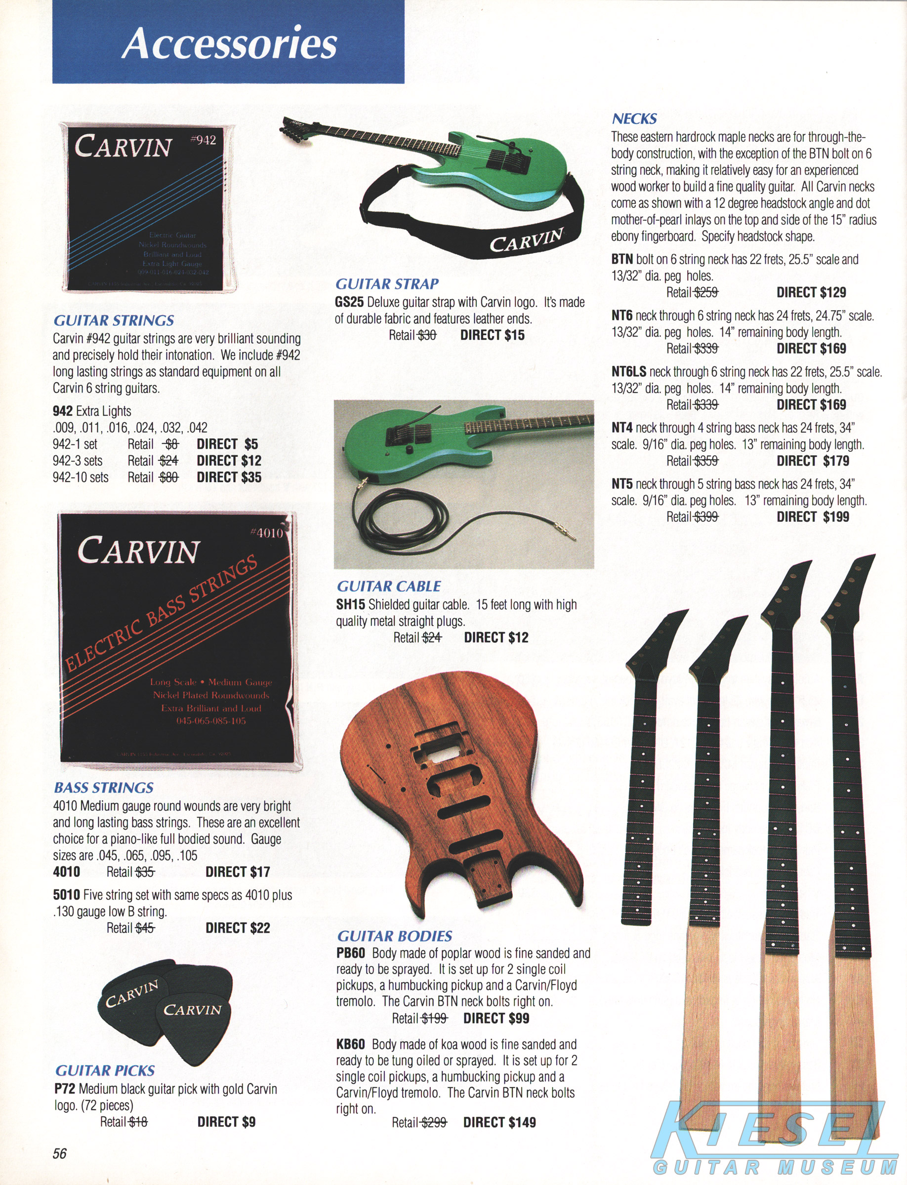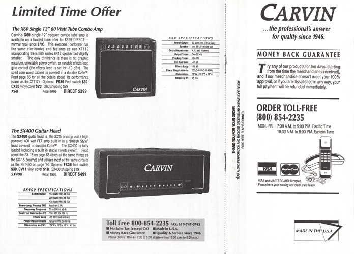 The DC200 and DC400 were essentially the same as the 1990 models, but the DC200 got the M22T and M22N pickups standard, and was made with a poplar body and maple neck. The DC400 continued using the standard M22 pickups, but had a standard koa body and koa neck. Base price on the DC200 was $669 ($769 with tremolo), and the DC400 was $1199 ($1299 with tremolo). The catalog showed the DC200 in tung-oiled koa with maple neck and gold hardware, and the DC400 was shown in flamed Sapphire Blue with licensed Carvin Floyd Rose tremolo and black hardware.