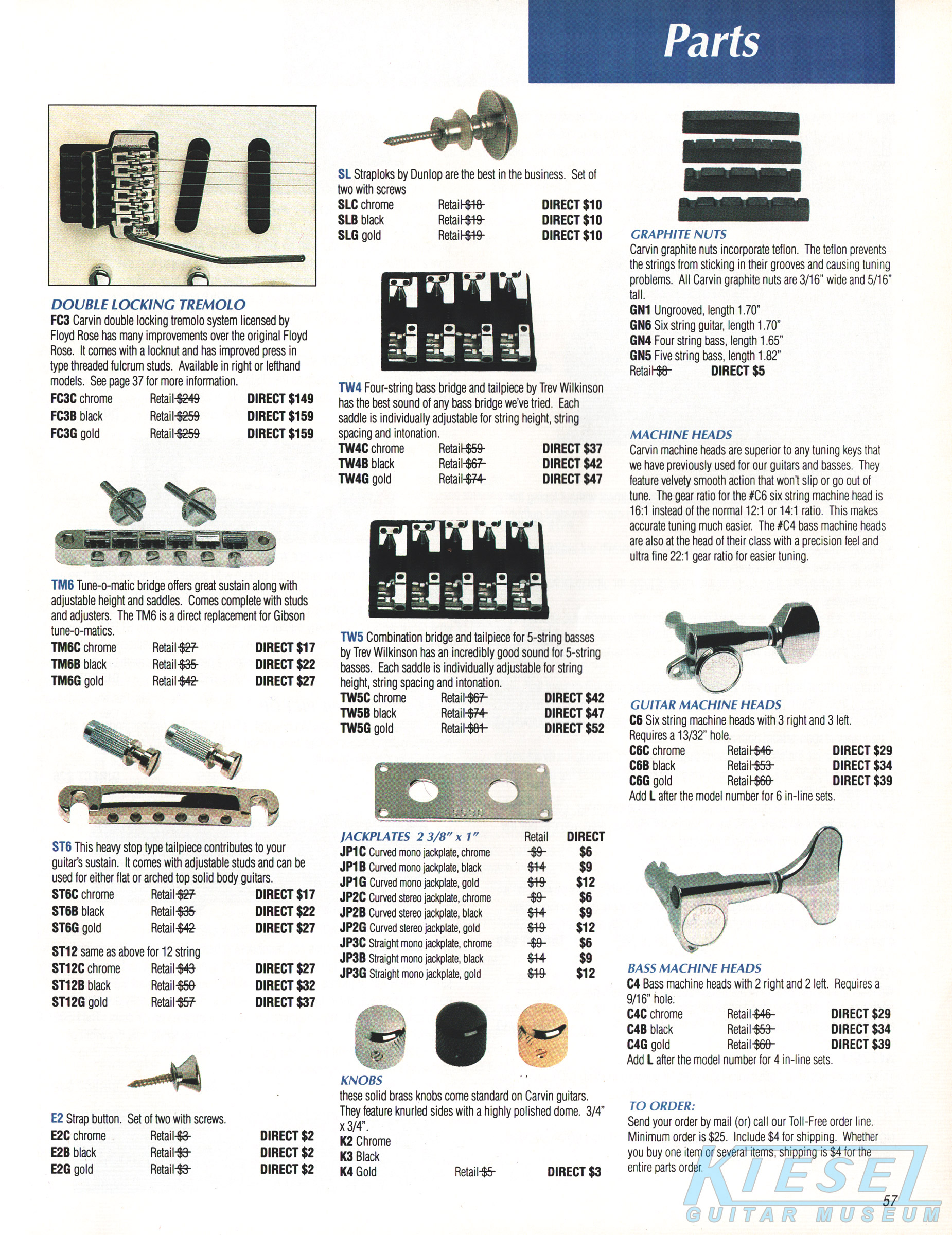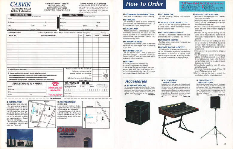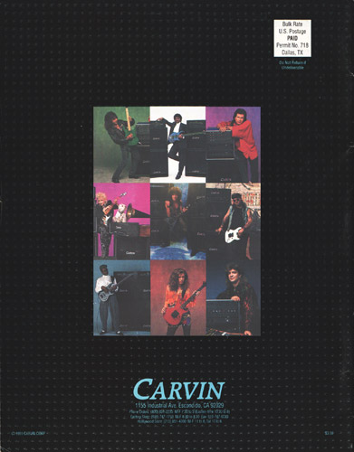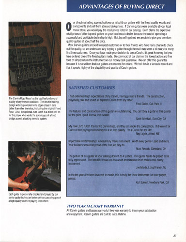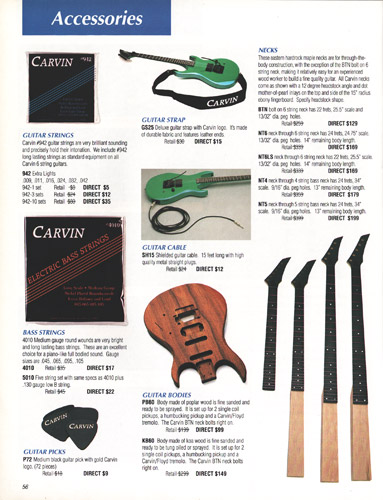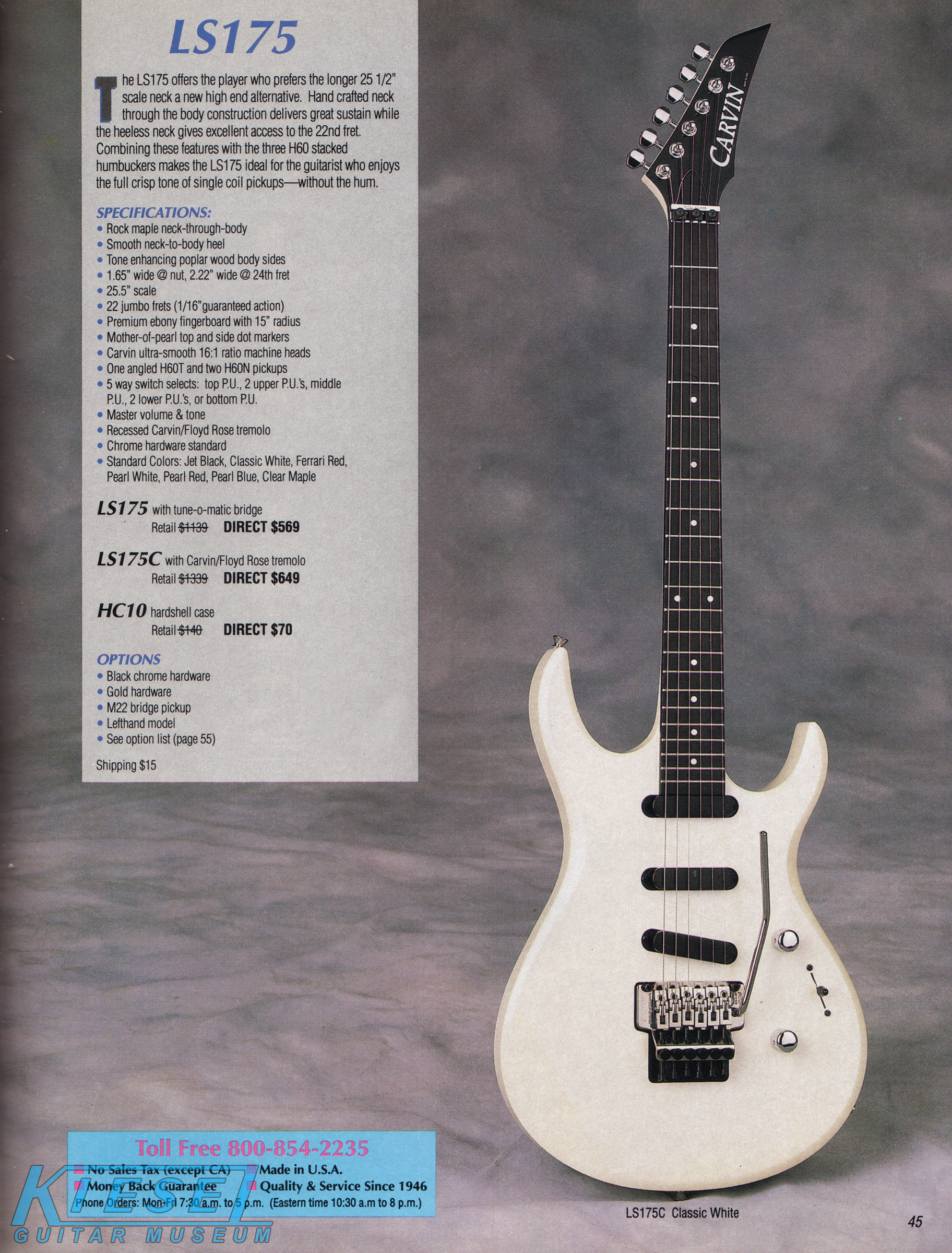 All new for 1991 was the LS175. Presumably, like 1991's BC130, this new model was not well-received, because it only lasted one year. Like the quick-to-exit BC130, the LS175 gave guitarist something totally different than all of Carvin's other models - in this case, a 25 1/2" scale, 22-fret fingerboard, similar to a Fender Stratocaster. Even the pickup arrangement was similar to the Strat, with the bridge pickup mounted at an angle. Whatever the reason for the hasty exit, it was an innovative gamble, whether it succeeded or not. Base price on the LS175 was $569, or $649 with Carvin Floyd Rose tremolo. The HC10 hardshell case was $70. The catalog showed the LS175 in Classic White with Carvin Floyd Rose tremolo and chrome hardware.