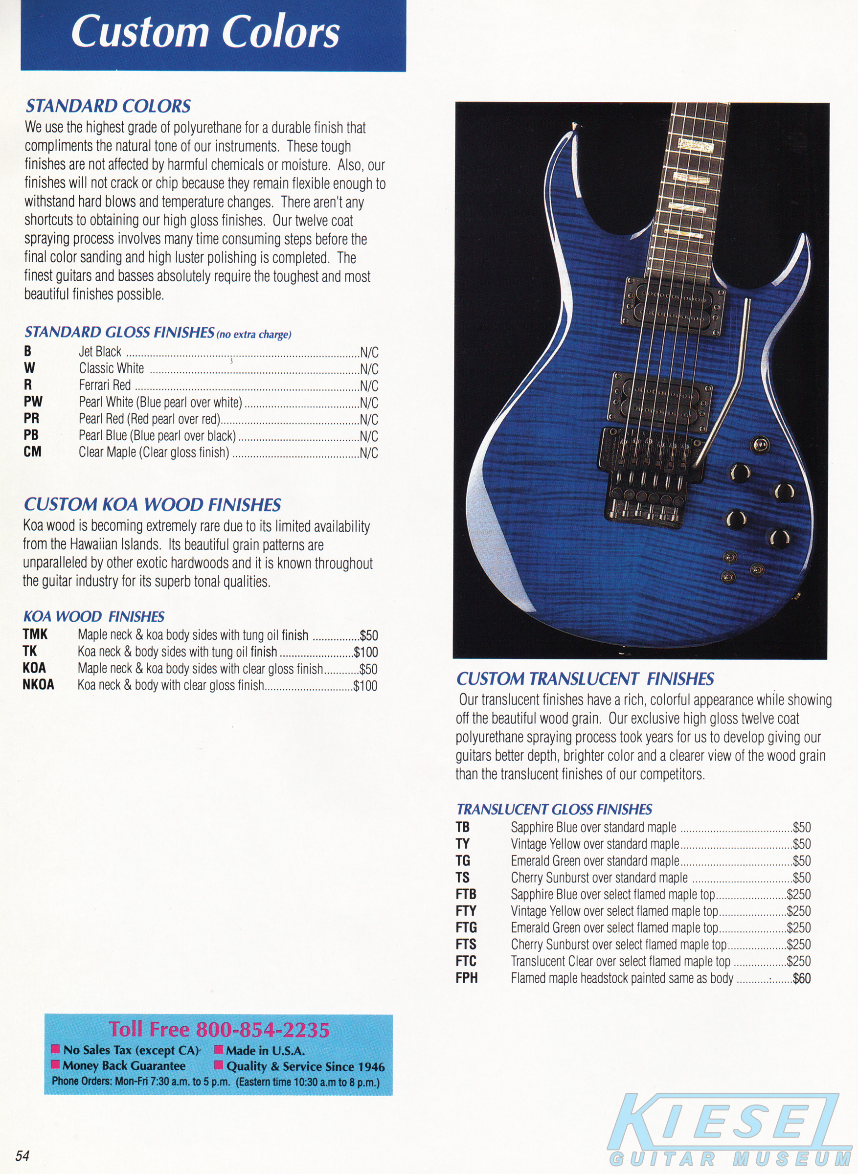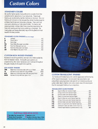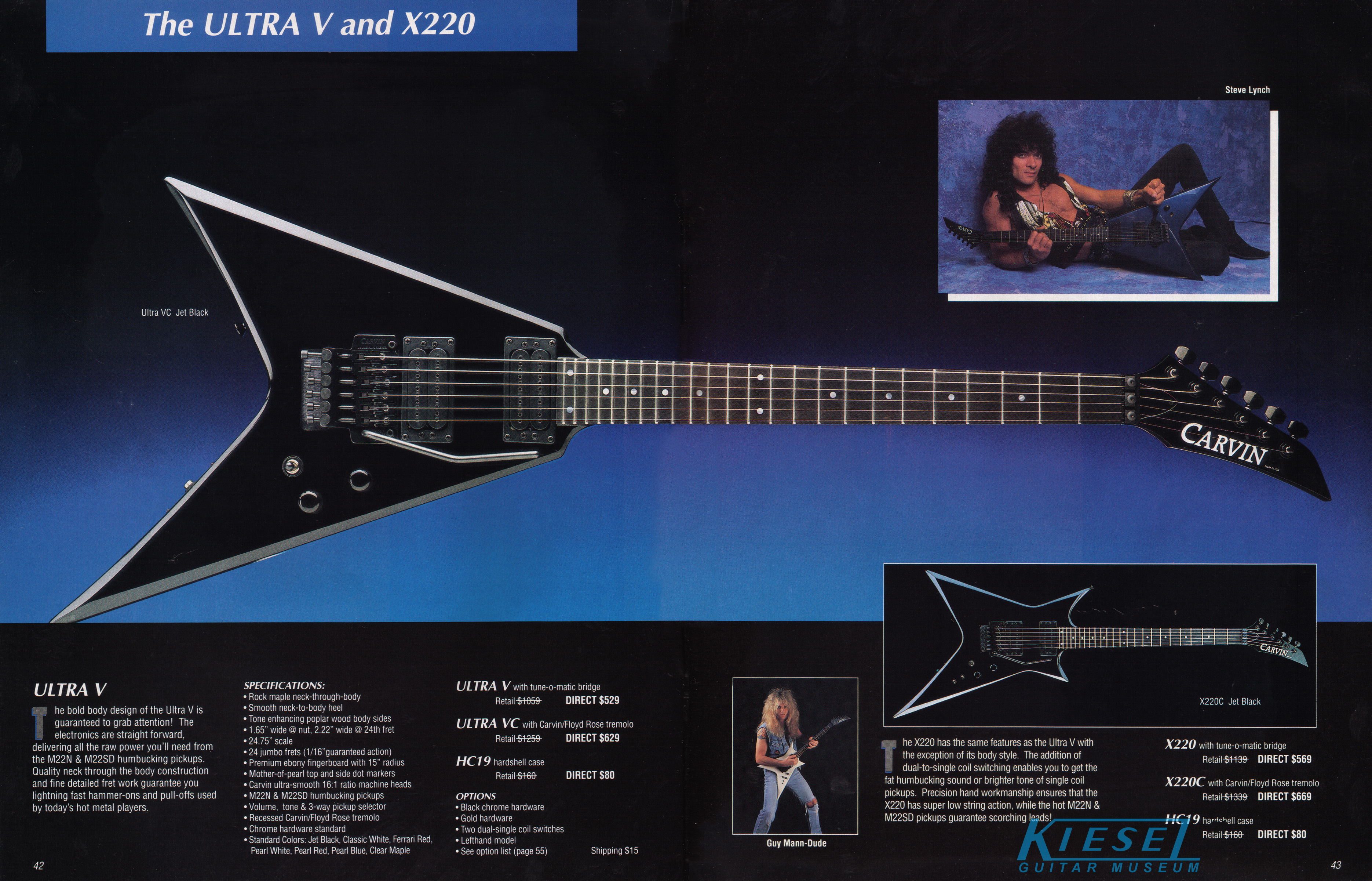 The Ultra V remained unchanged, but was treated to a two-page spread in the catalog, with the X220 inset on the same page. On both models, the M22T pickup replaced the M22 that was used in the neck position in 1991. M22SDs were still used in the bridge position. Coil splitters were still optional, but the A500G active electronics upgrade was not offered. All other options were available. Base price on the Ultra V was unchanged at $529, or $629 with tremolo. The X220 was also priced the same, at $569, or $669 with tremolo. The HC19 hardshell case for either was $80.