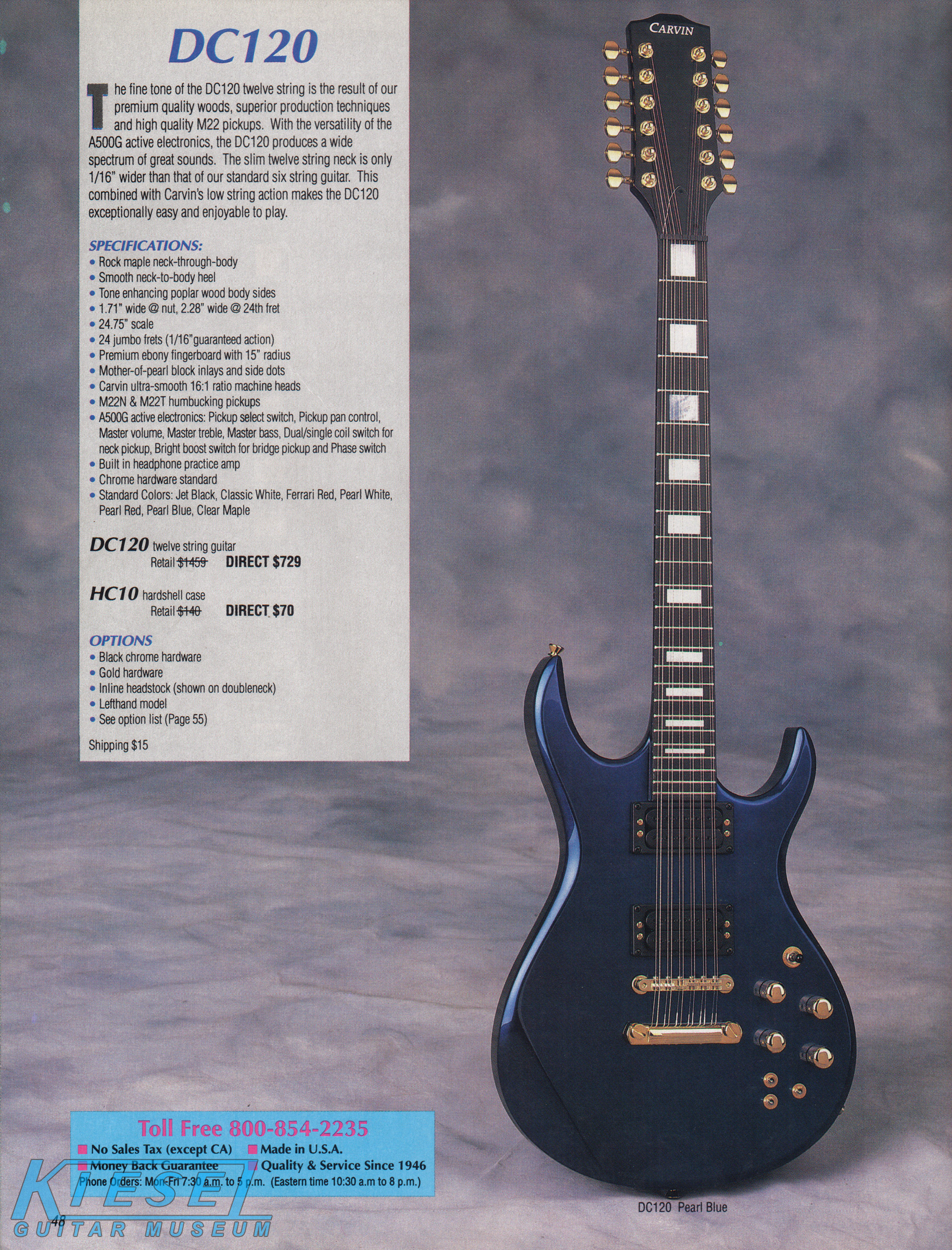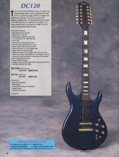 Although the DC120 12-string had been available for several years, it was never presented the same as other models - usually, it was just a footnote on the DC200 pages. In 1991, it got the full treatment. Construction was the same as other models, with poplar body sides and rock maple neck, ebony fingerboard with MOP block inlays standard, and 6X6 traditional headstock. The 12-inline headstock was optional. Base price on the DC120 was $729, plus $70 for the HC10 hardshell case. The catalog photo showed the DC120 in Pearl Blue with gold hardware.