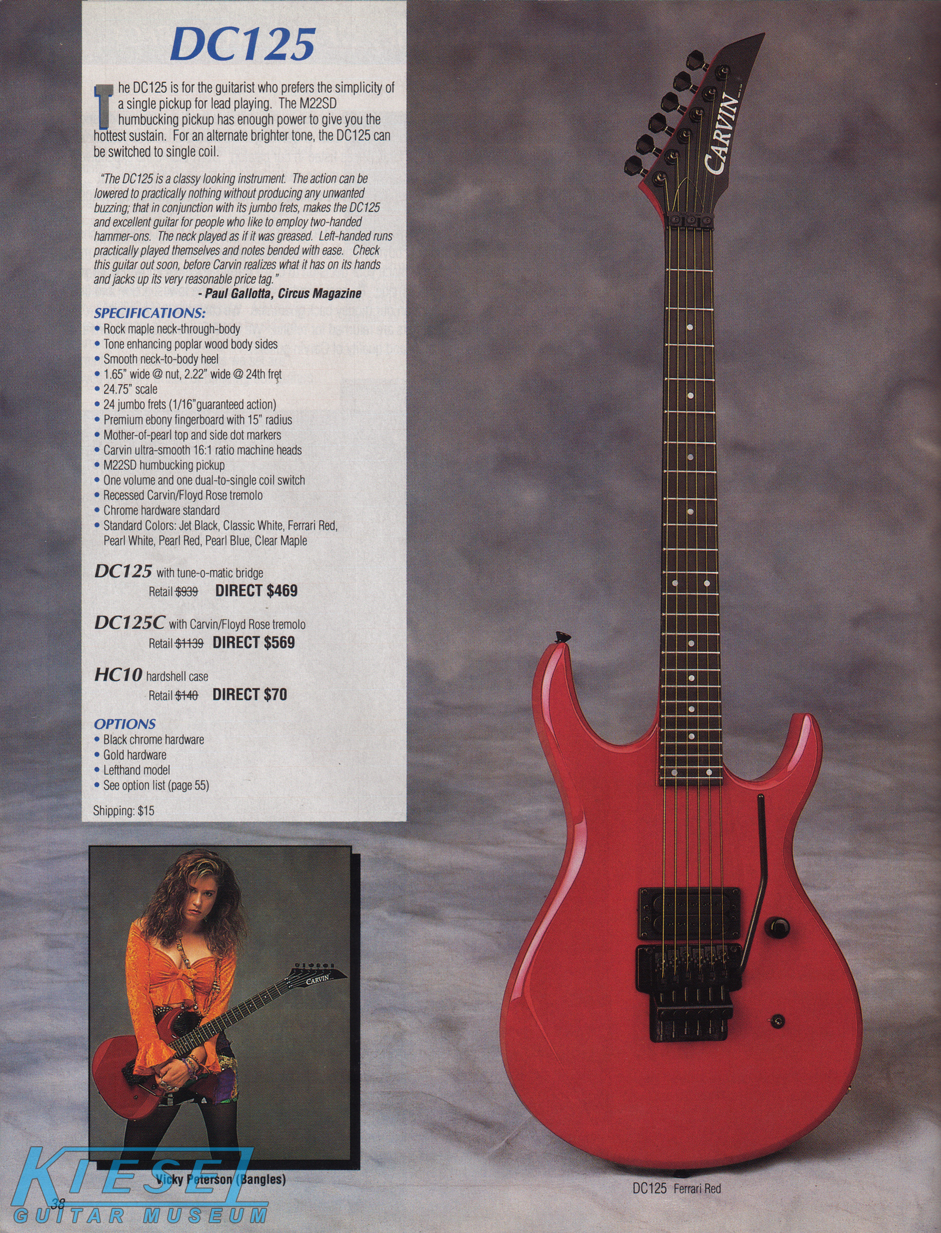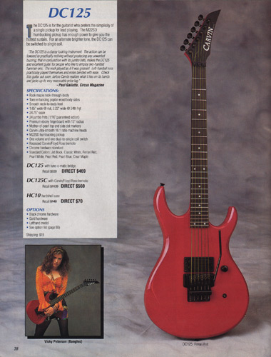 The DC125 was unchanged from 1990 - in fact, the model shown in '91 looks like the same one that was shown the previous year. Like all Carvins in 1991, the body was poplar, with rock maple neck-thru construction and ebony fingerboard with MOP dot inlays. Base price on the DC127 was $469, or $569 with Carvin Floyd Rose tremolo. The HC10 case was $70. The DC125 in the catalog was Ferrari Red, with licensed Carvin Floyd Rose tremolo and black hardware.