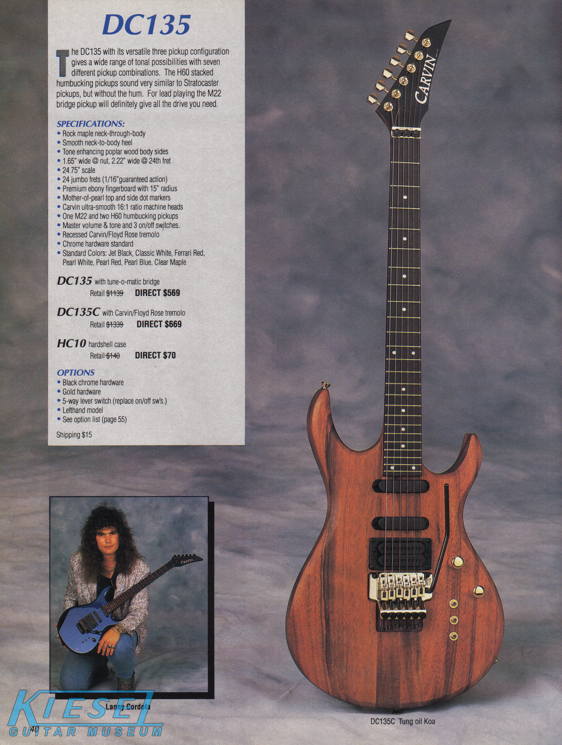 The DC135 was unchanged, using the same electronics and construction of it's predecessor. The base price of the DC135 was $569, or $669 with tremolo. The catalog photo showed a DC135 with tung-oiled koa body, tremolo, and gold hardware.