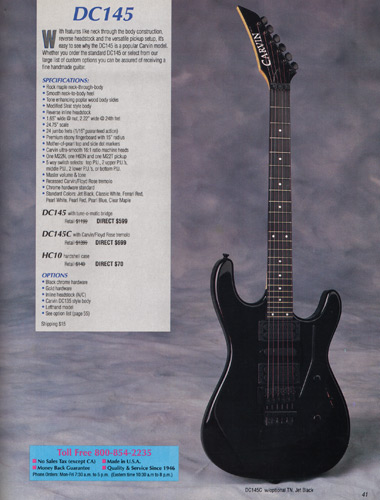 The DC145 was also unchanged, with the exception of the pickups - it now had an M22T, M22N and H60N. The rounded horn body style was standard, but it could be ordered with the more angular body style of the DC135. Base price on the DC145 was $599, or $699 with tremolo. The catalog showed the DC145 in Jet Black with tung-oiled neck, tremolo and black hardware.