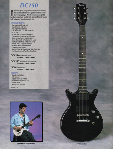 The DC150 reappeared in 1991, after a one-year hiatus from the catalog. Although the body shape and construction was the same as before, it was no longer stereo wired, and was reduced to single volume/tone controls, versus dual controls. M22N and M22T pickups were standard. The A500G active electronics package was optional. Base price on the DC150 was $499, or $599 with tremolo. The DC150 was shown in Jet Black with chrome hardware.