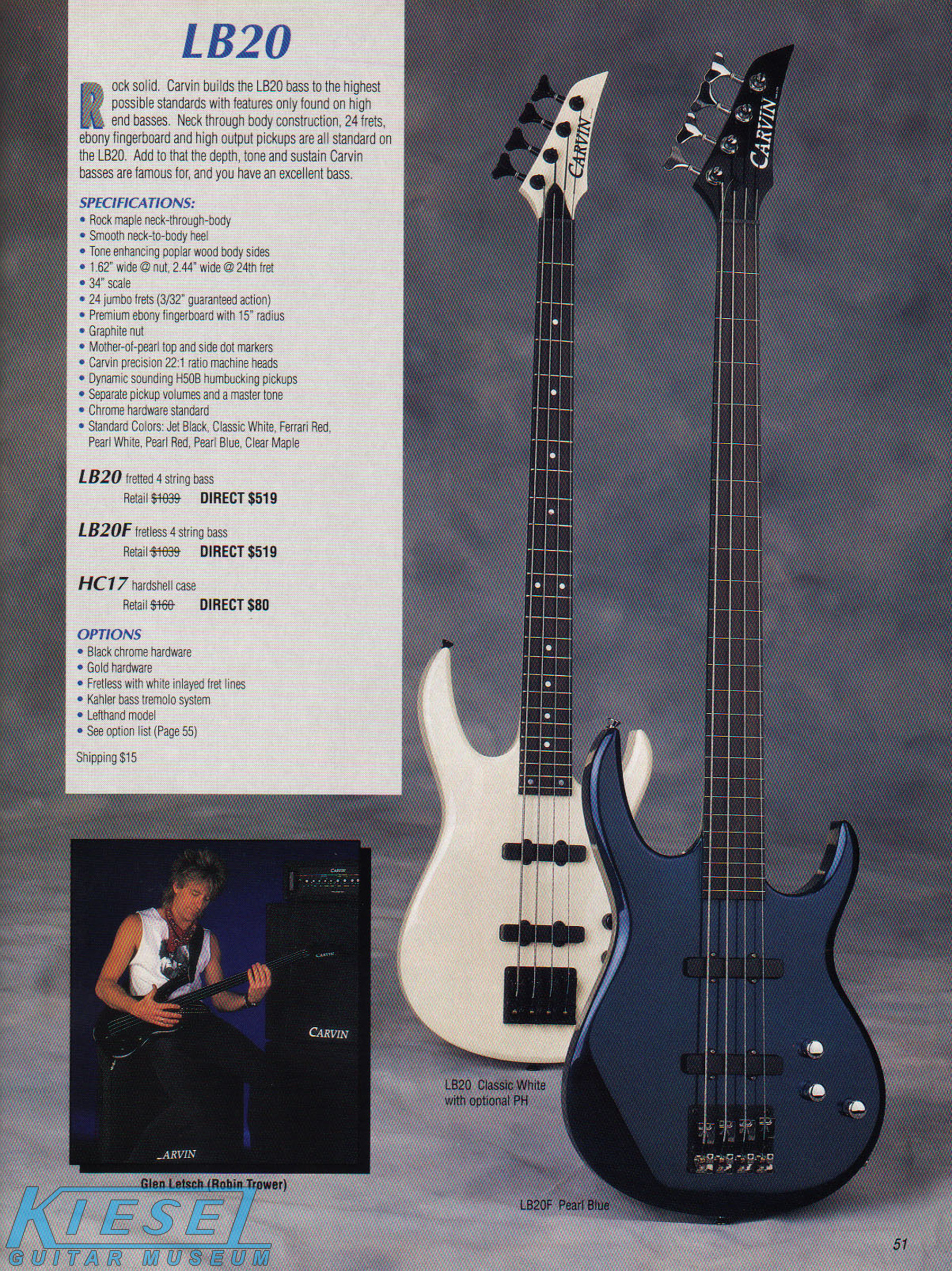 The passive LB20 remained Carvin's lowest-priced bass. The catalog showed a Pearl Blue LB20F fretless, with white fretlines on the fingerboard. Behind it is the standard LB20 in Classic White with matching headstock. Base price on this was $519.