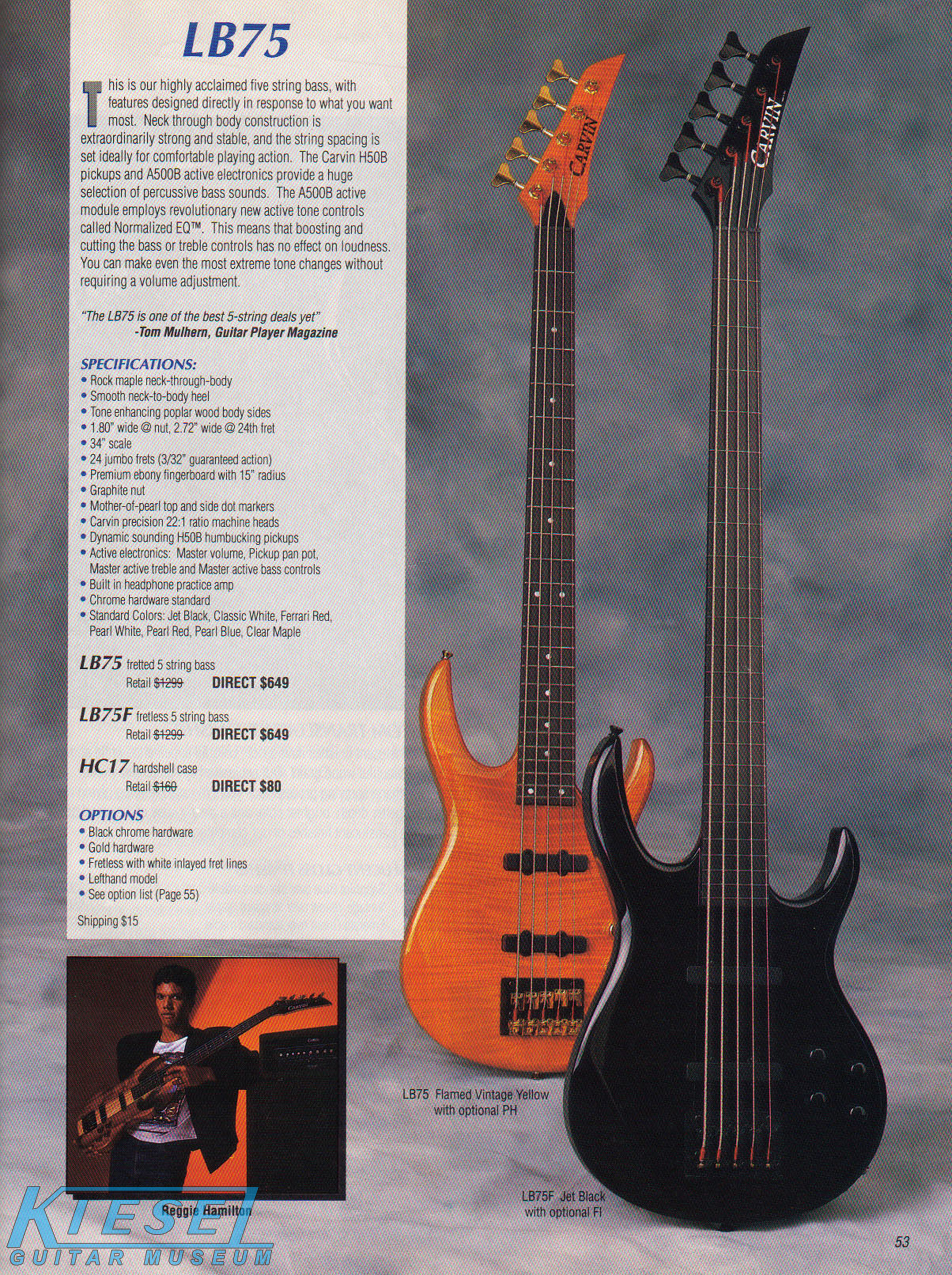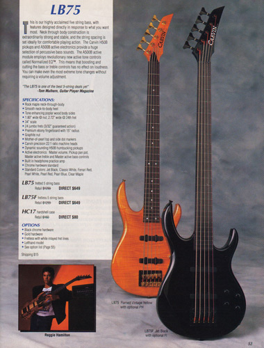 The LB75 was now a mainstay of the line, as 5-string basses became more popular, and had the same changes at teh LB70. Base price on the the LB75 was $649. The catalog showed an LB75 in translucent Vintage Yellow on flamed maple with matching headstock, and an LB75F fretless in Jet Black.