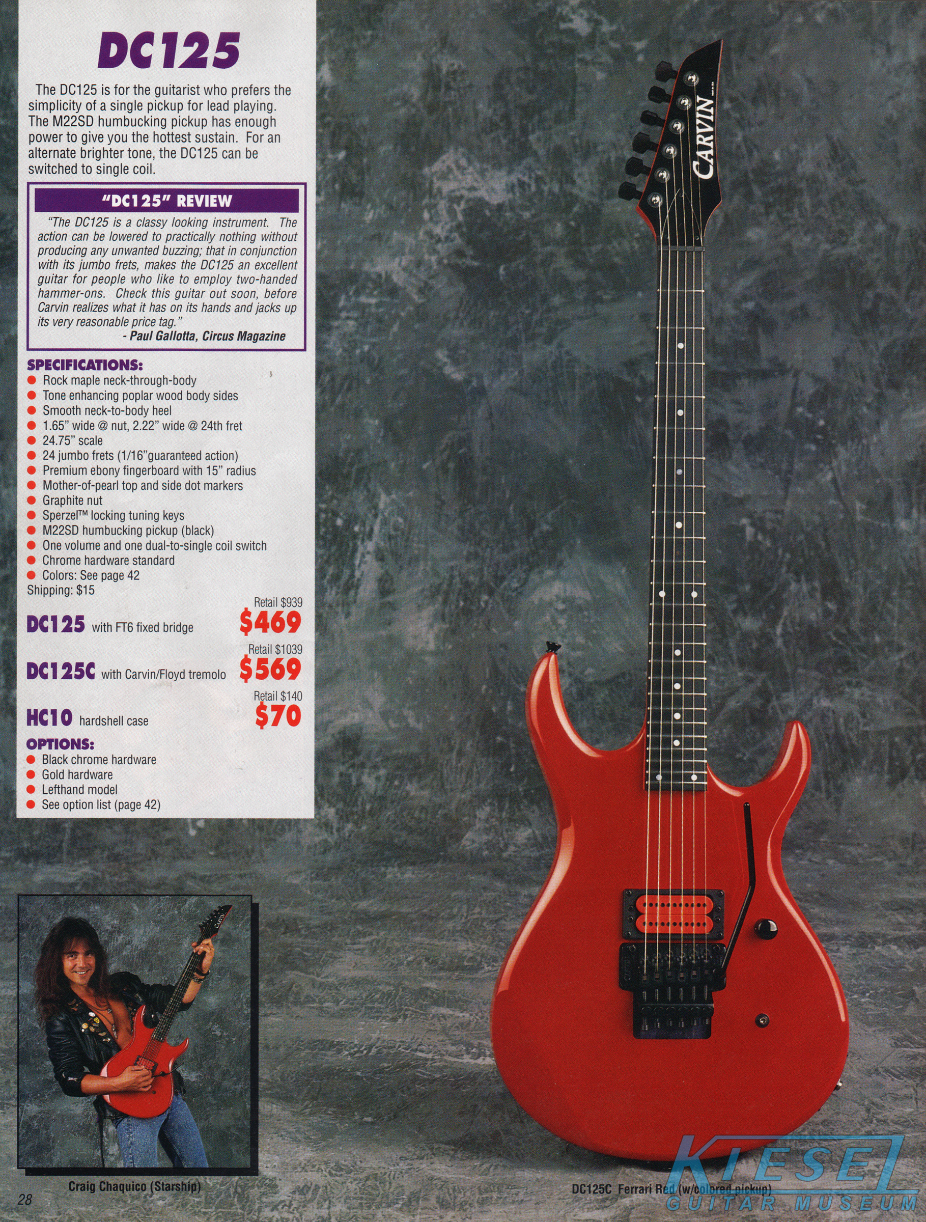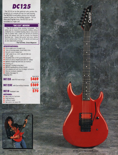 The DC125, like all Carvins in 1992, got a new headstock shape. As in 1991, the body was poplar, with rock maple neck-thru construction and ebony fingerboard with MOP dot inlays. Base price on the DC127 remained $469, or $569 with Carvin Floyd Rose tremolo. The HC10 case was $70. The DC125 in the catalog was Ferrari Red, with Carvin Floyd Rose tremolo, red M22SD pickup and black hardware.