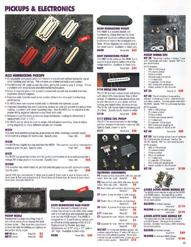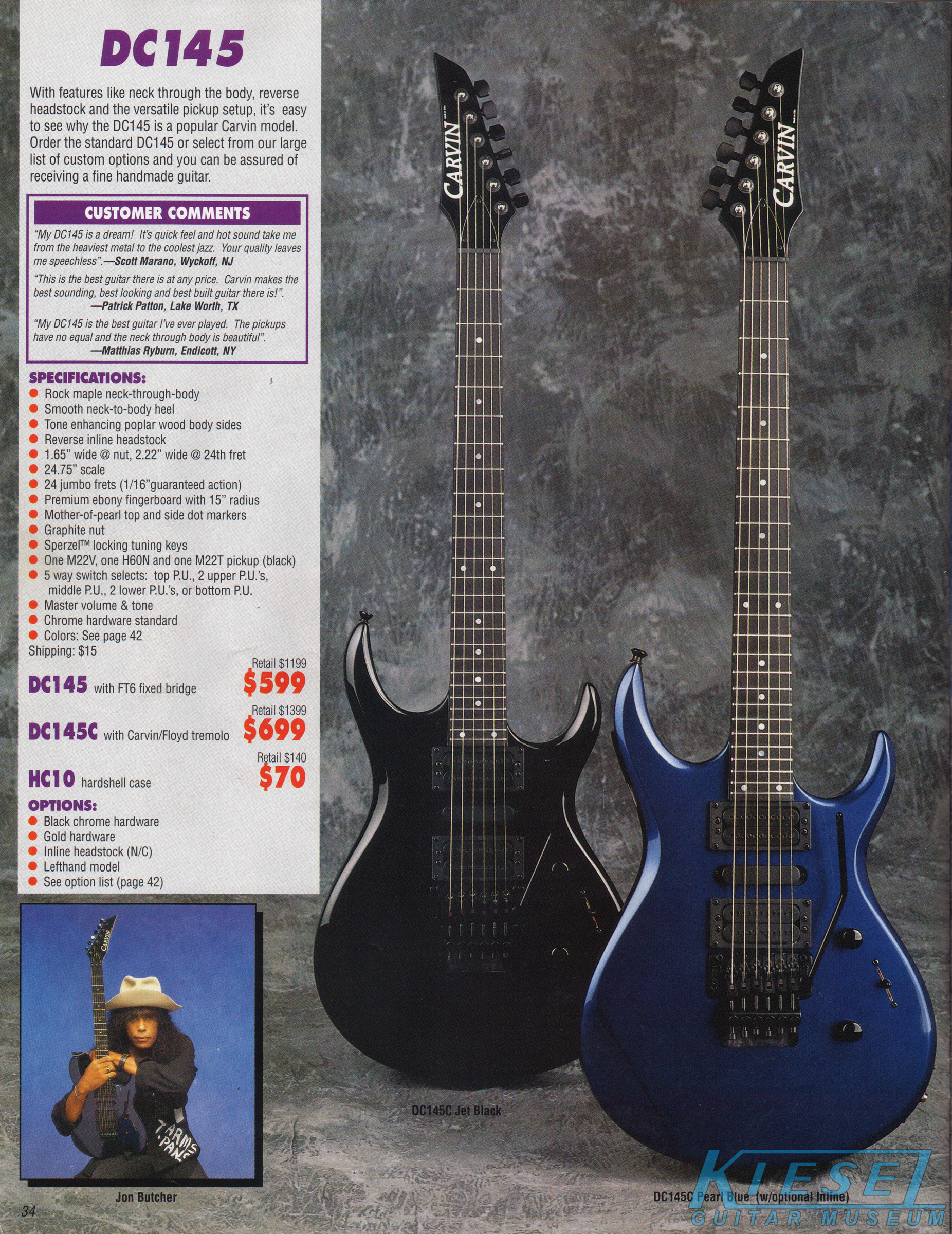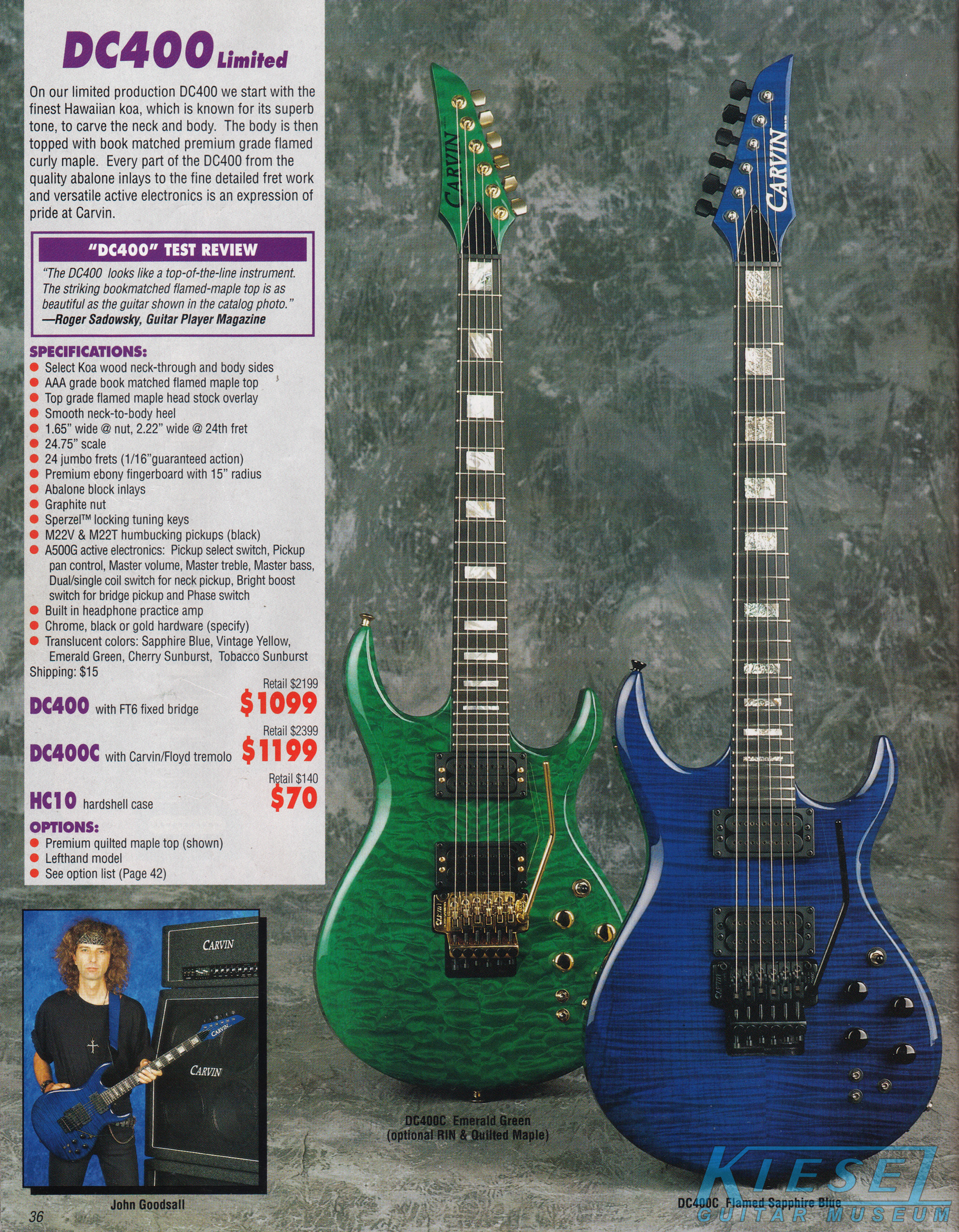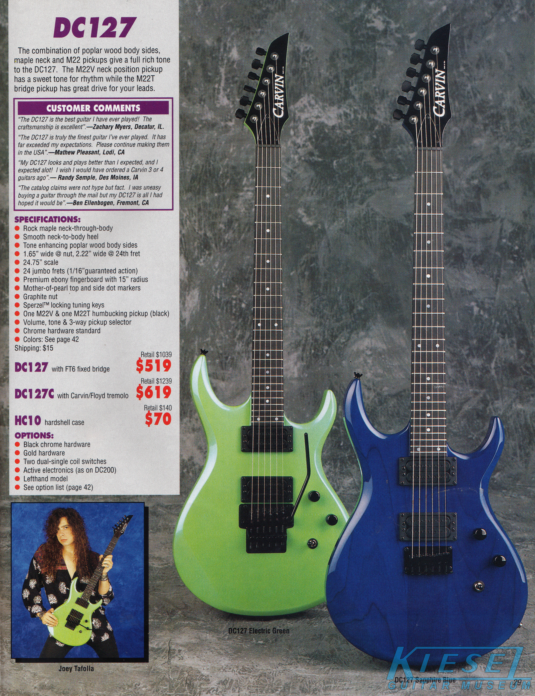 Except for the new headstock and FT6 bridge, the DC127 was unchanged from 1991, although the M22N pickup was replaced with the new M22V. The DC127 remained priced at $519, or $619 with tremolo. The catalog showed a DC127 in Electric Green with black hardware and Carvin Floyd Rose tremolo, and one in Sapphire Blue with black hardware and FT6 fixed bridge.