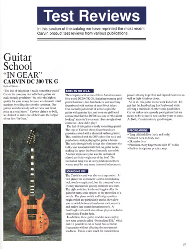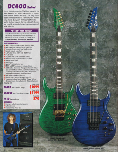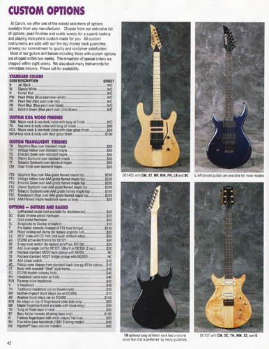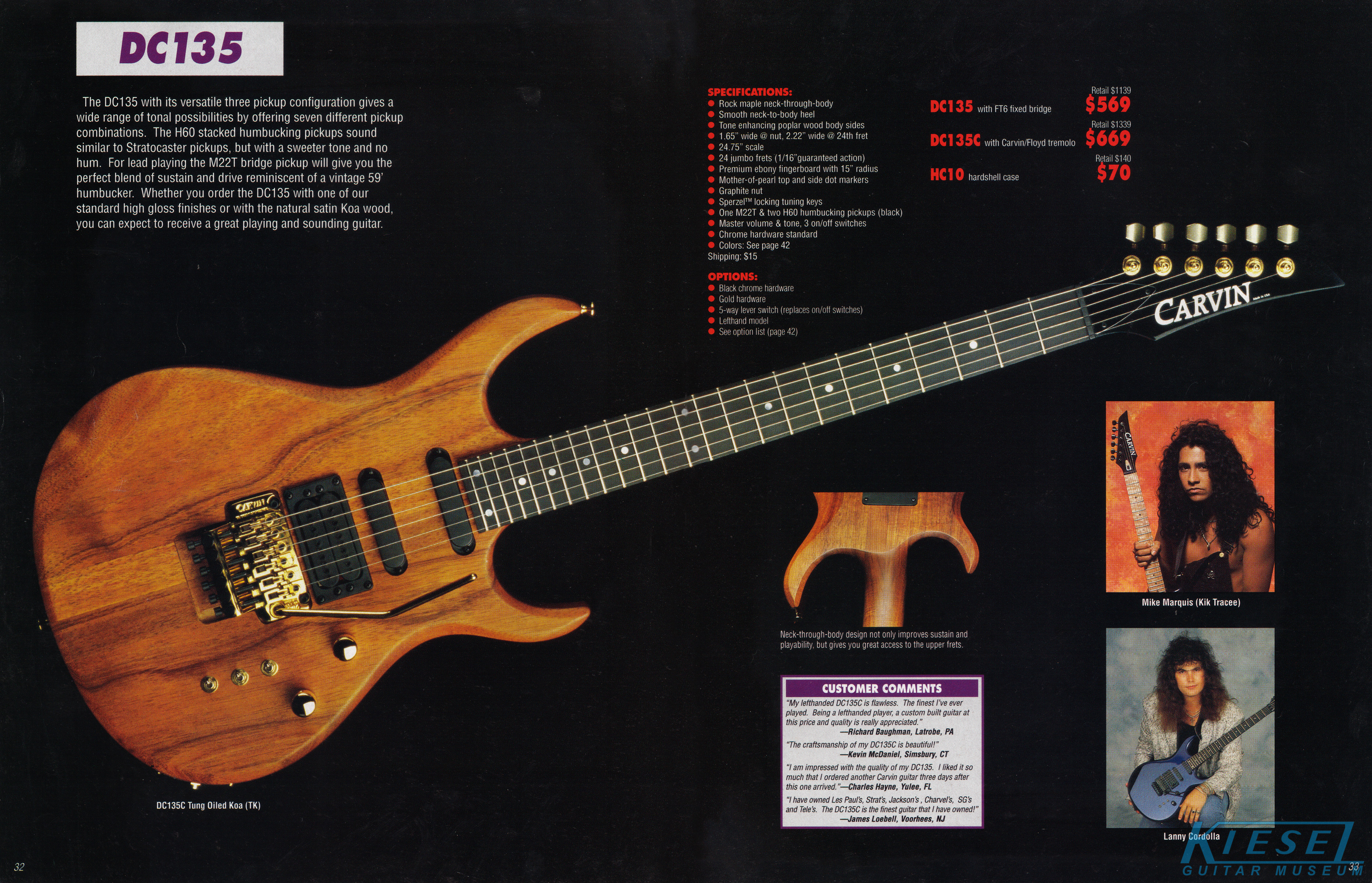 The DC135 was unchanged, using the same electronics and construction of it's predecessor. The base price of the DC135 held at $569, or $669 with tremolo. The catalog photo showed a DC135 with tung-oiled koa neck & body, Carvin-licensed Floyd Rose tremolo, and gold hardware.