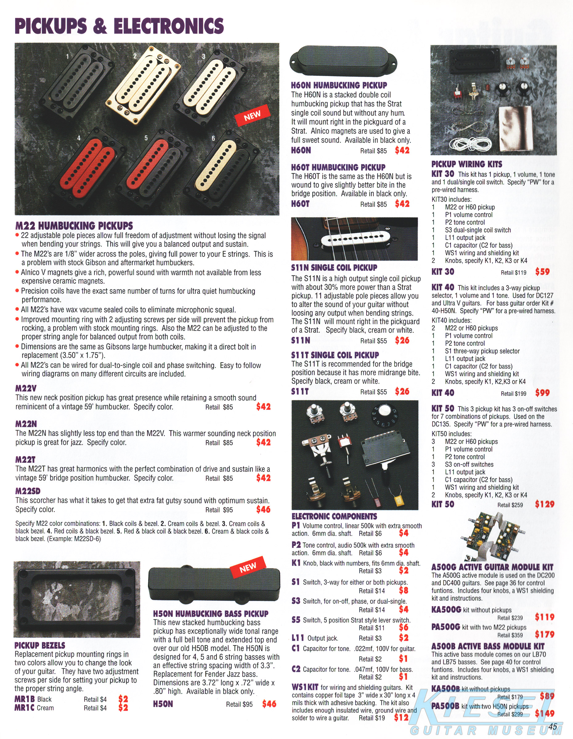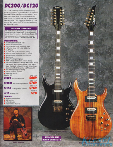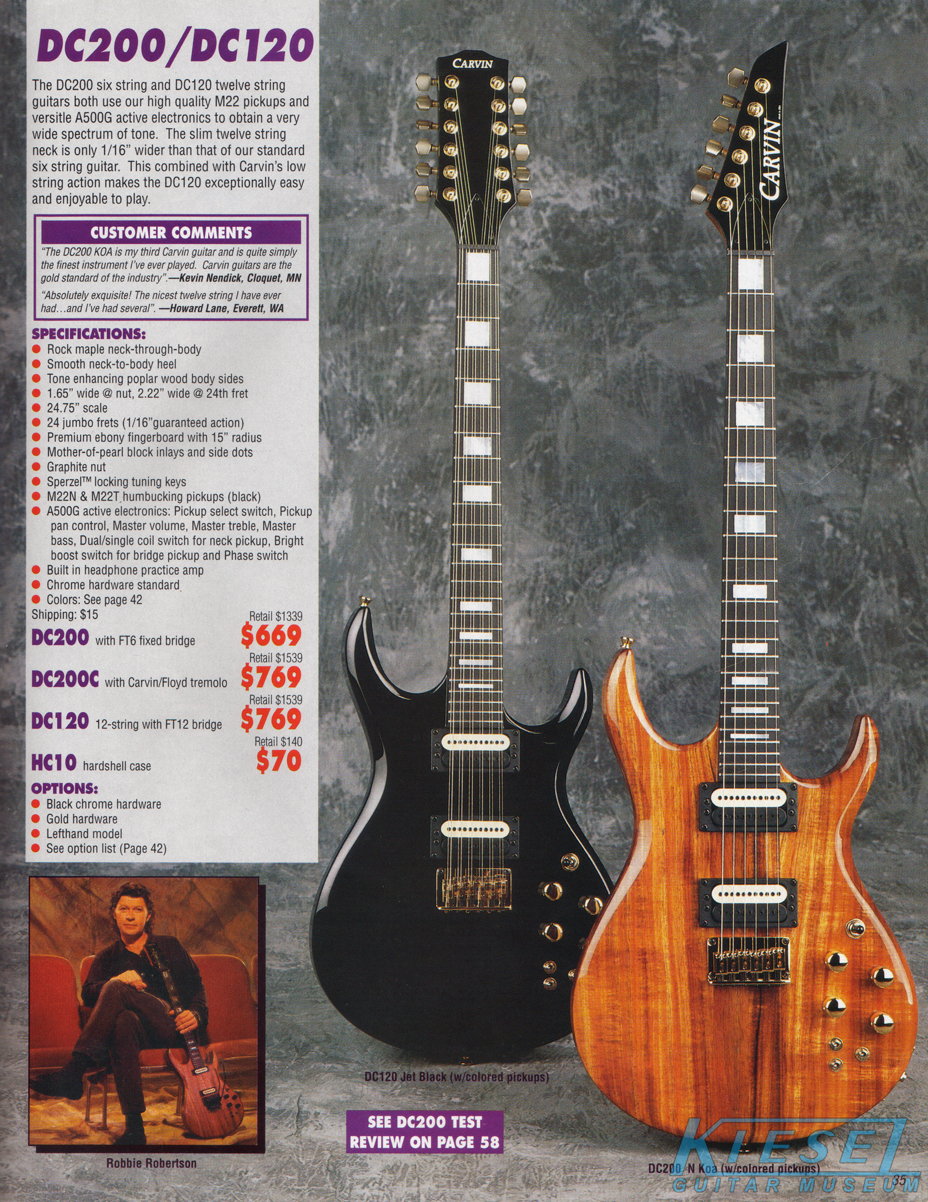 The DC200, DC120 12-string and DC400 were essentially the same as 1991, although the DC400 got the new M22V pickup in the neck position, and an M22T in the bridge position. Base price on the DC200 was still $669 ($769 with tremolo), and the DC120 rose slightly to $769. The DC400 dropped to $1099 ($1199 with tremolo). The catalog showed the DC120 in black with gold hardware, DC200 in gloss koa with gold hardware, and the DC400 was shown in Emerald Green on quilted maple with tremolo, reverse headstock and gold hardware, and flamed Sapphire Blue with tremolo and black hardware.