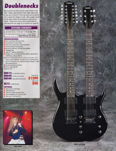 The DN612 6/12 string doubleneck and the DN640 4-string bass/6-string guitar doubleneck (not shown in the catalog) were unchanged from 1991, but the 12-inline headstock was dropped as an option. Traditional headstocks were standard, but 6-string inline headstocks, as well as 4-string bass inline headstocks, were offered. As in previous years, only the DN612 was shown, not the DN640 or DN440 doubleneck bass. The price remained the same, at $1399 for any model, Plus $90 for the HC15 case. The DN612 shown in the catalog was Jet Black with chrome hardware.