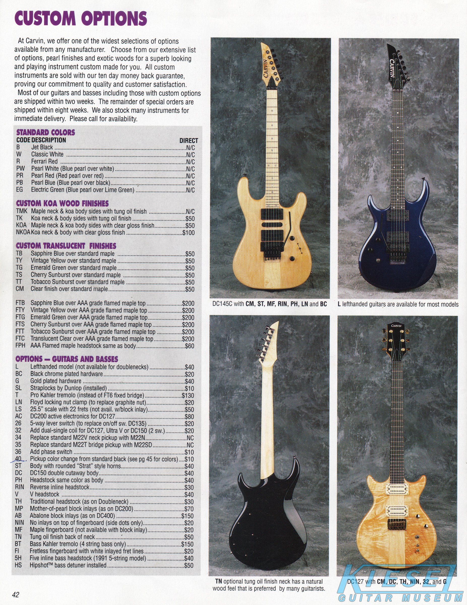 The SH body style was no longer standard on the DC145, but it was still offered as an option on any DC200-style guitar. Also, the DC150 was officially retired, but the DC150 body was offered as an option on other DC200-bodied guitars. The Kahler Pro tremolo was also offered again, and the new standard bridge was the FT6 fixed bridge. The addition of Sperzel locking tuners meant that a locking nut was no longer needed on guitars equipped with tremolos, but it could still be ordered as an option. Sperzels were available in gold, black and chrome, and could also be purchased separately. Also in 1992, quilted maple tops were added to the available list of wood options. This one feature would prove to be one of the most popular optional items Carvin would offer during this era. In addition to the M22N, M22T and M22SD, a new pickup was added for 1992, the M22V. This pickup was designed for the neck position, and had a sound similar to a '59 PAF. Red pickup bobbins were also offered for the first time.
