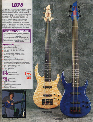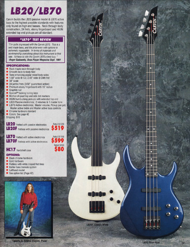 As in previous years, and year to come, the LB20 and LB70 were basically the same instrument, with the LB20 being a passive bass and the LB70 being active. These models, with their now-expanding features and options, remained the same as '91. Base price on the LB20 was $519, and the LB70 was $599 - both of which were the same as '91. The HC17 hardshell case was $80. The catalog photo showed an LB20F in Classic White with black hardware, and an LB20 in Pearl Blue with chrome hardware.