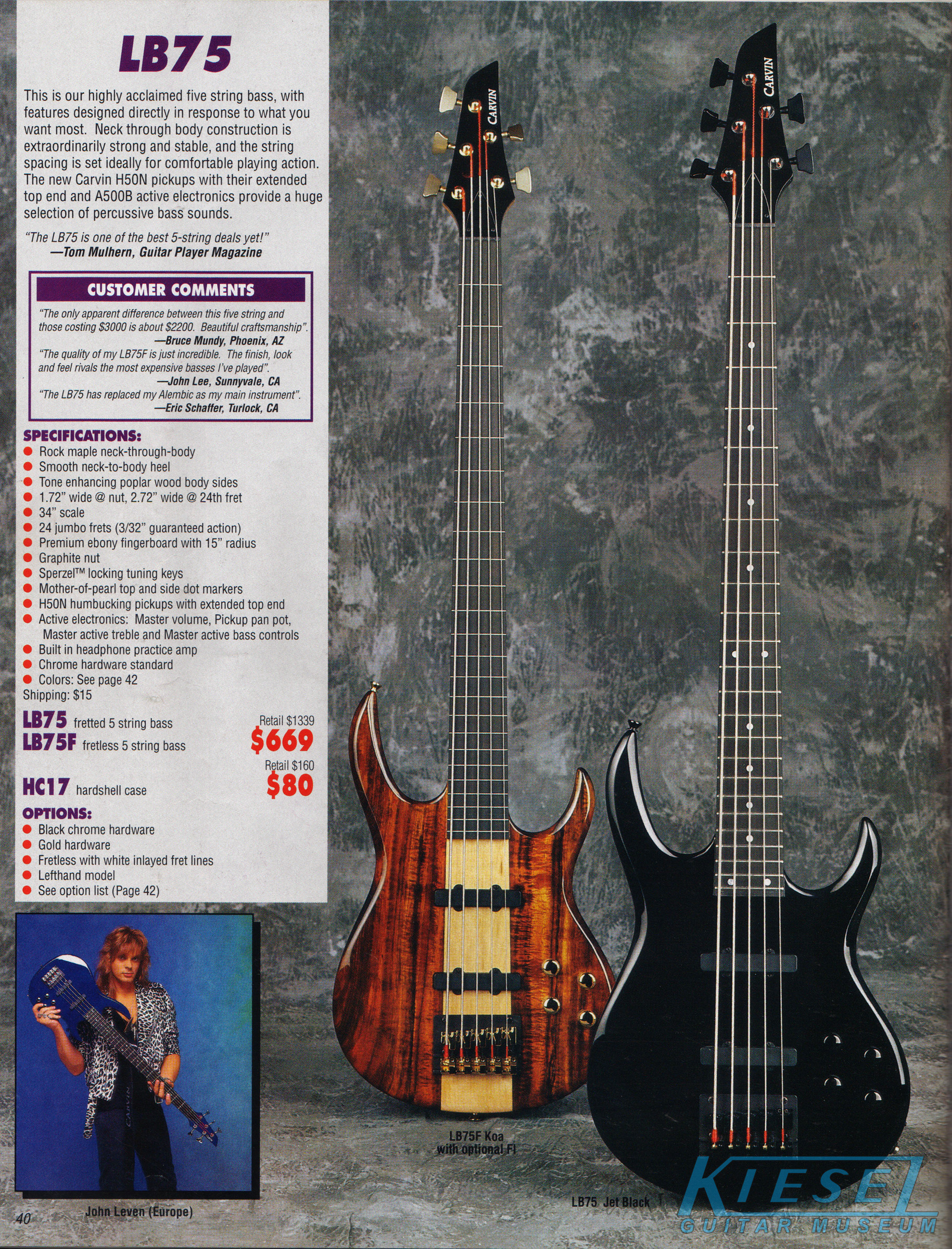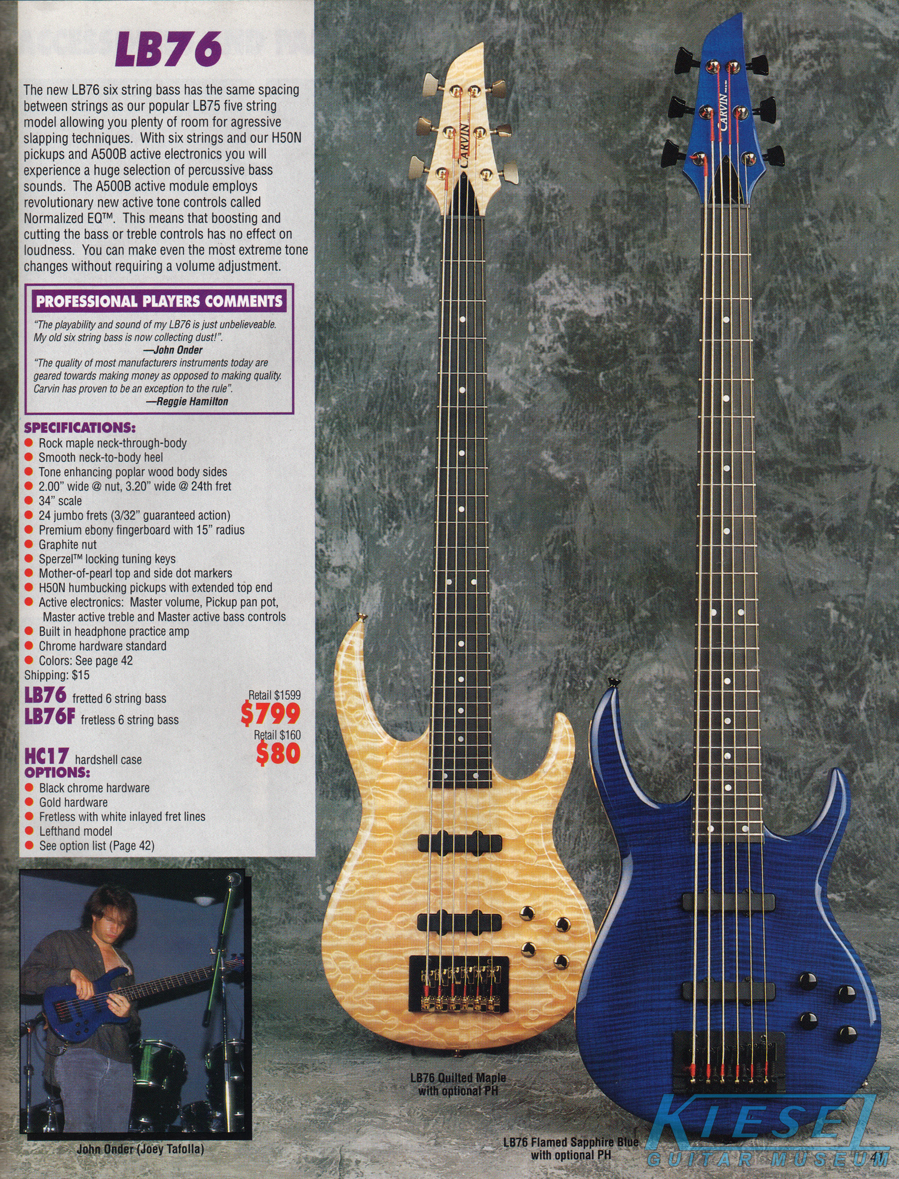 1992 would see a completely new model added to the line up. This was the LB76, Carvin's first 6-string bass. This featured the same string spacing as the LB75, making the transition from 5 strings to 6 relatively easy. This was the first Carvin bass to show a quilted maple top, versus the AAA flamed maple tops that had been shown in previous years. Interestingly, quilted maple was not listed in the available options in the '92 catalog. The base price of the LB76 was $799, and it was available with all the options of Carvin's other basses, including lefty and fretless versions. The catalog showed an LB76 in clear quilted maple with gold hardware and matching headstock, and an LB76 in Sapphire Blue on flamed maple with black hardware and matching headstock.