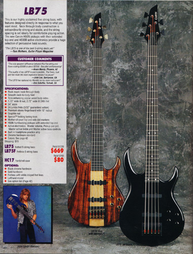 1992 basses would also see Sperzel locking tuners replace the Carvin-brand tuners that had been in use for several years, and a new headstock design, which allowed for straighter string pull, and was less Jackson-seque. The H50B pickups were replaced with the new H50N, which provided a fuller tone and extended top end. 1992 was also the first year for tyhe LB76 6-string bass; a natural progression from the popular LB75. Finally, a "mystery photo" would suggest things to come...