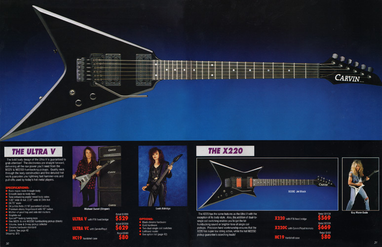 The Ultra V and X220 remained unchanged (except for the new headstocks), and was given a similar two-page spread as in 1991. The X220 also got coil splitters as a standard option for this year. This was the last full year either model would be offered, although the Ultra V would still be in the 1st quarter catalog on 1993. Base price on the Ultra V was unchanged at $529, or $629 with tremolo. The X220 was also priced the same, at $569, or $669 with tremolo. The HC19 hardshell case for either was $80.