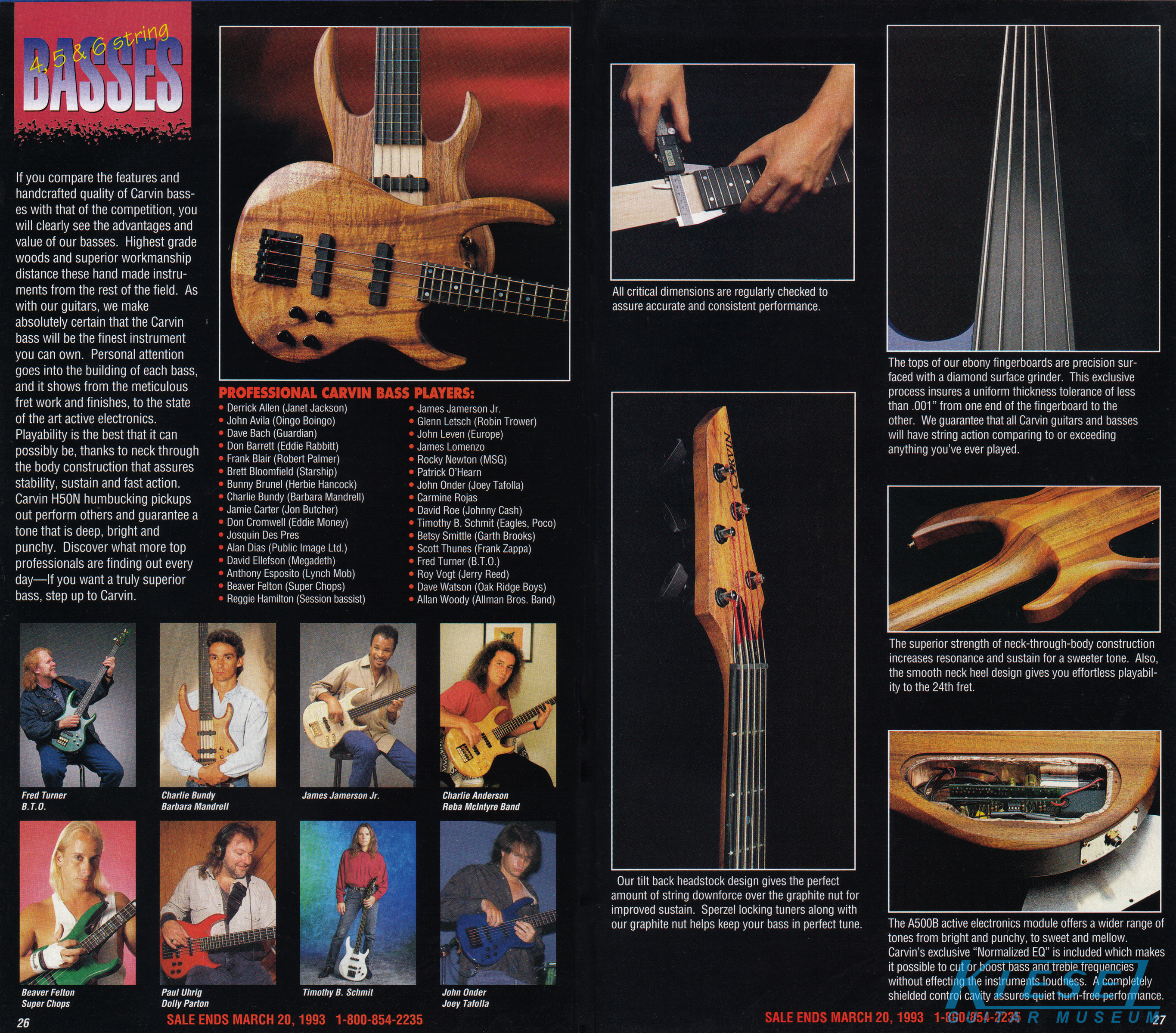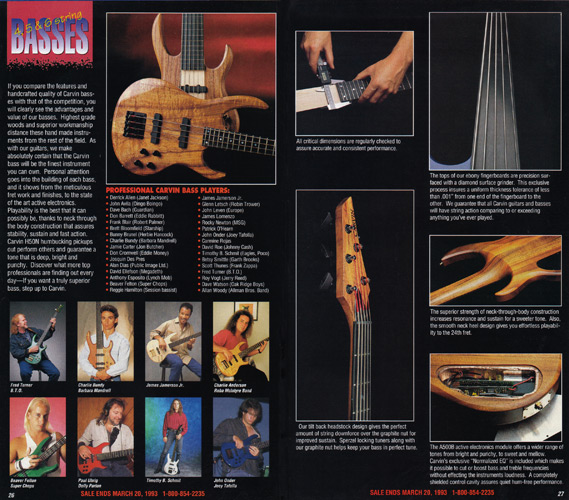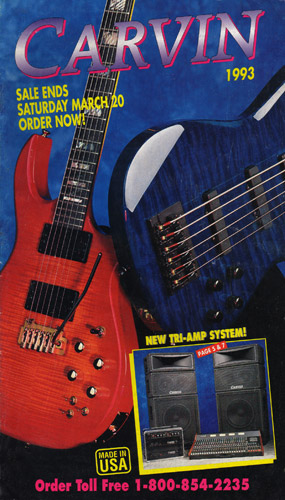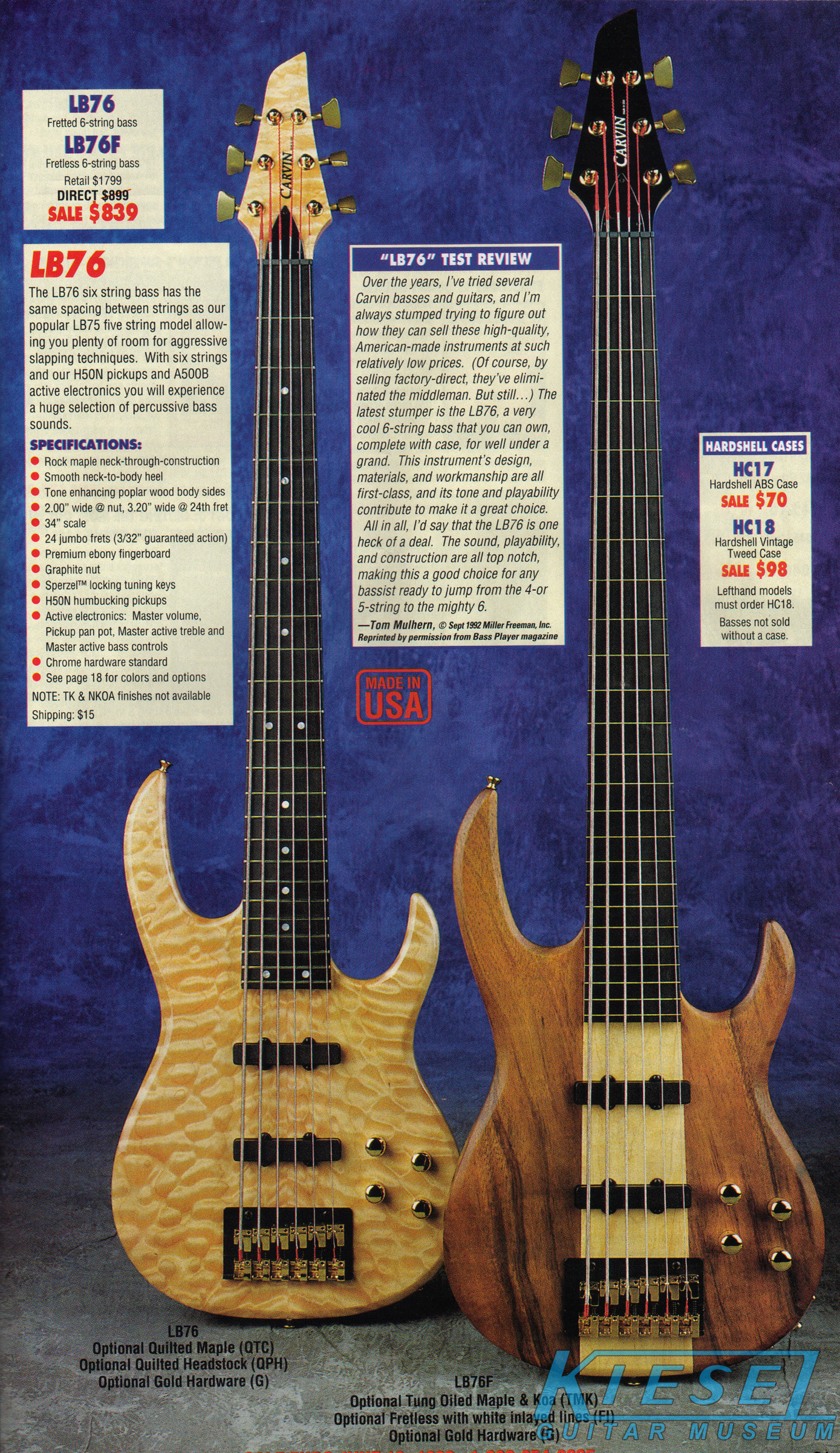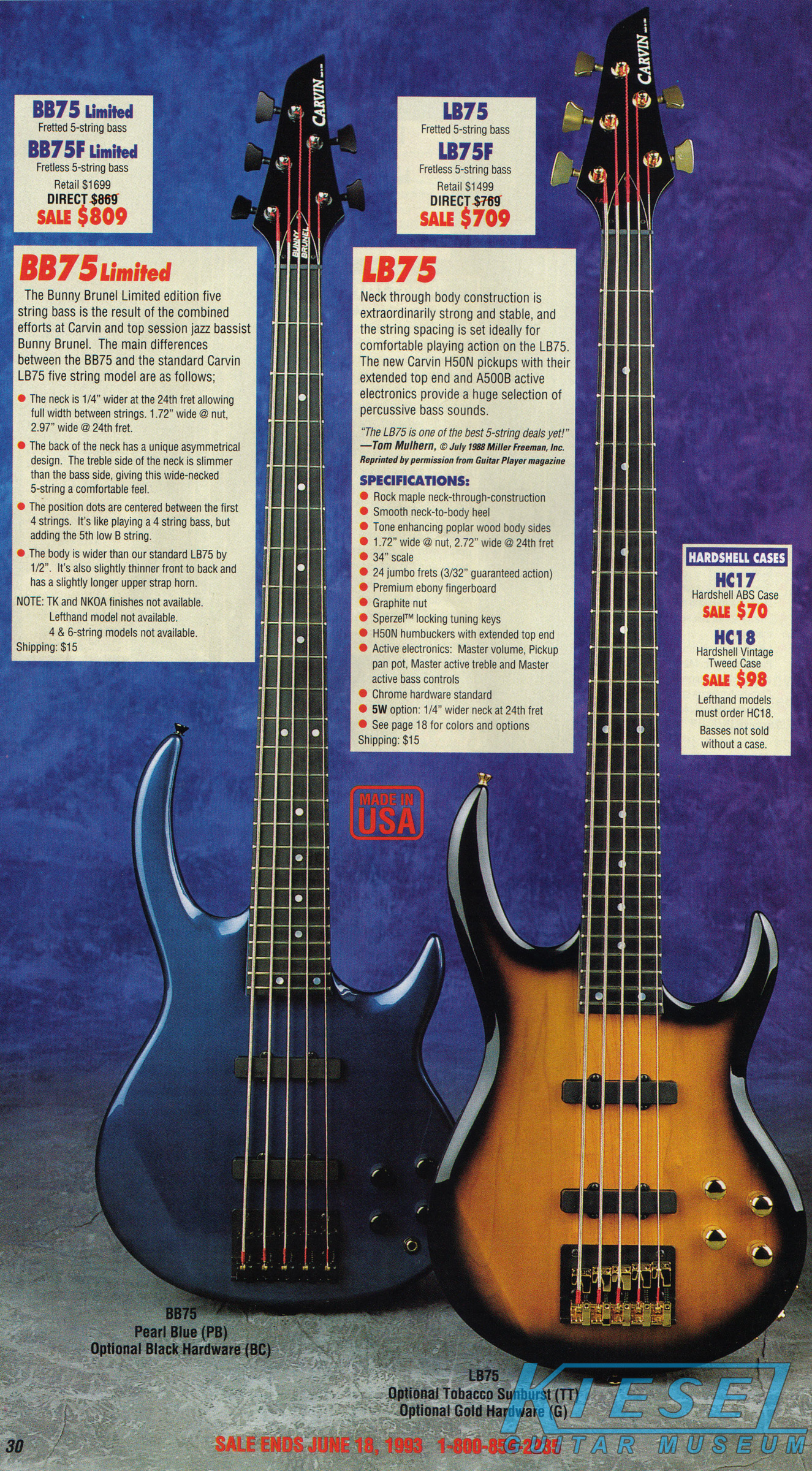 Bassists were teased in 1992 at the prospect of a new bass, the Bunny Brunel BB75, and in 1993, it would be officially introduced and featured in the catalog. This early model had a thinner body than other Carvin basses, and therefore, the output jack was located on the front of the bass, versus on the side (but would be change in the future). Additionally, the "Bunny Brunel" signature logo was not yet present, and only the engraved truss rod cover gave any indication of the signature status of this bass. It also had several unique features, including an asymmetrical neck that was thinner on the treble side, and dot inlays that were off-center, so that the dots were not directly under the A string. Base price on the BB75 was $809, and it was available with the majority of available options, but was not available in a lefty. The 5-string LB75 was unchanged from '92. It's base price was $709. Like the LB75, the 6-string LB76 saw no significant changes for 1993. Base price on the LB76 was $839.