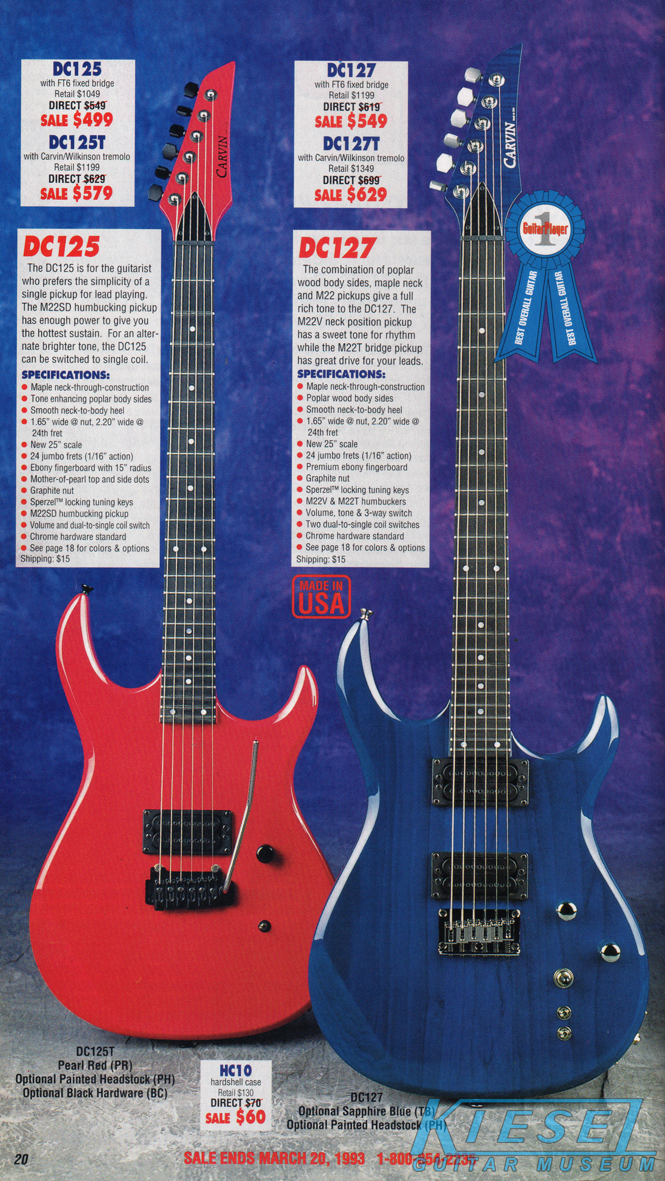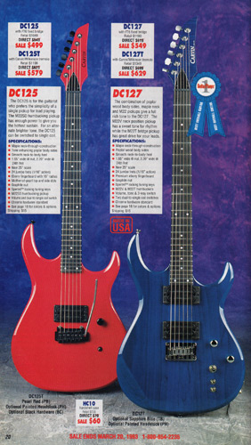 The DC125 and DC127 were basically unchanged, except for the new 25" scale length and Wilkinson tremolo. The DC125 still used the M22SD, while the DC127 continued to use the M22V and M22T. Price on the DC125 was $579, while the DC127 was $629. The catalog photo showed the DC125 in Pearl Red with black hardware, matching headstock and Wilkinson tremolo, and the DC127 in Sapphire Blue with matching headstock and chrome hardware.
