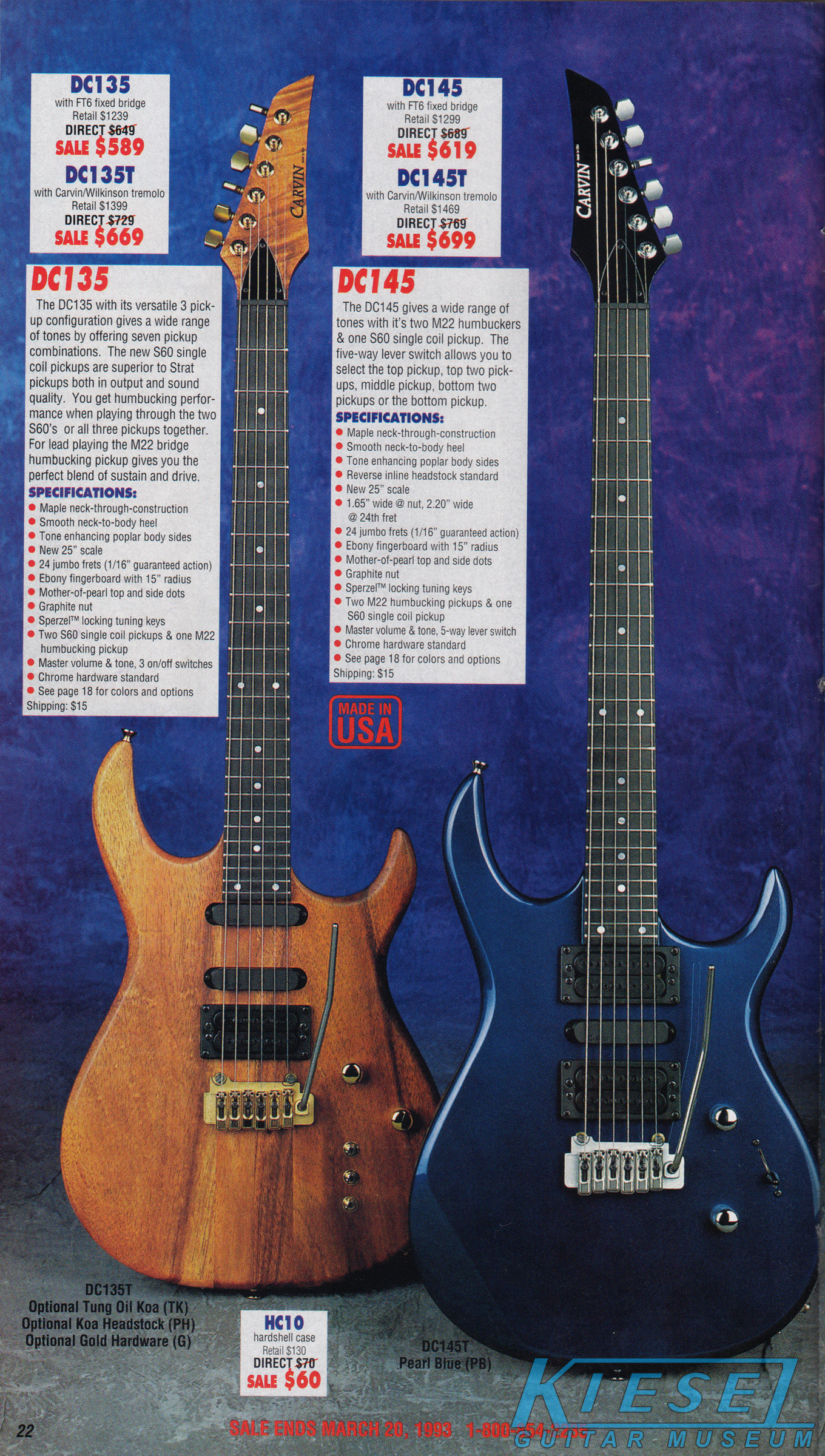 The DC135 and DC145 were the same as 1992, with the exception of the other changes mentioned above. One exception to this was the stacked humbuckers on both models - the H60N stacked humbuckers were replaced with S60 single coil pickups. The base price on the DC135 was $589, or $669 with tremolo, and the DC145 was $619, or $699 with tremolo. The DC135 was shown in tung oiled koa with gold hardware and tremolo, and the DC145 was shown in Pearl Blue with chrome hardware and tremolo.
