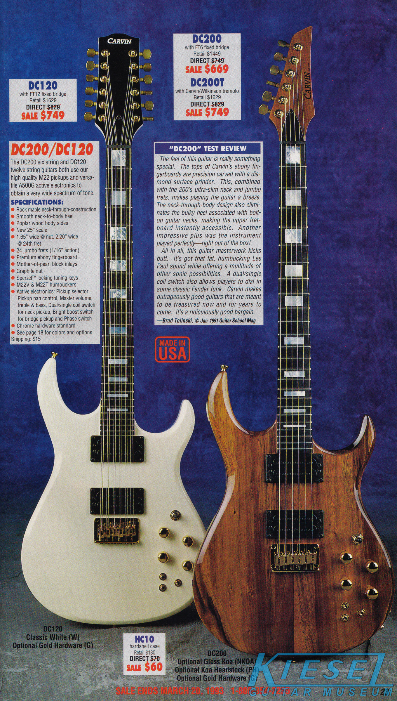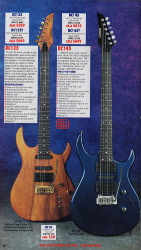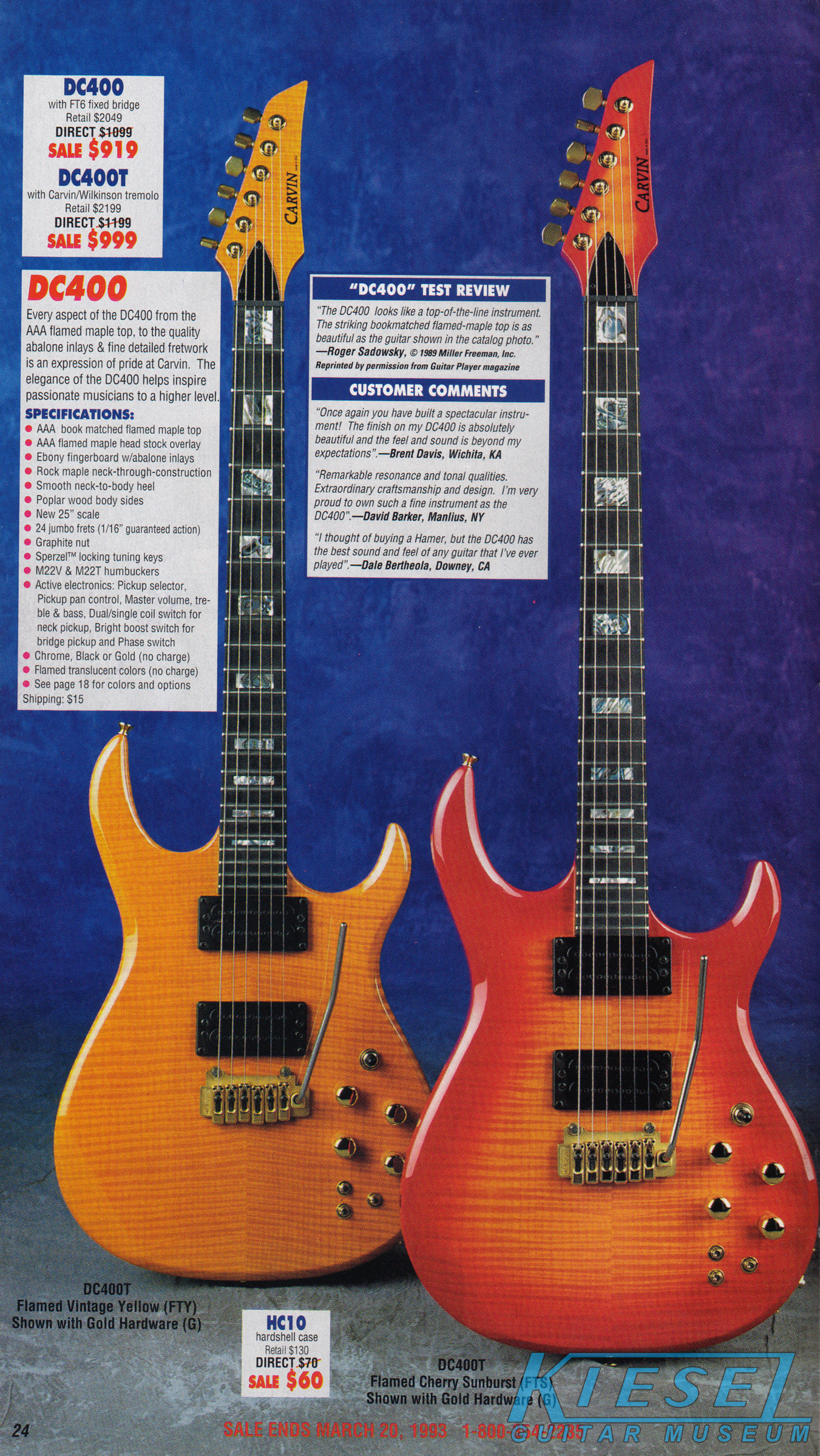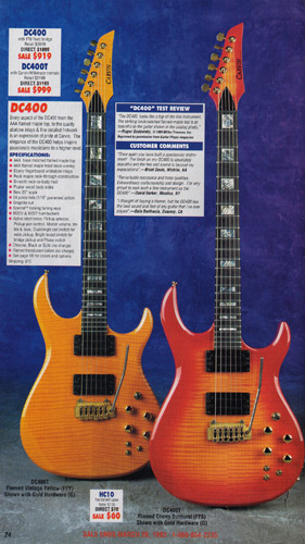 The DC400 continued to be Carvin's flagship guitar, and it enjoyed a substantial price drop, to $919 in a hardtail version, or $999 with tremolo. Part of the reason for the price drop was in part due to the fact that the body was no longer made of koa, but were made of poplar (body) and maple (neck). The catalog showed a DC400 in Vintage Yellow on flamed maple with matching headstock, Wilkinson tremolo and gold hardware, and one in Cherry Sunburst on flamed maple with matching headstock, Wilkinson tremolo and gold hardware.