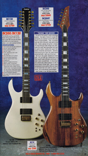 The DC120 12-string guitar and DC200 remained the same as 1992, with the exception of the new features noted elsewhere on this page. The DC120 sold for $749, while the DC200 sold for $669, or $749 with Wilkinson tremolo. The catalog photo showed the DC120 in Classic White with gold hardware, and the DC200 in clear gloss koa with matching headstock and gold hardware.
